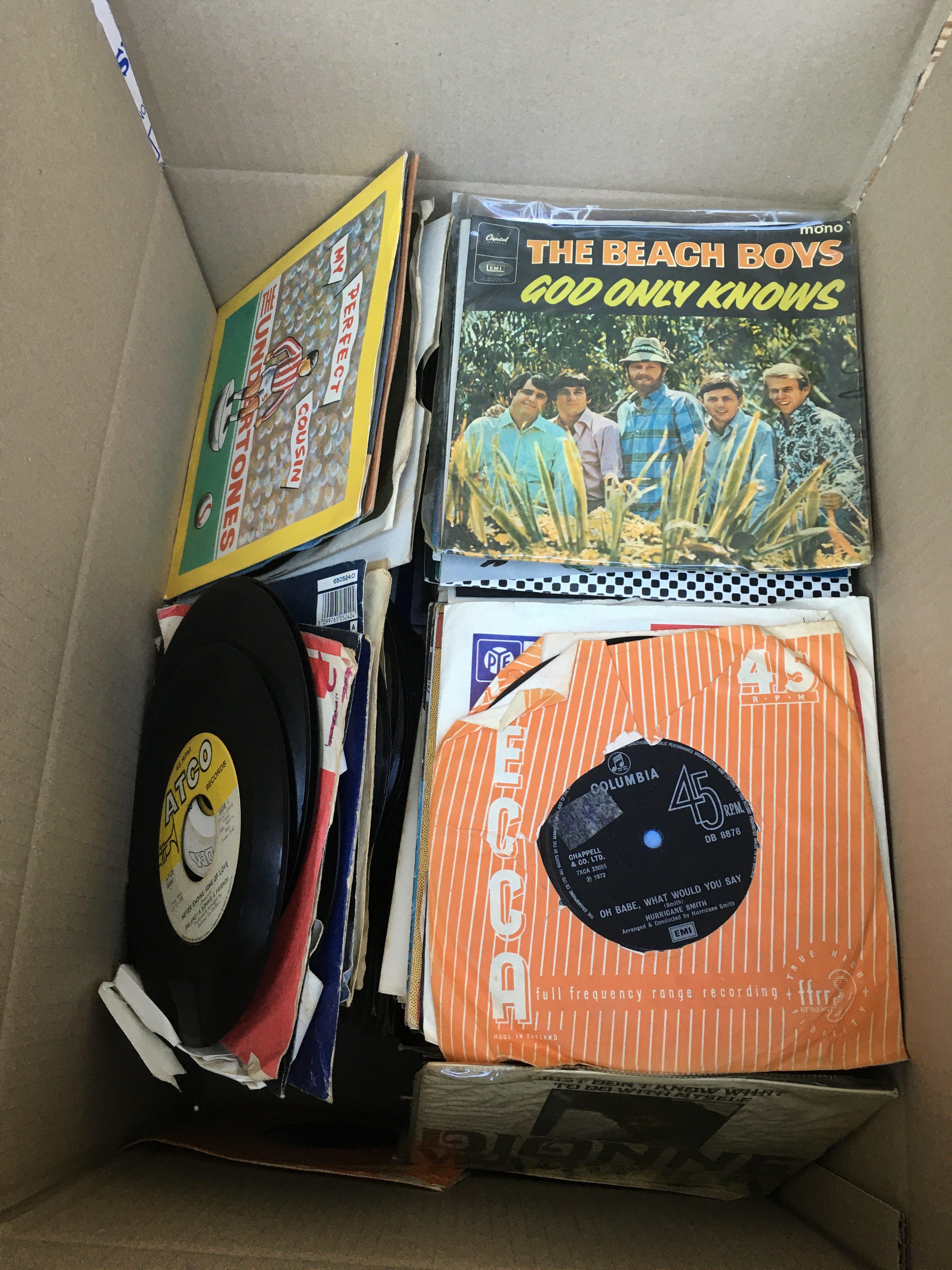 A box of 7" singles and EPs by various artists including The Beatles, Depeche Mode, The Undertones, Aztec Camera and many more.