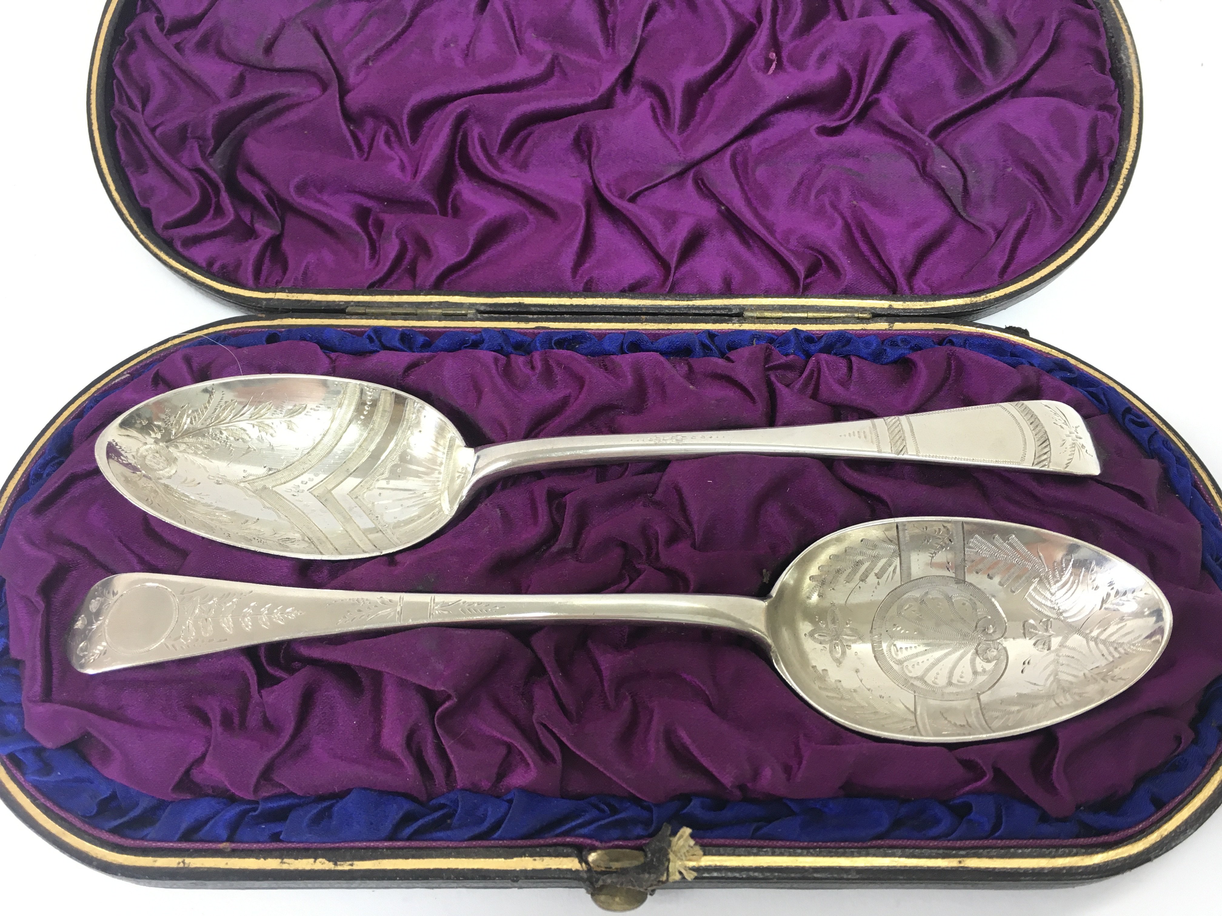 A cased pair of Exeter hallmarked silver spoons. Postage category B