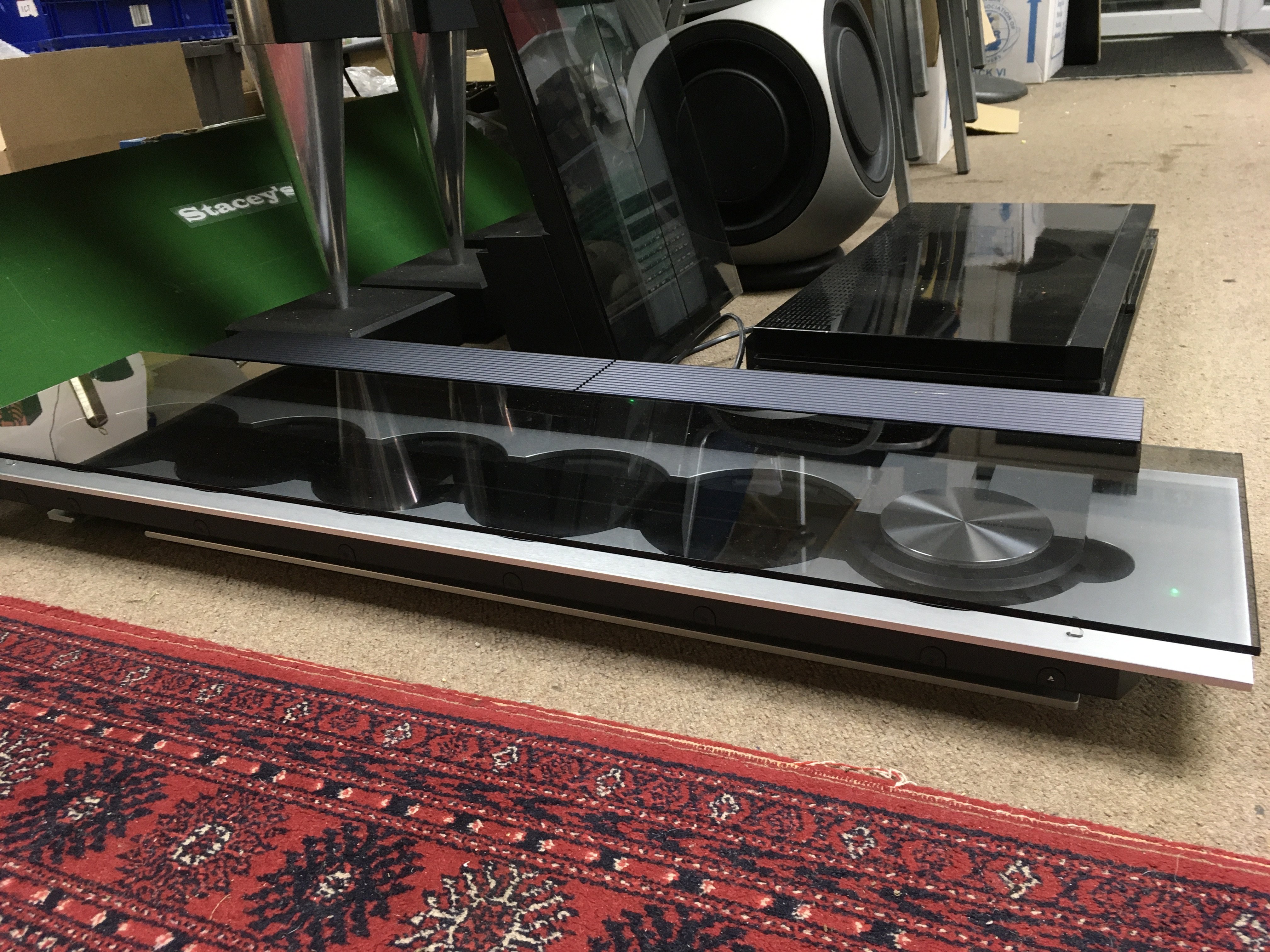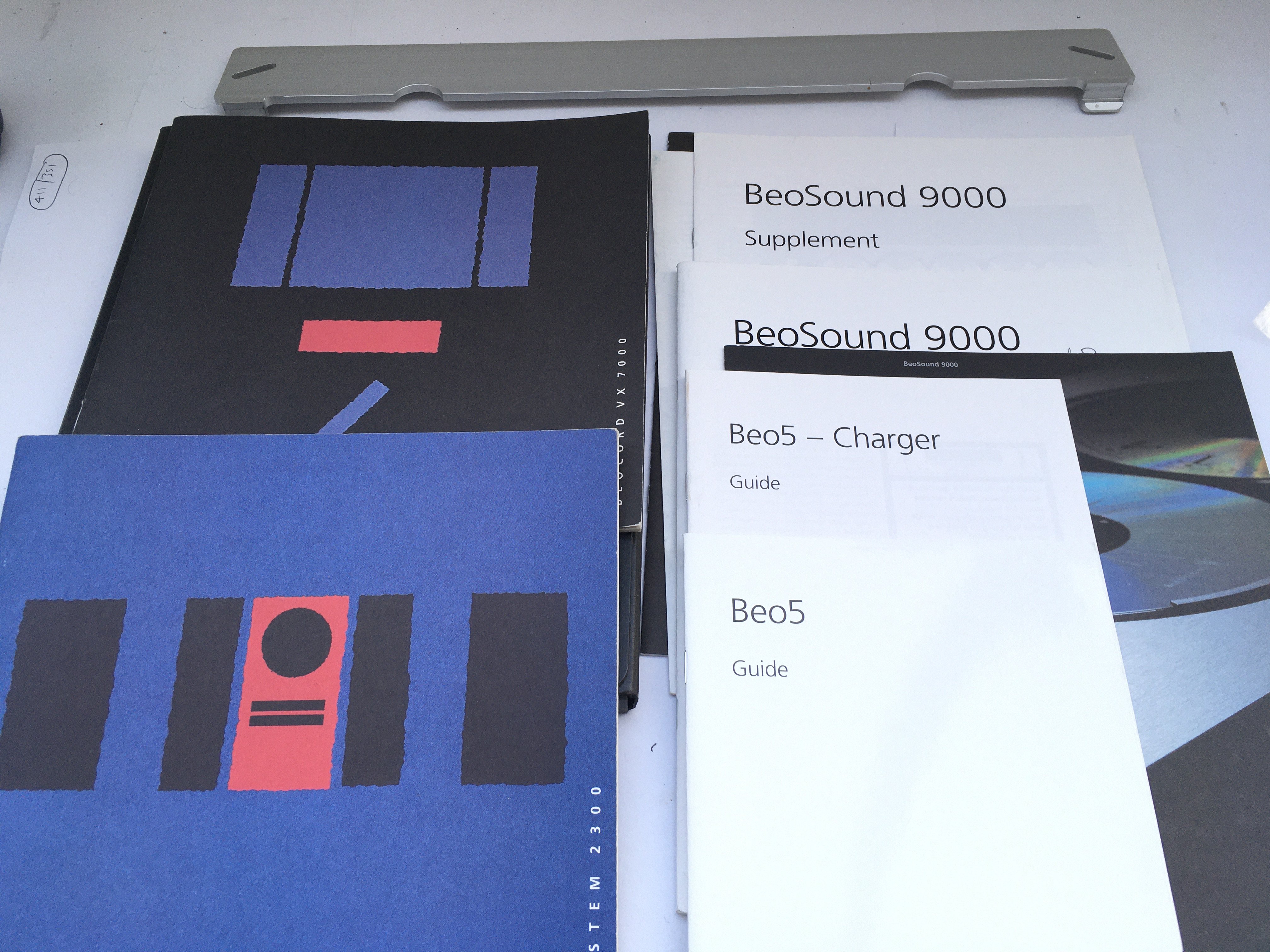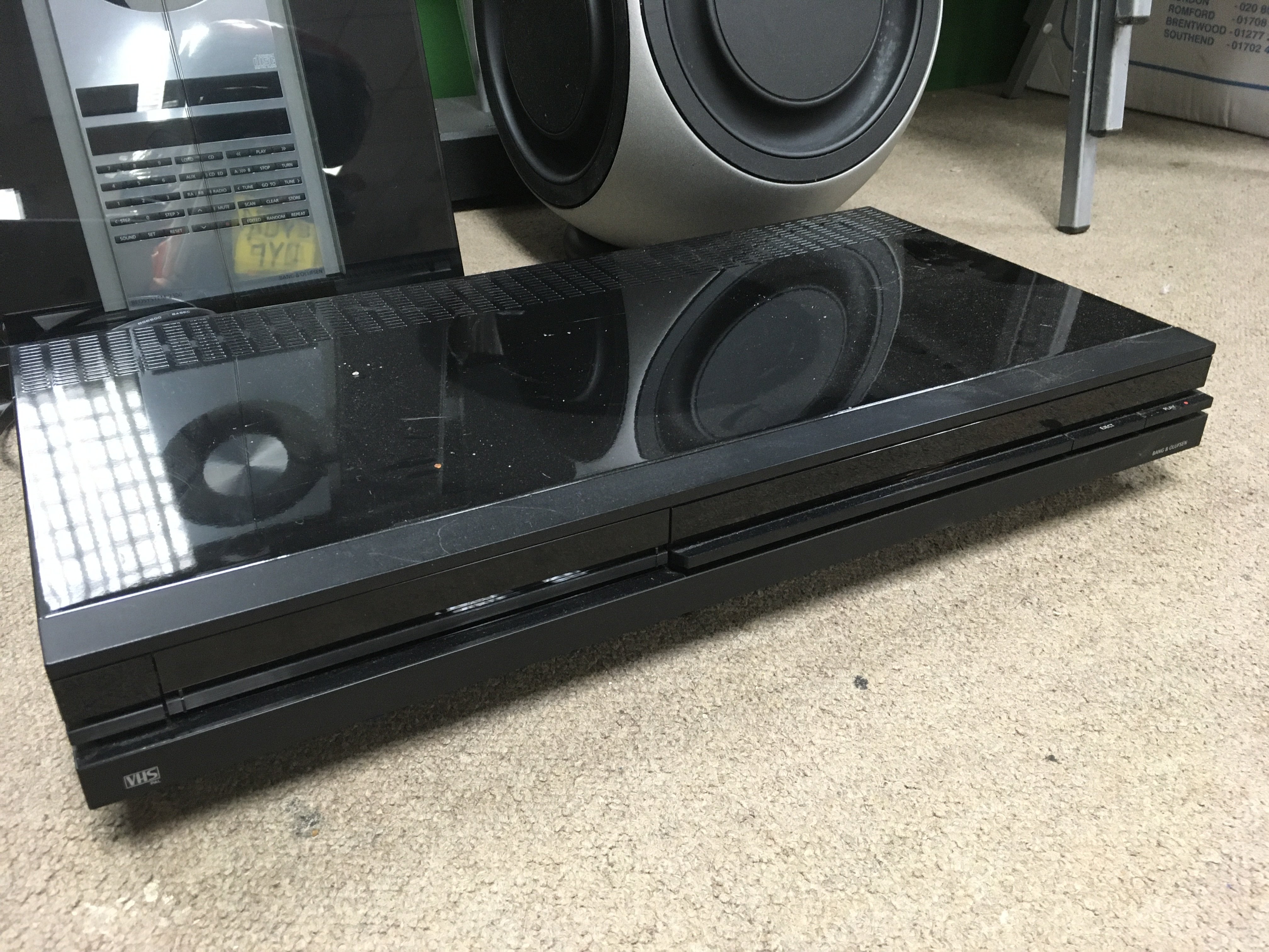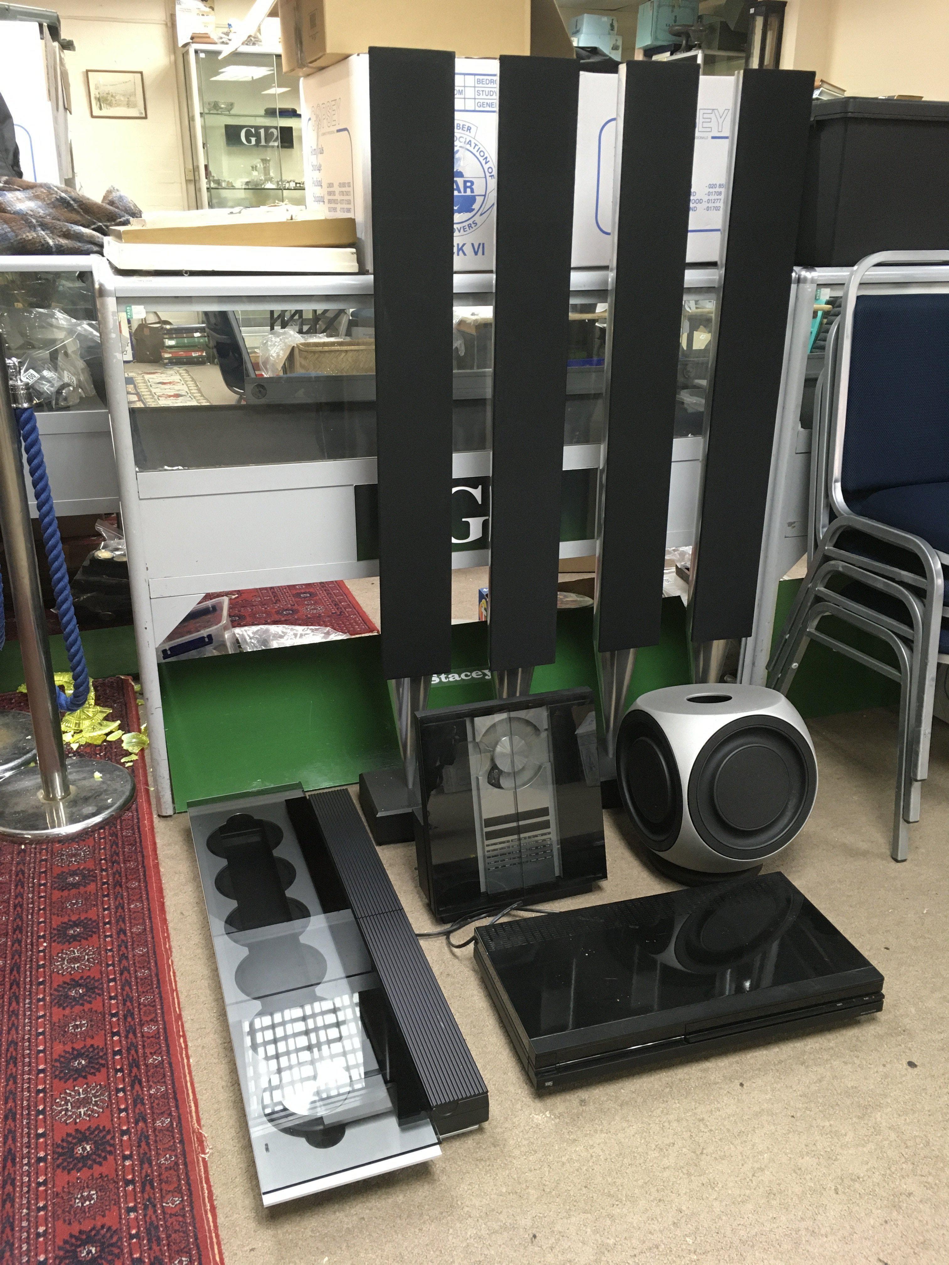 A collection of Bang & Olufsen music centre items with two pairs of speakers, sub bass speaker and manuals.