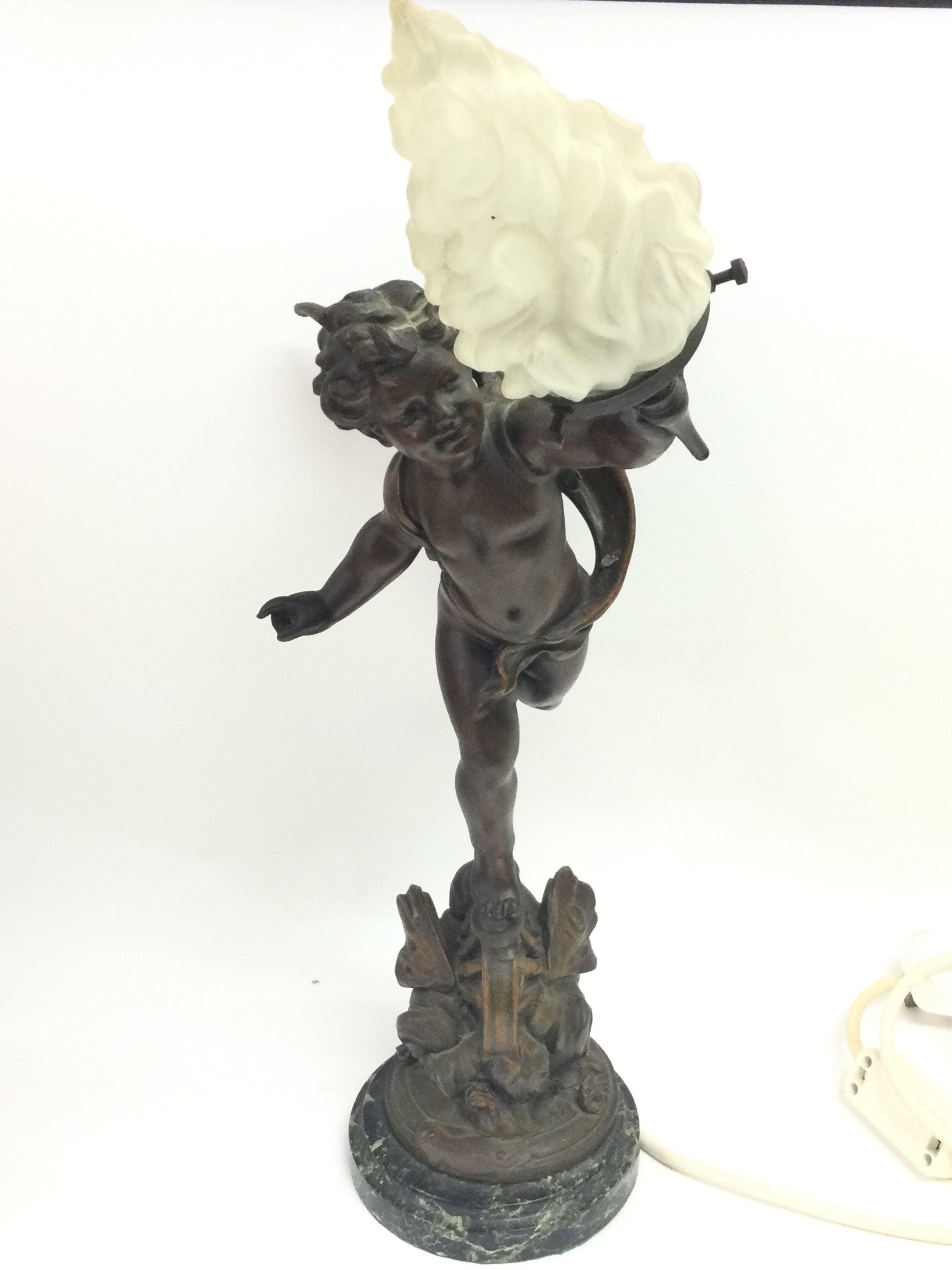 A French Cherub figure lamp with a frosted glass flame shade, L'Amour vainqueur. This lot cannot be posted