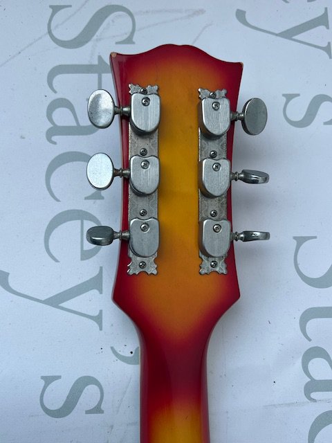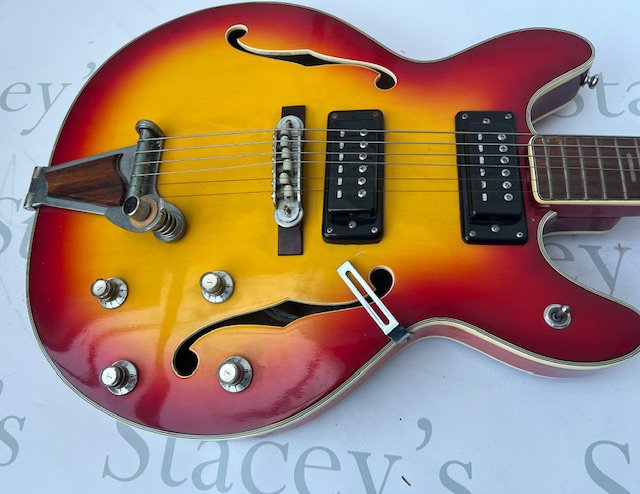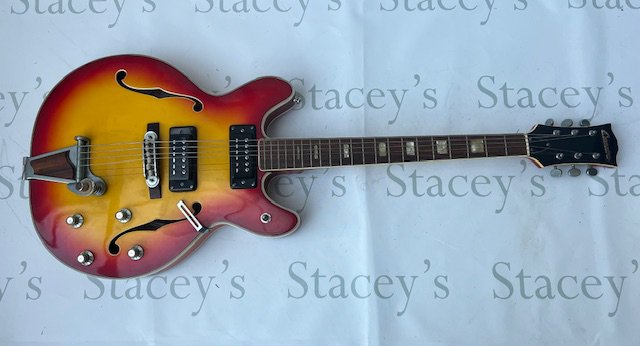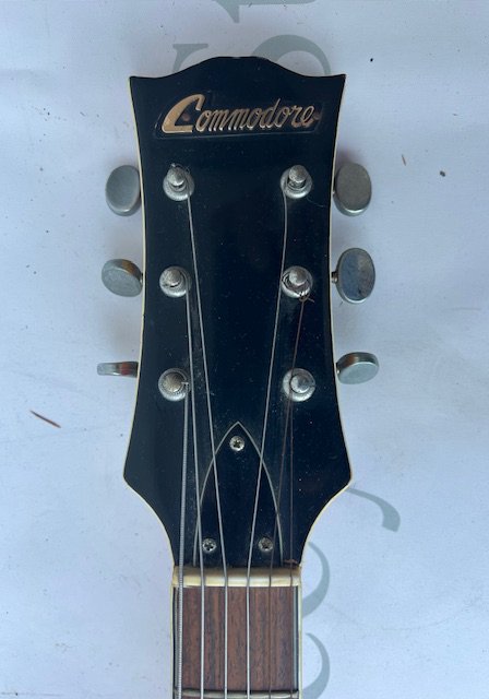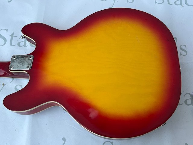 1970s Lawsuit era Commodore no. 25 semi-hollow body electric guitar, made in Japan; Body: cherry sunburst finish, minor dings and scratches crack to nut and some loss of nut on 6 string side; Neck: good;; Frets: average; Electrics: working; Hardware: generally good, missing trem arm and pick guard.