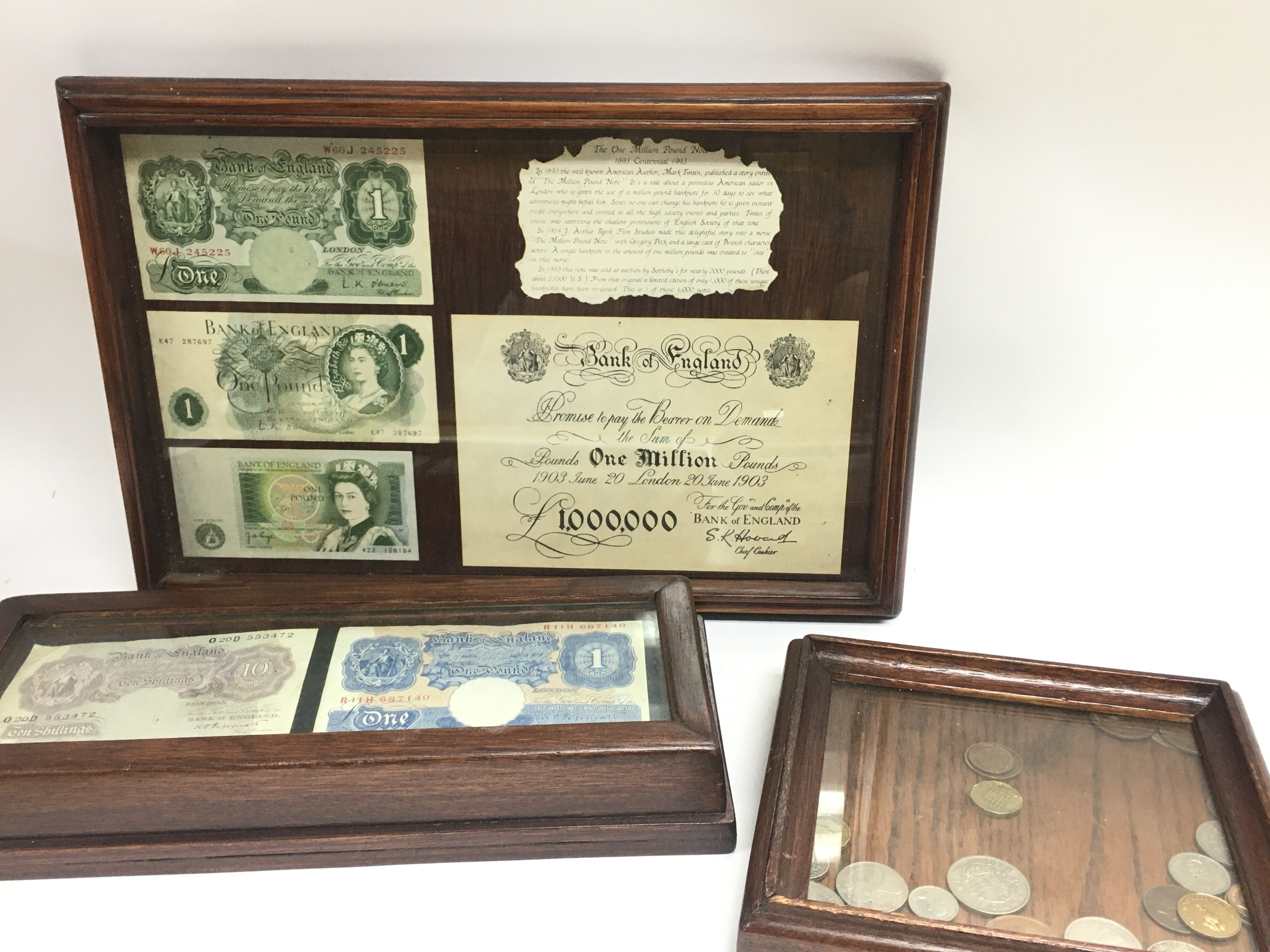 A collection of framed British coins and bank notes including one pound notes, Ten Shillings. This lot cannot be posted