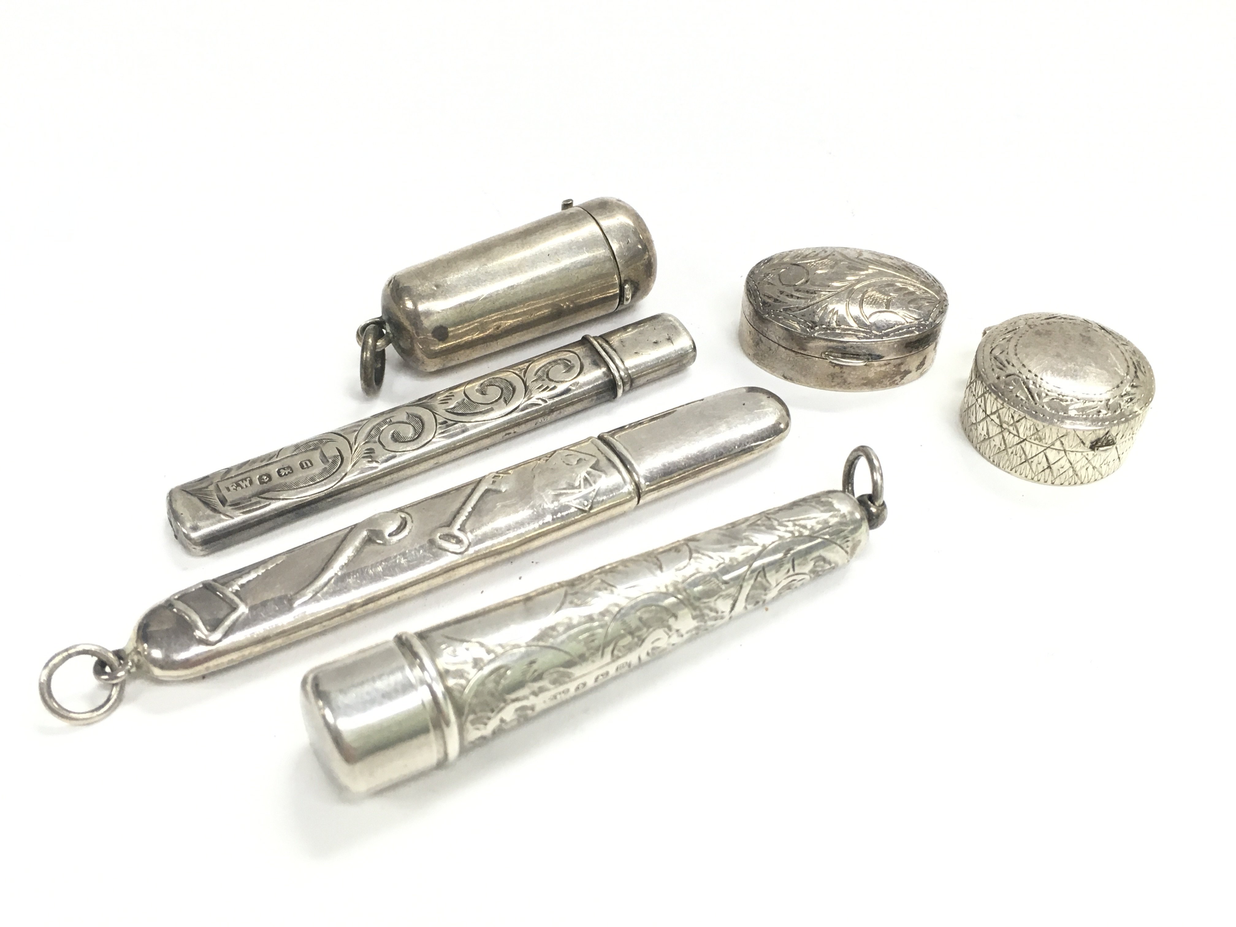 A Collection of silver items including pill boxes, pencil holders etc. postage category A