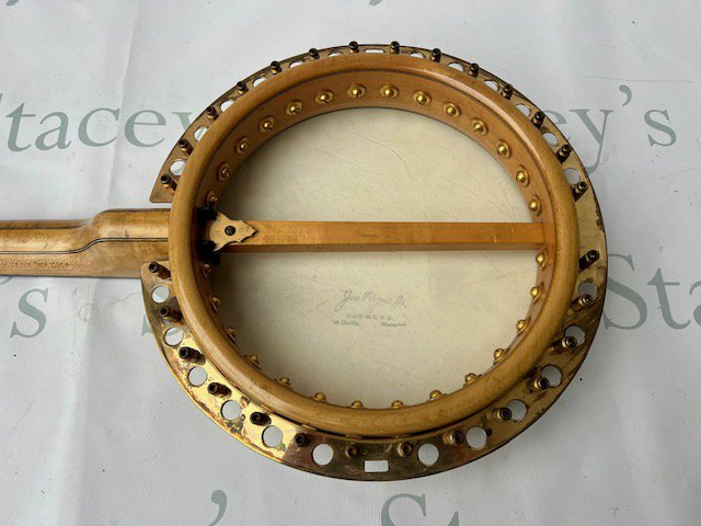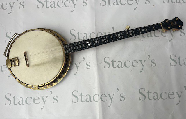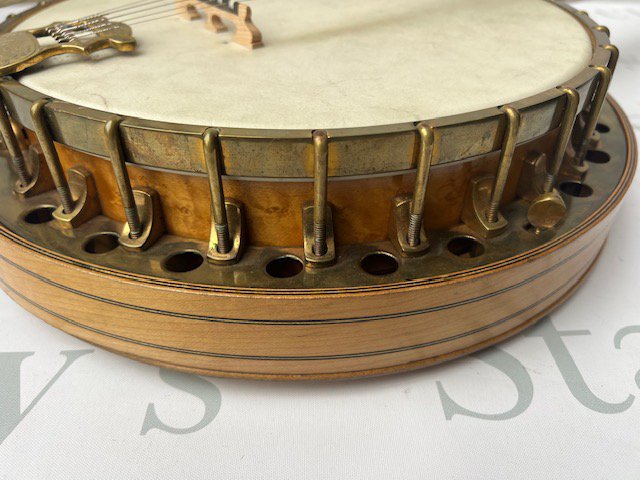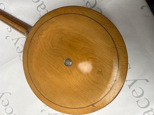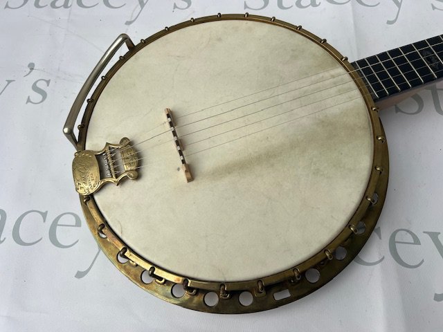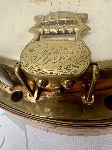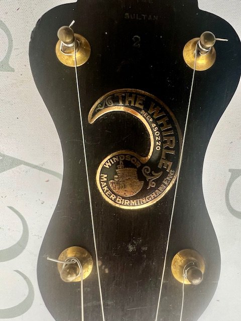 A late Victorian Windsor of Birmingham Model Number 2 Sultan "The Whirle" 5 string banjo. All Rock Maple construction with ebony fingerboard. Windsor Pyxe brass tailpiece with detailed engraving. One mother of pearl inlay missing, otherwise in particularly good condition considering its age and use. Comes with non original hard case.
