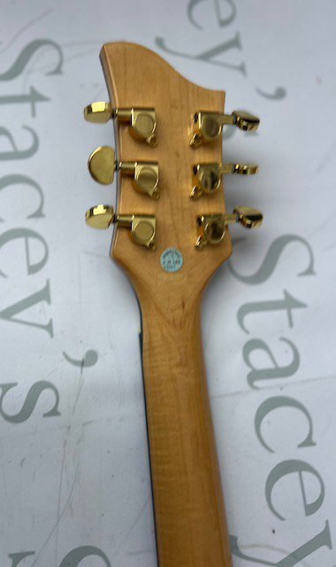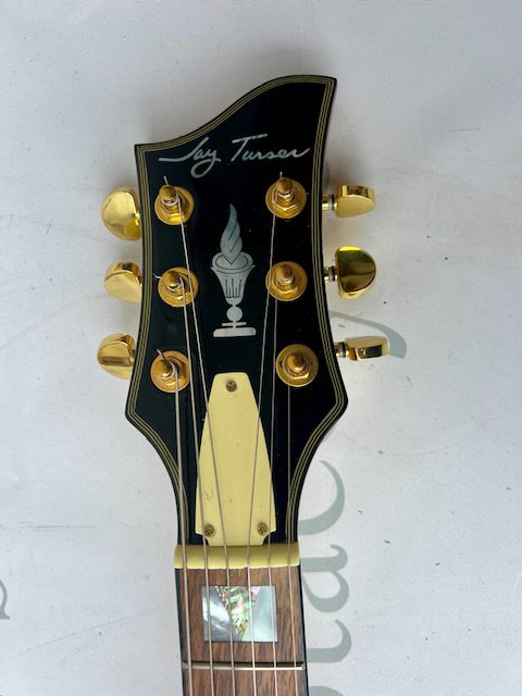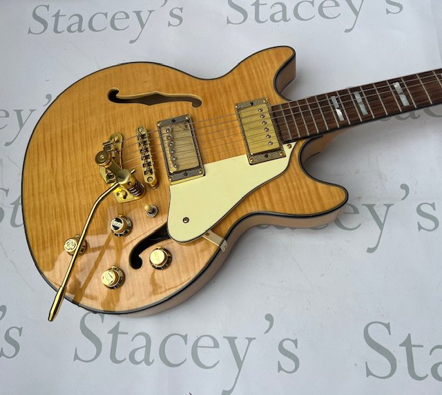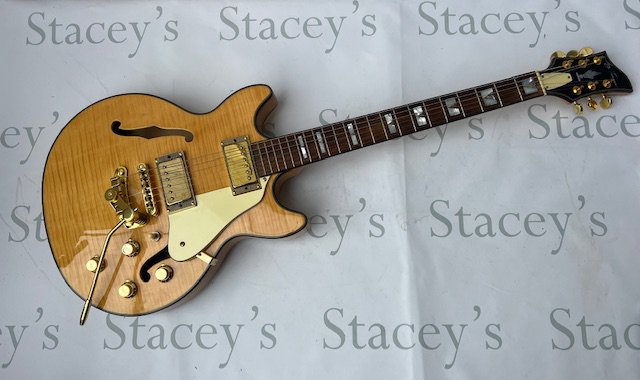 A Jay Turser Semi Acoustic ES style guitar with flame top and gold parts - very good unplayed condition throughout. No fret wear and no obvious signs of any wear, damage or restoration. Comes with non original gig bag.
