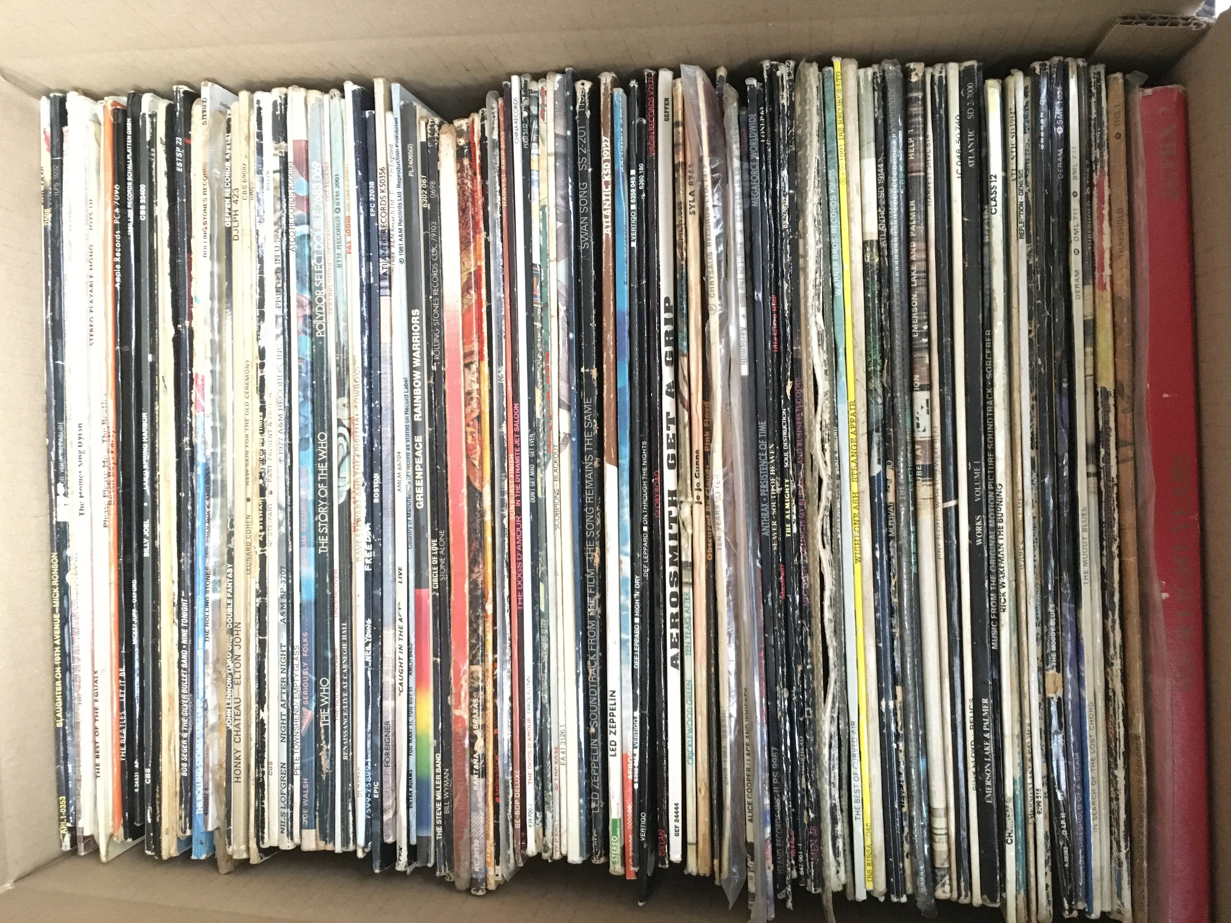 A box of LPs by various artists including Pink Floyd, Ten Years After, Led Zeppelin, Aerosmith and many more.