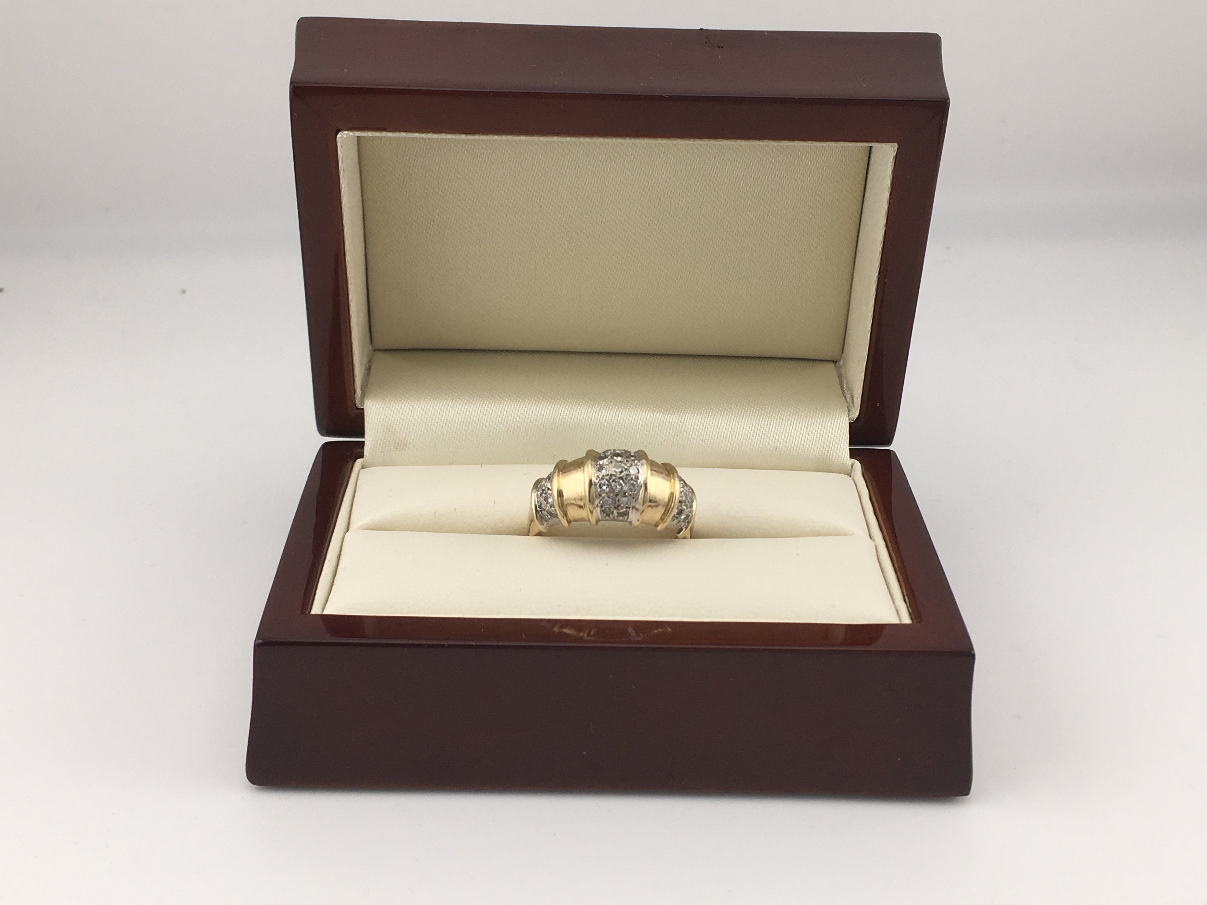 A yellow metal ring (tested 14ct) set with diamonds. Approx size S, Approx weight 6.8 grams.