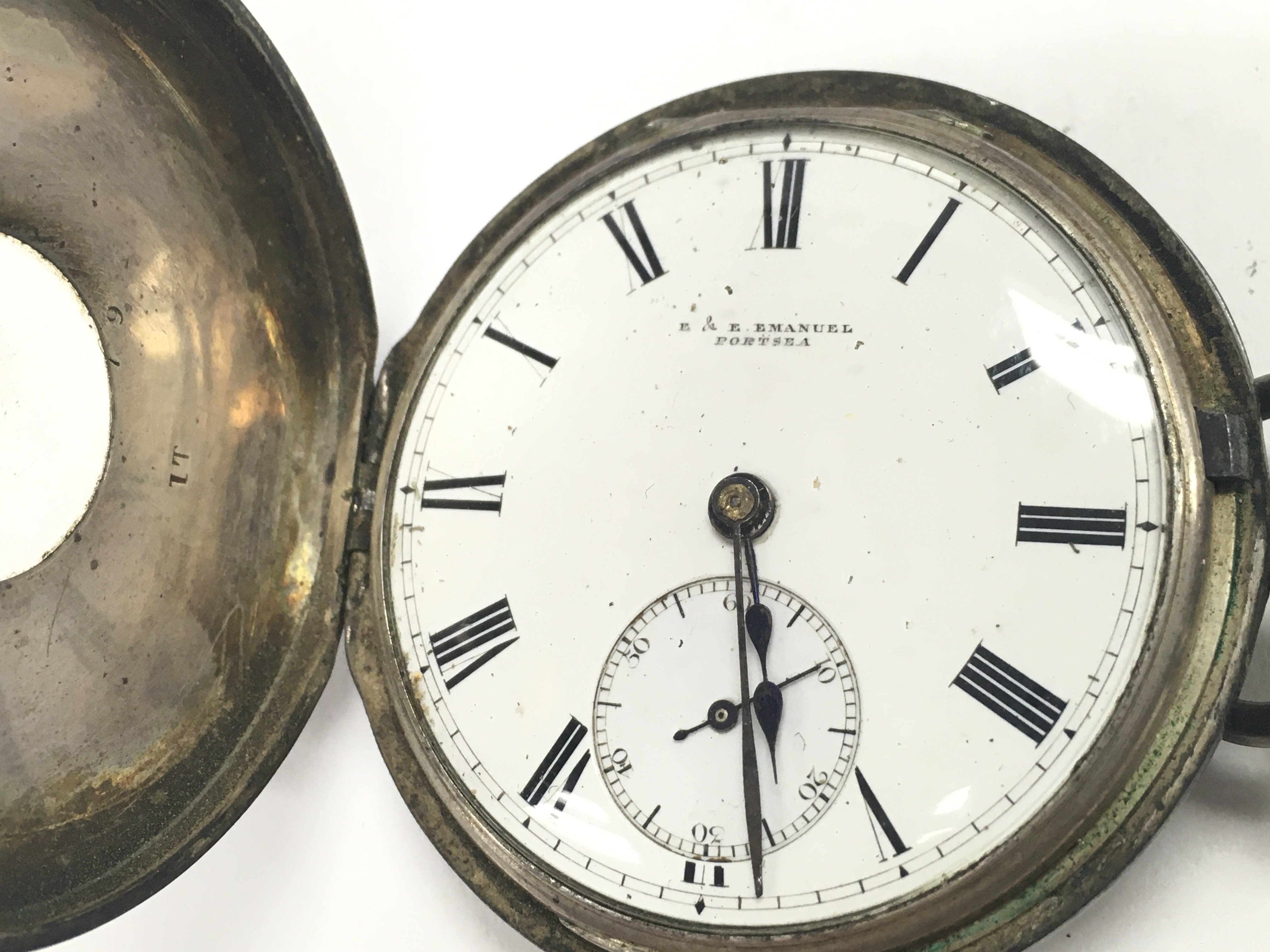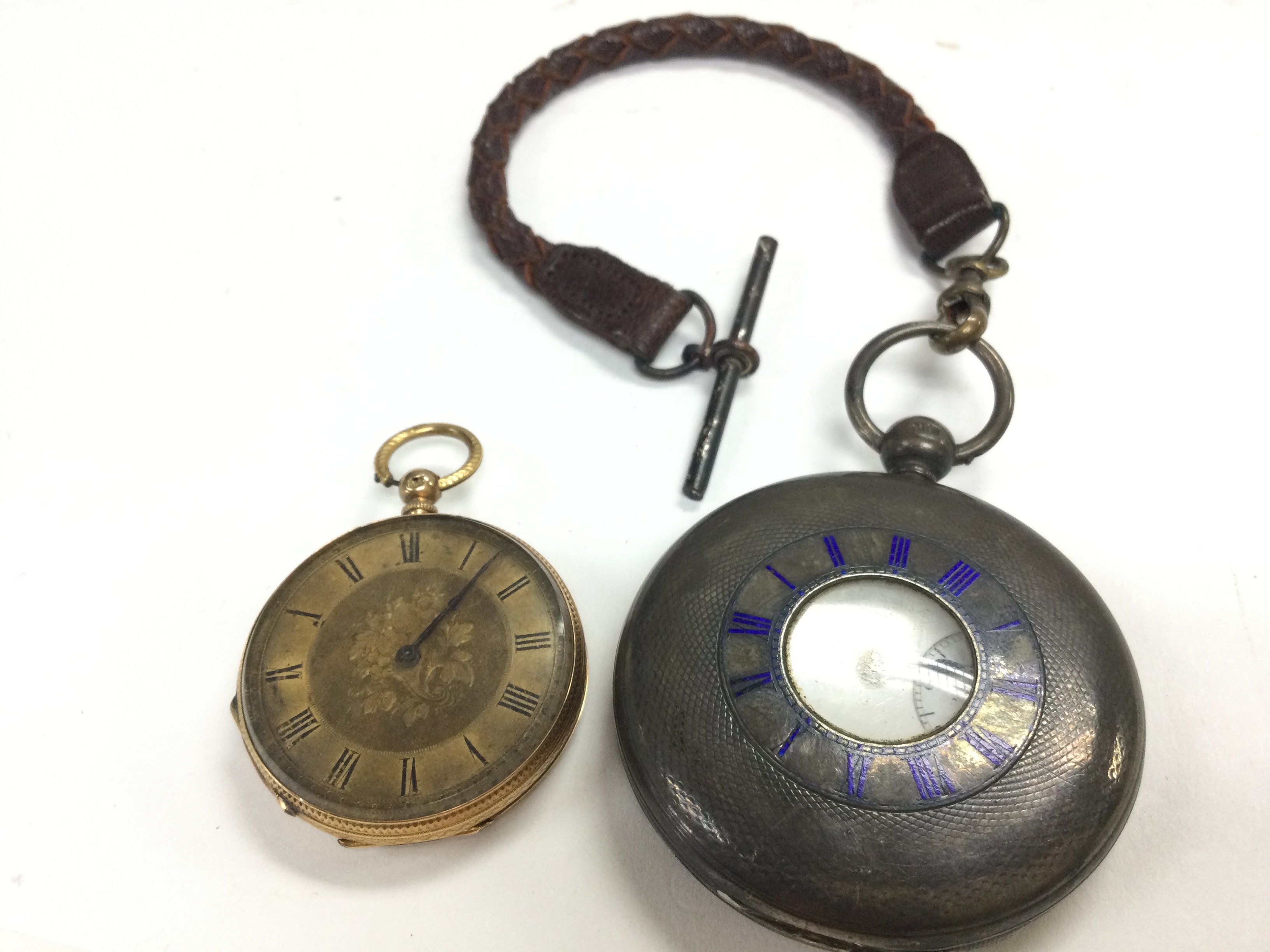 An 18ct gold cased pocket watch (28.8g) and a half hunter silver hallmarked pocket watch by E&E Emanuel, Portsea. Postage category A