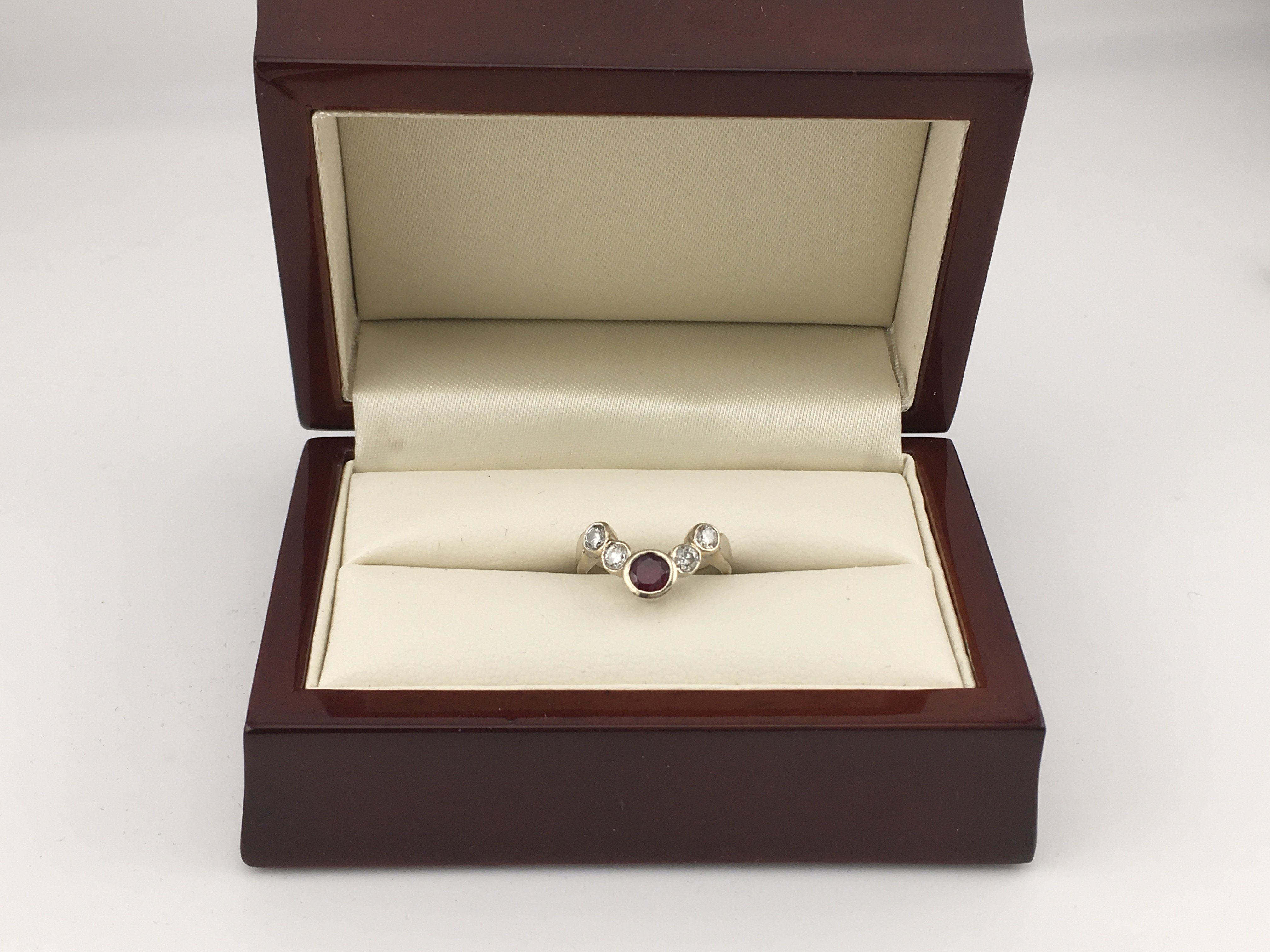 A 14ct white gold diamond and ruby wishbone style ring. Approx weight 3.75 grams, Approx size I1/2.