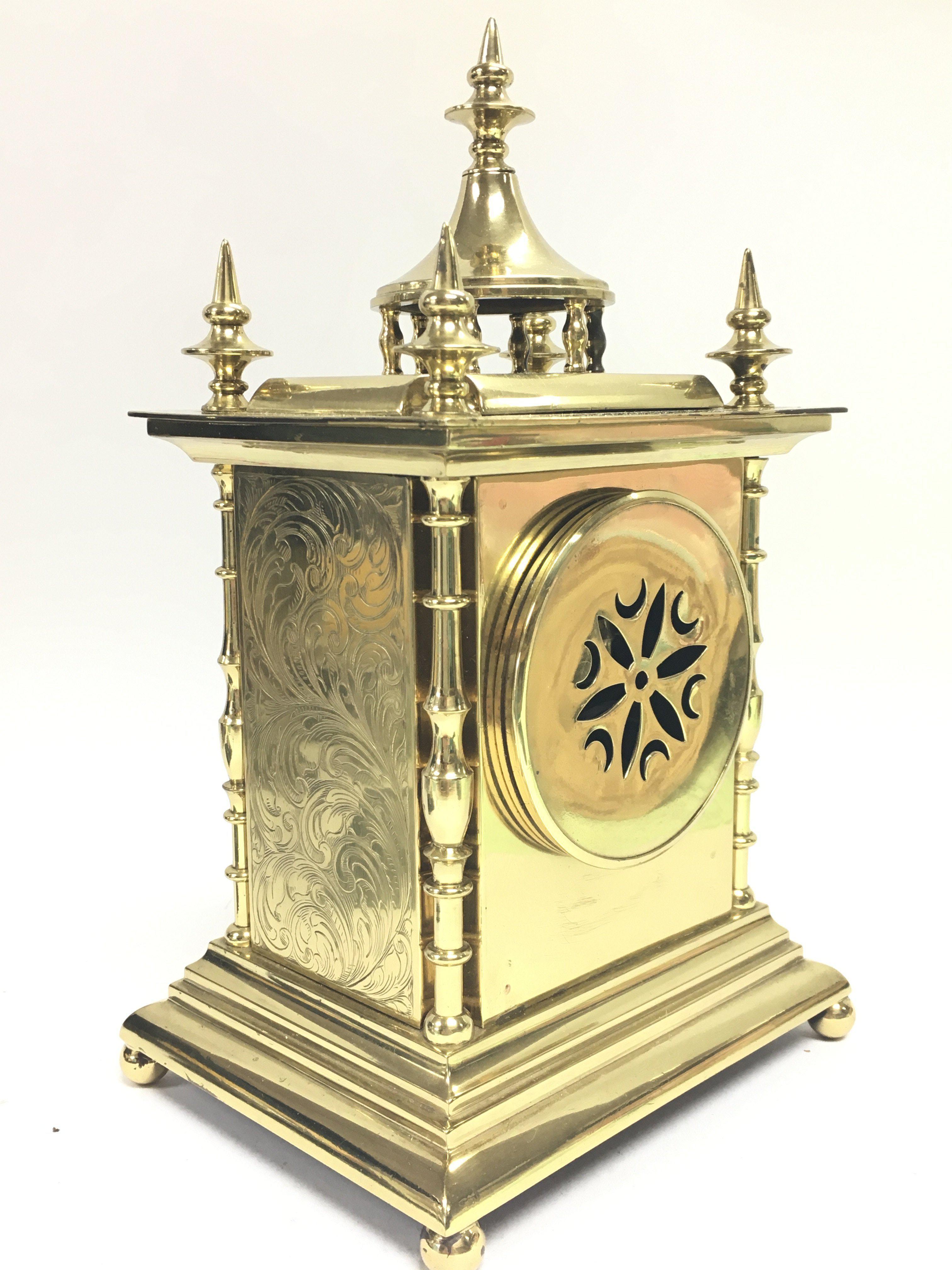 A French brass mantel clock maker S Marti with ornate engraved decoration and a painted porcelain roman numeral dial, with key. Seen working. Dimensions 13x17x28cm. This lot cannot be posted