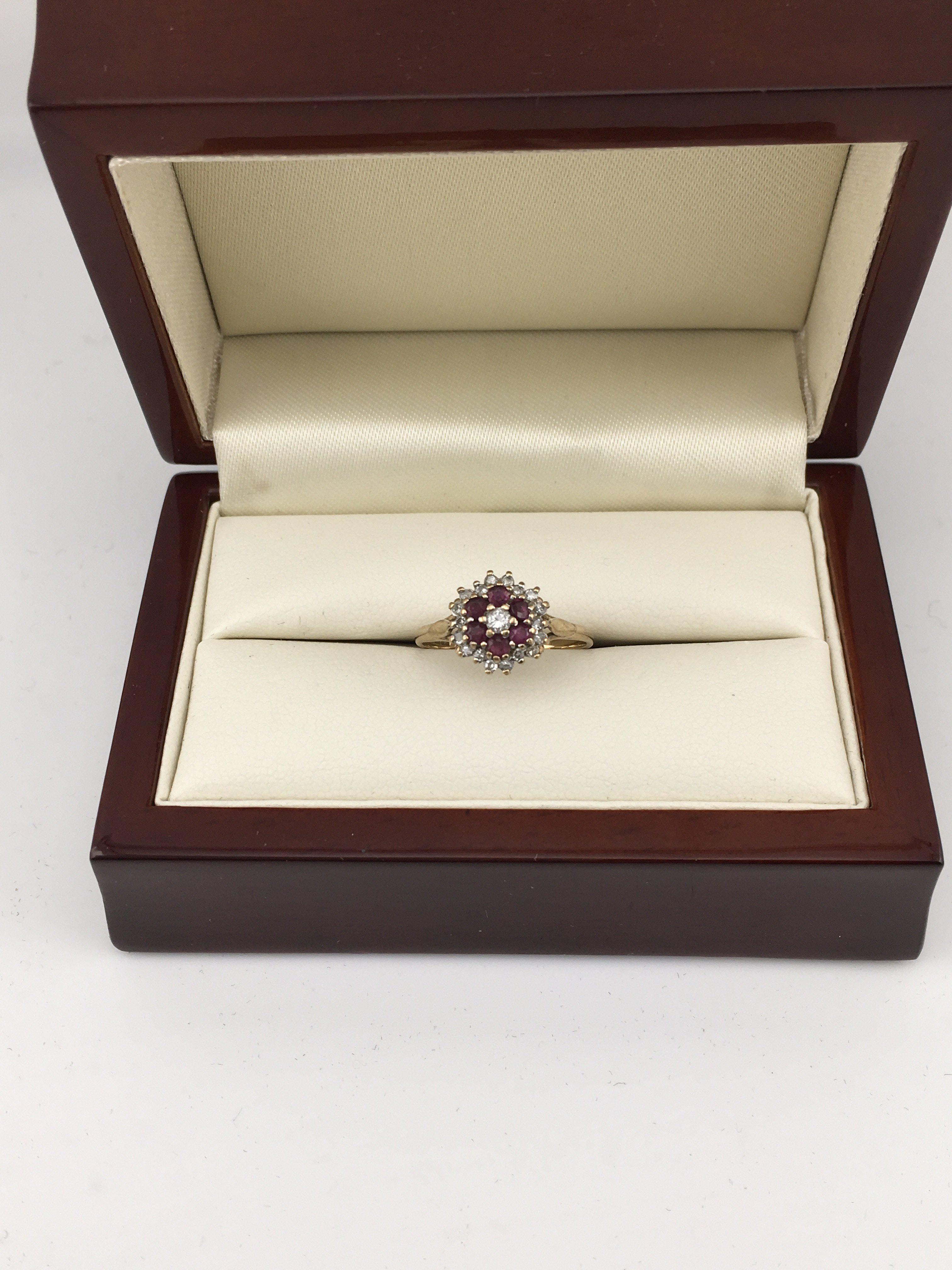 A 9ct diamond and ruby cluster ring. Approx weight 2.14 grams, Approx size N 1/2.