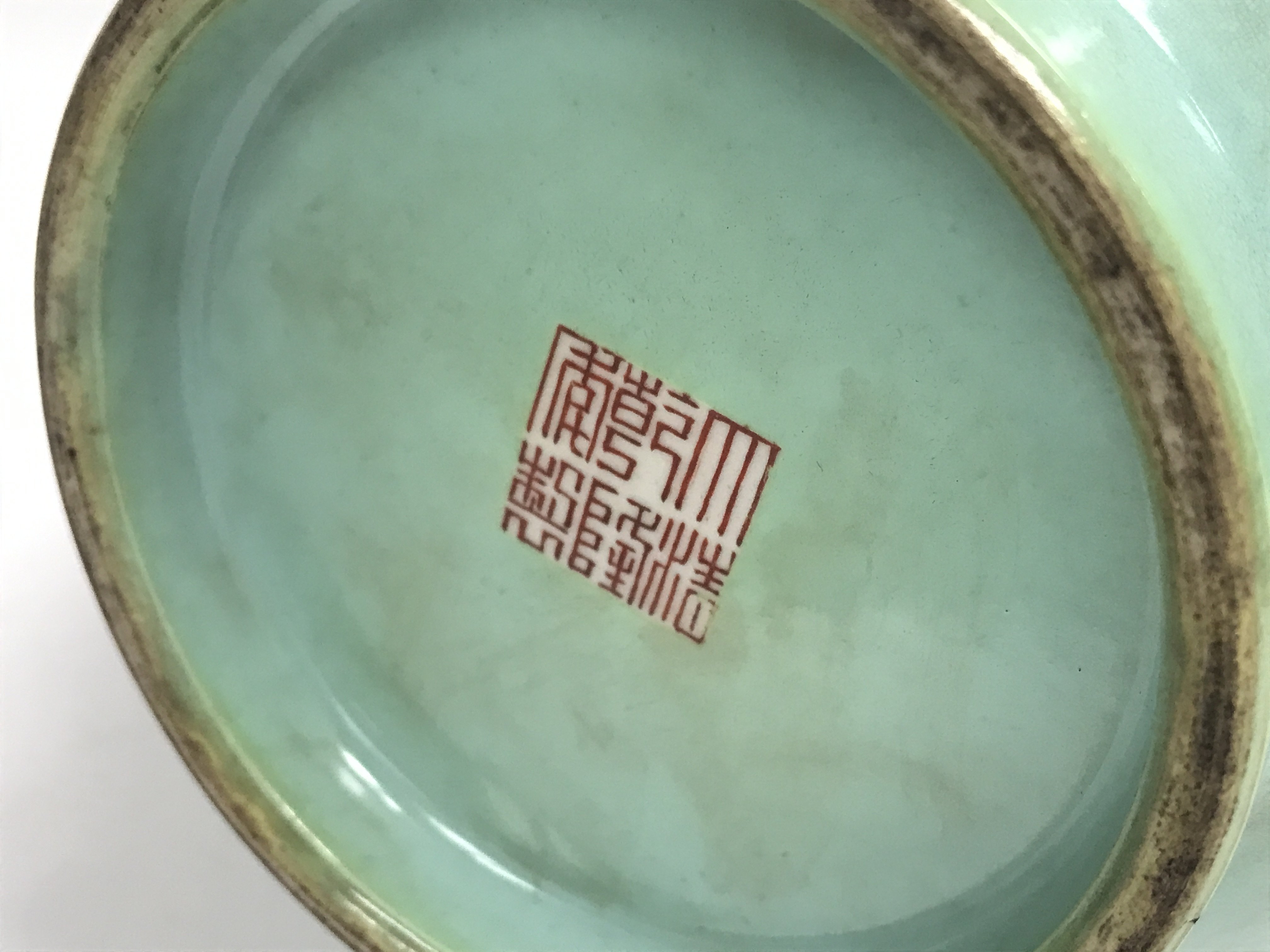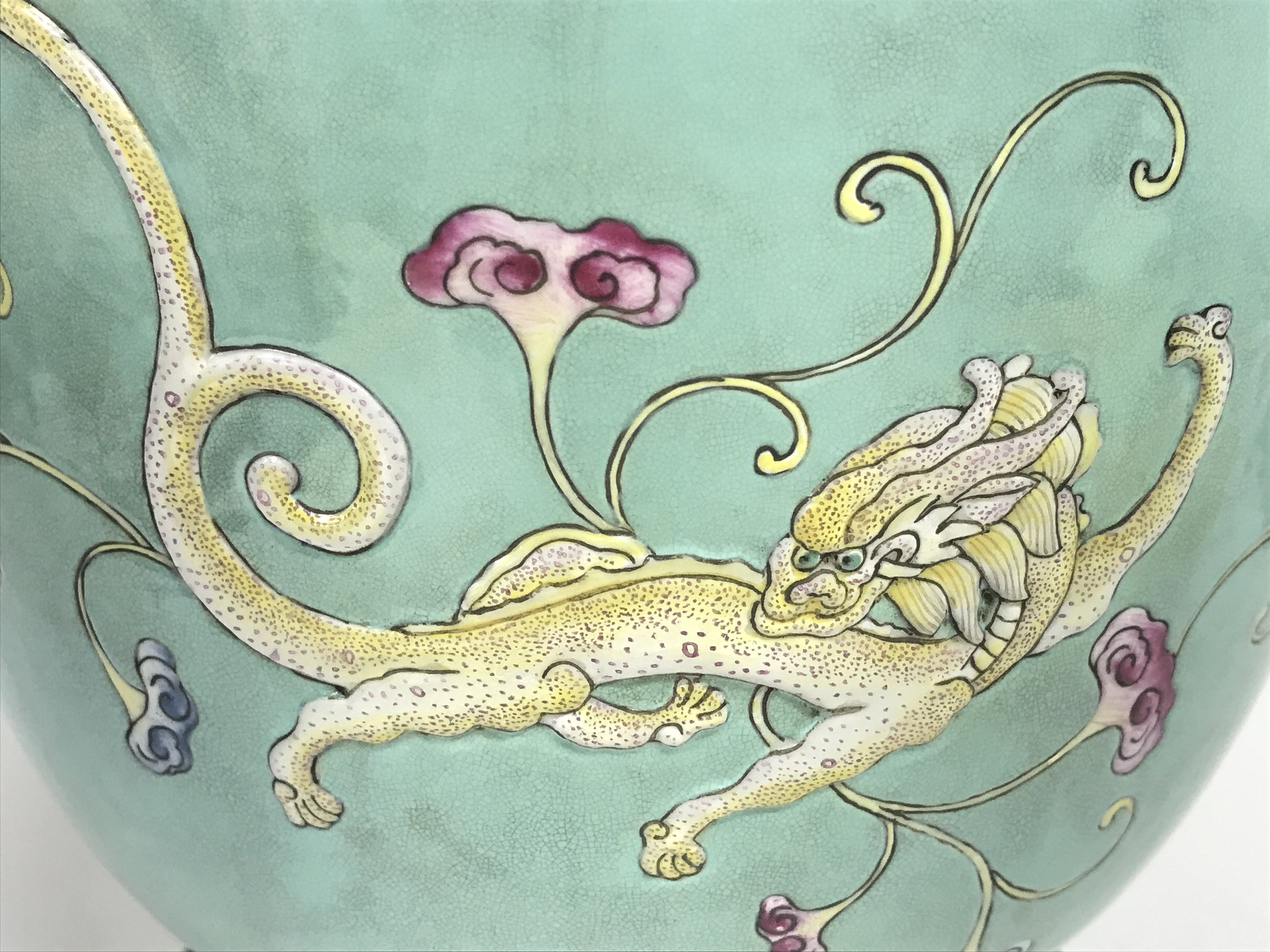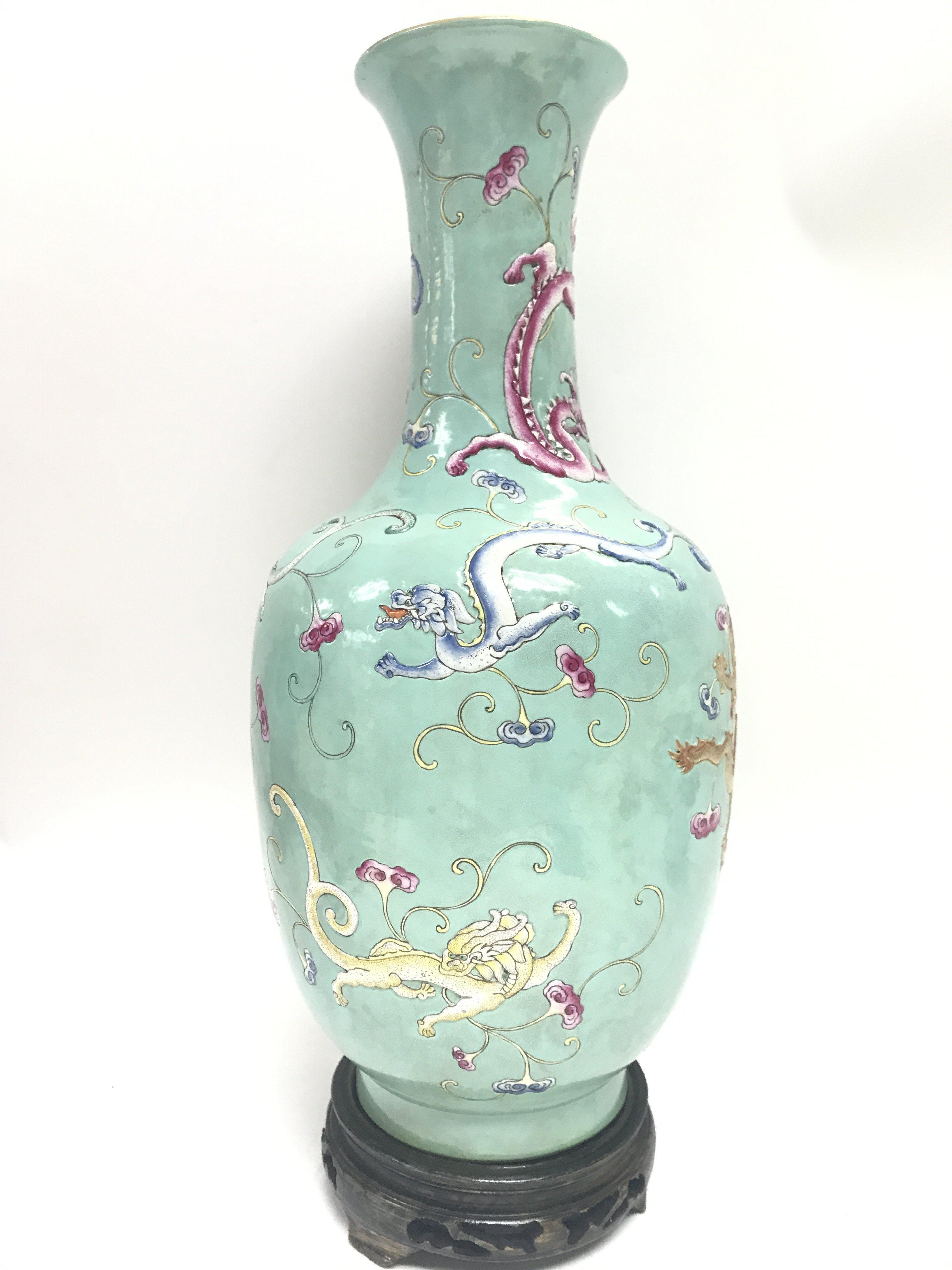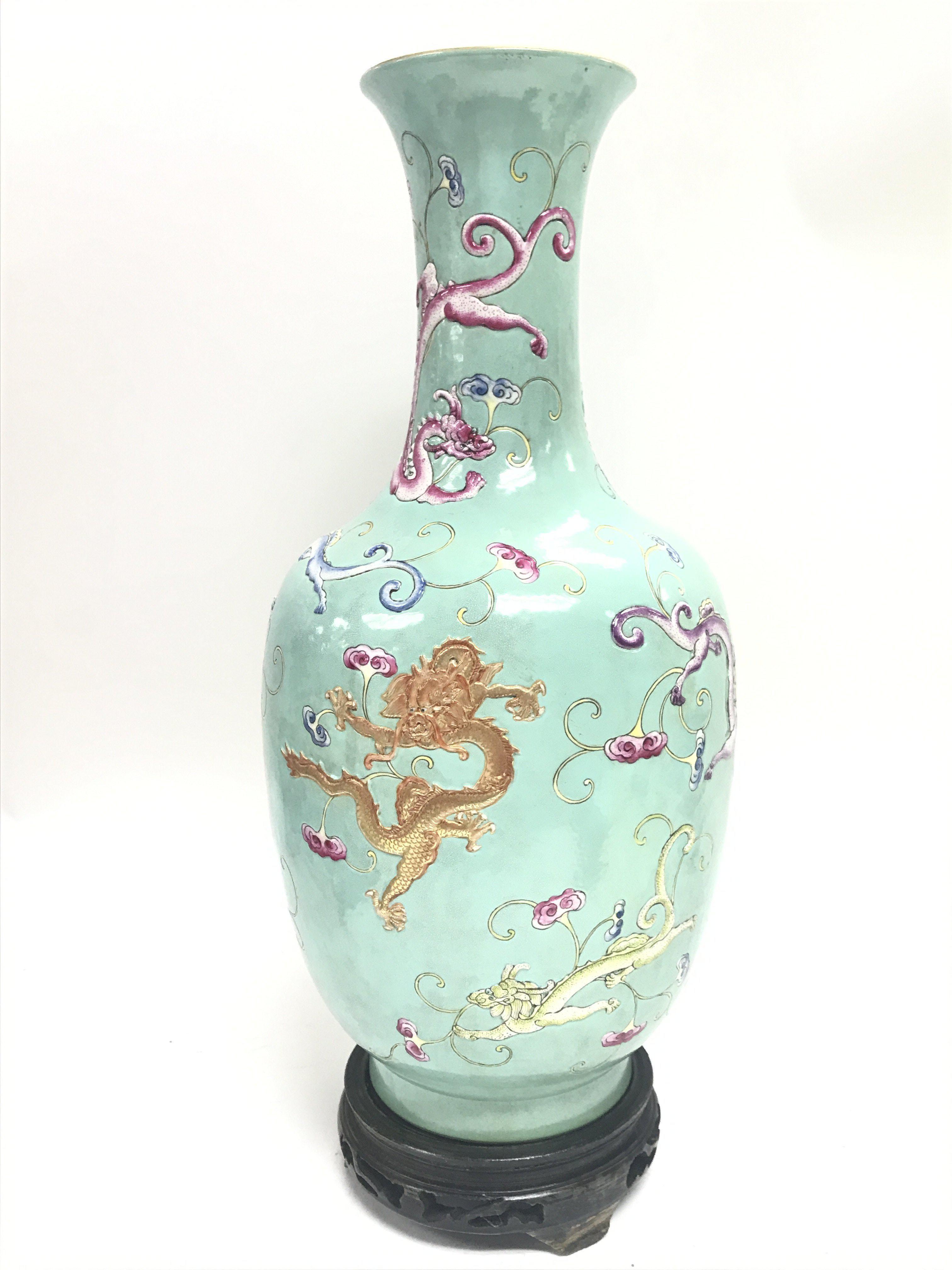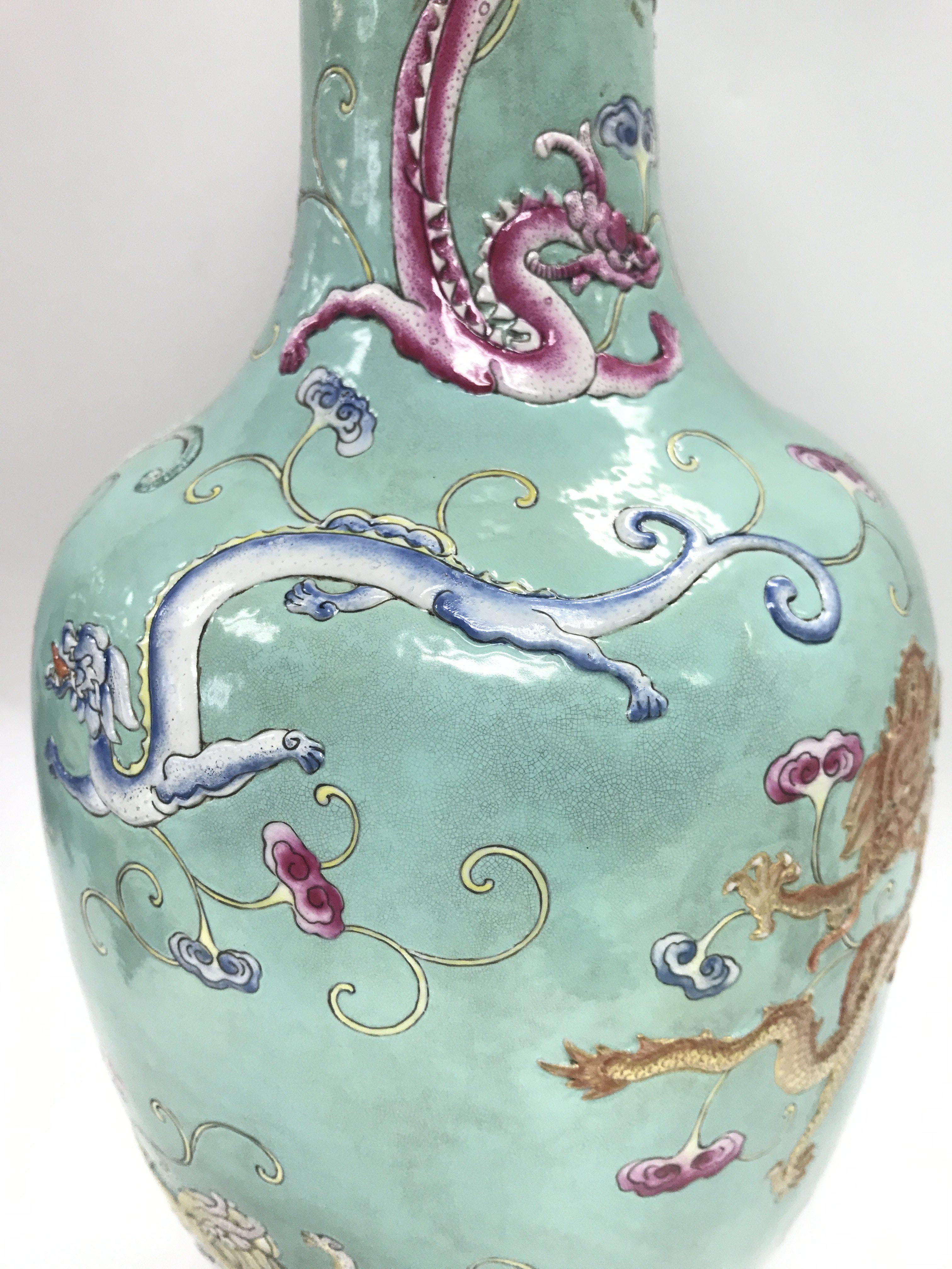 A Chinese Famille Rose Turquoise ground dragon vase , with six character mark to the base. Approximately 33cm tall. No obvious damage or restoration. This lot cannot be posted