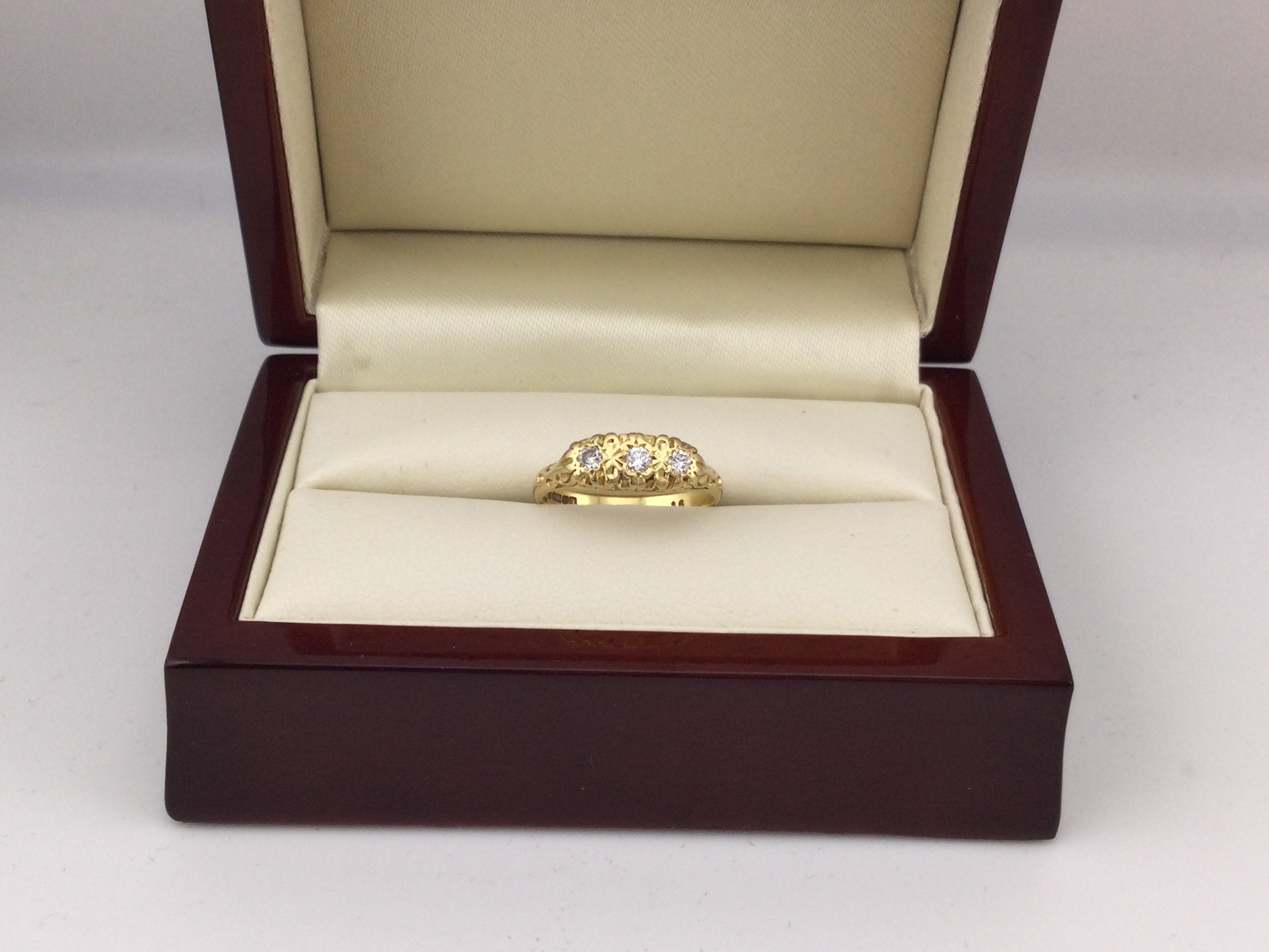 An 18ct gold ring set with three diamonds. Approx weight 3.69 grams, approx size L.