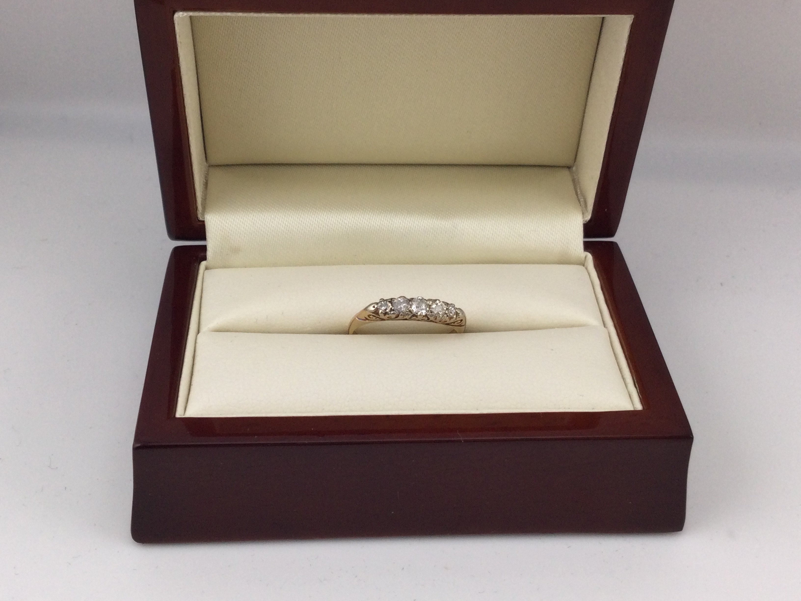 An 18ct five stone diamond set ring. Approx size N, approx weight 2.46 grams.