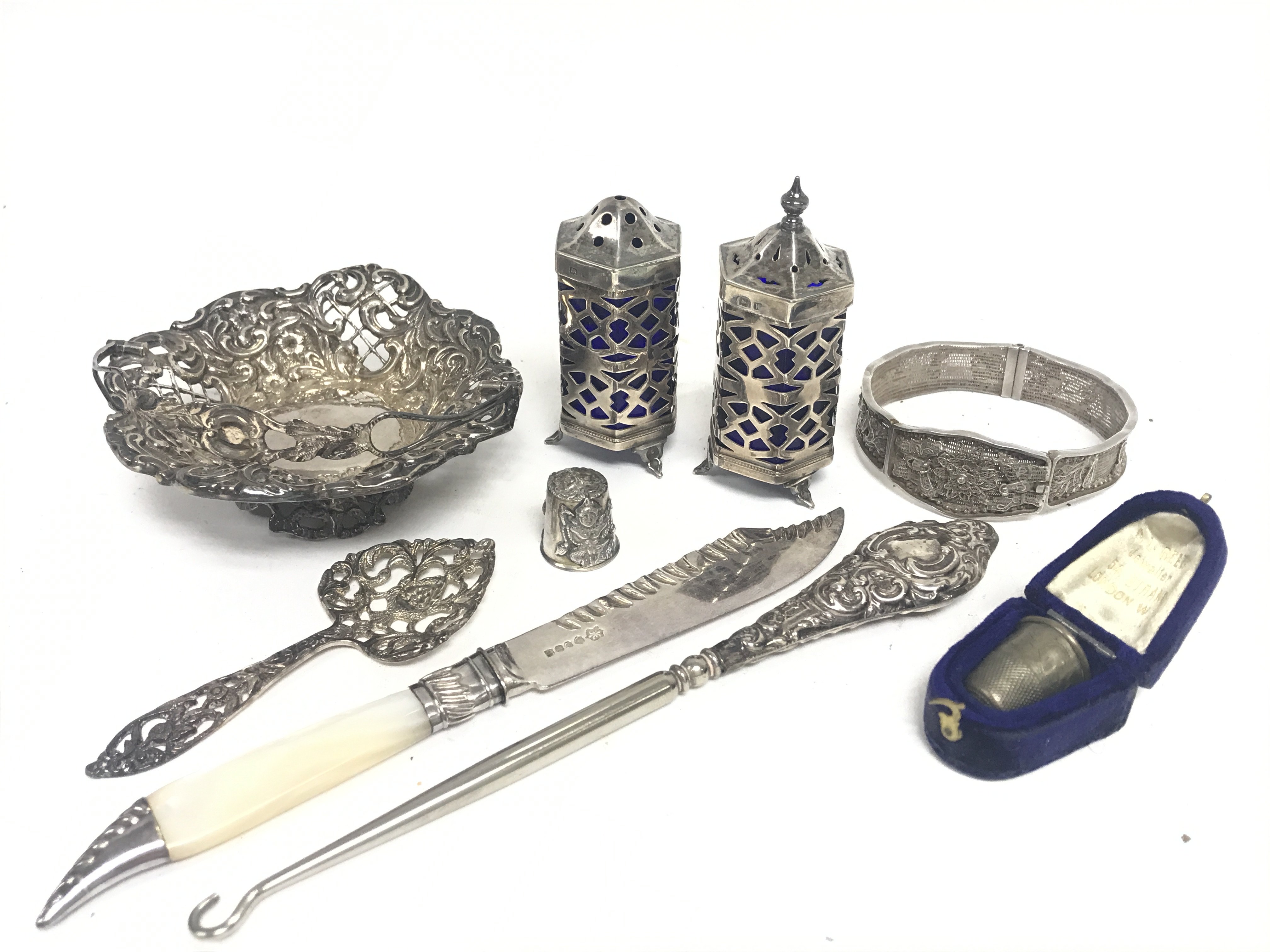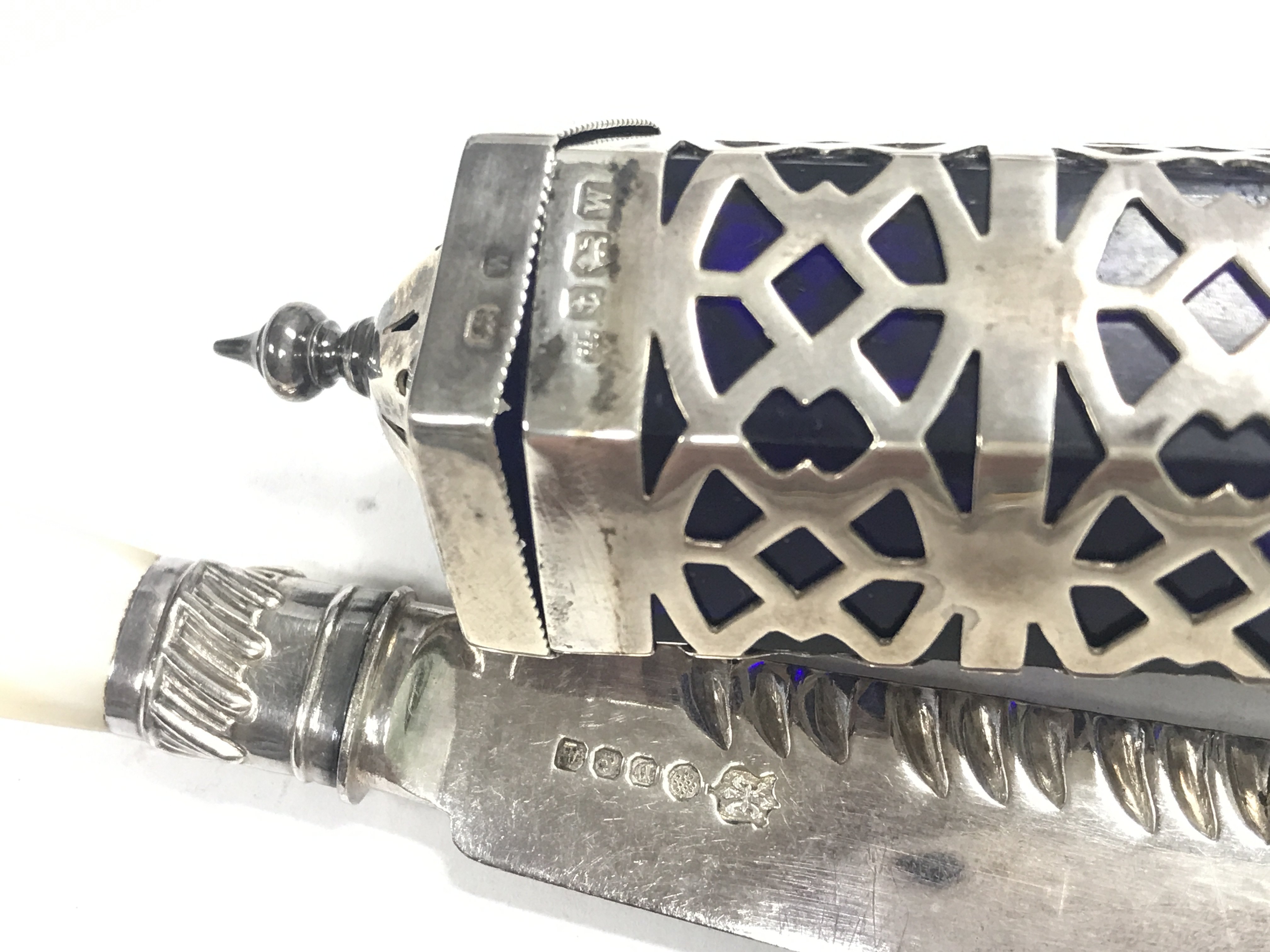 A Collection of silver hallmarked items including silver cased blue s/p glass shakers, a mother of Pearl handled knife, crochet hook etc. This lot cannot be posted.