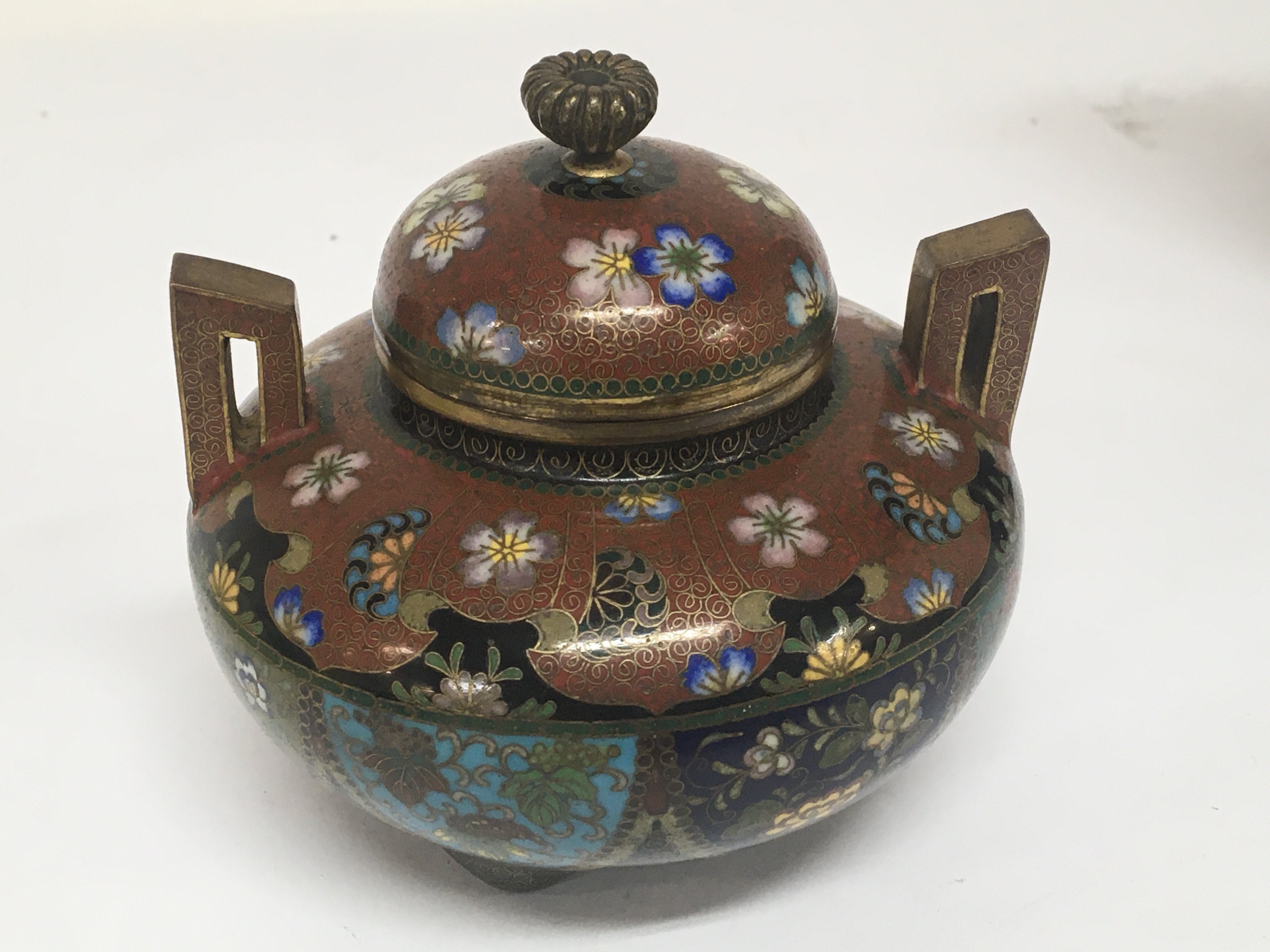 A Quality Japanese cloisonn jar and cover decorated with sprays of flowers. With raised handles. Hight 9cm no obvious damage.