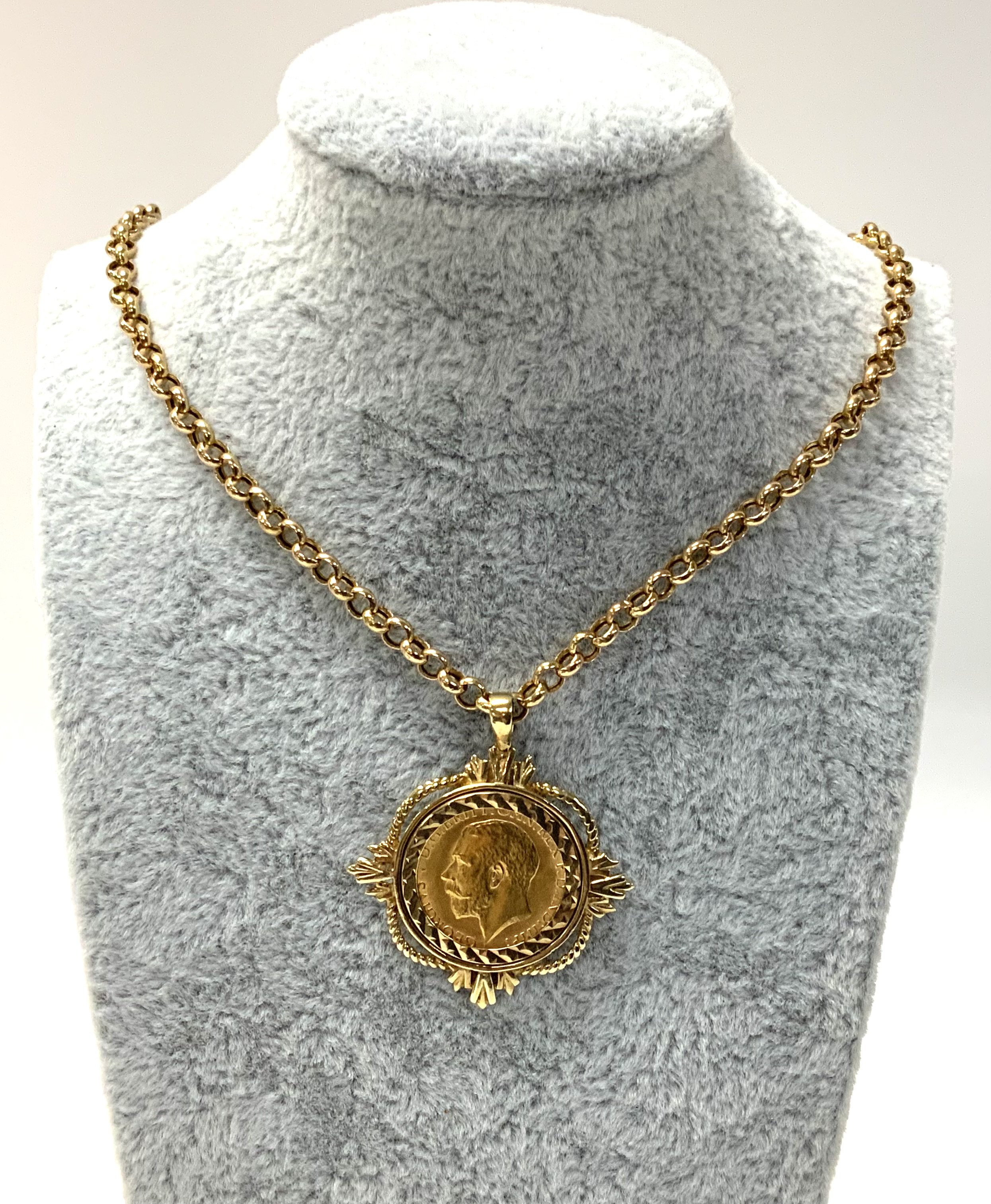 A George V half sovereign with a 9ct gold coin mount and chain. (A)