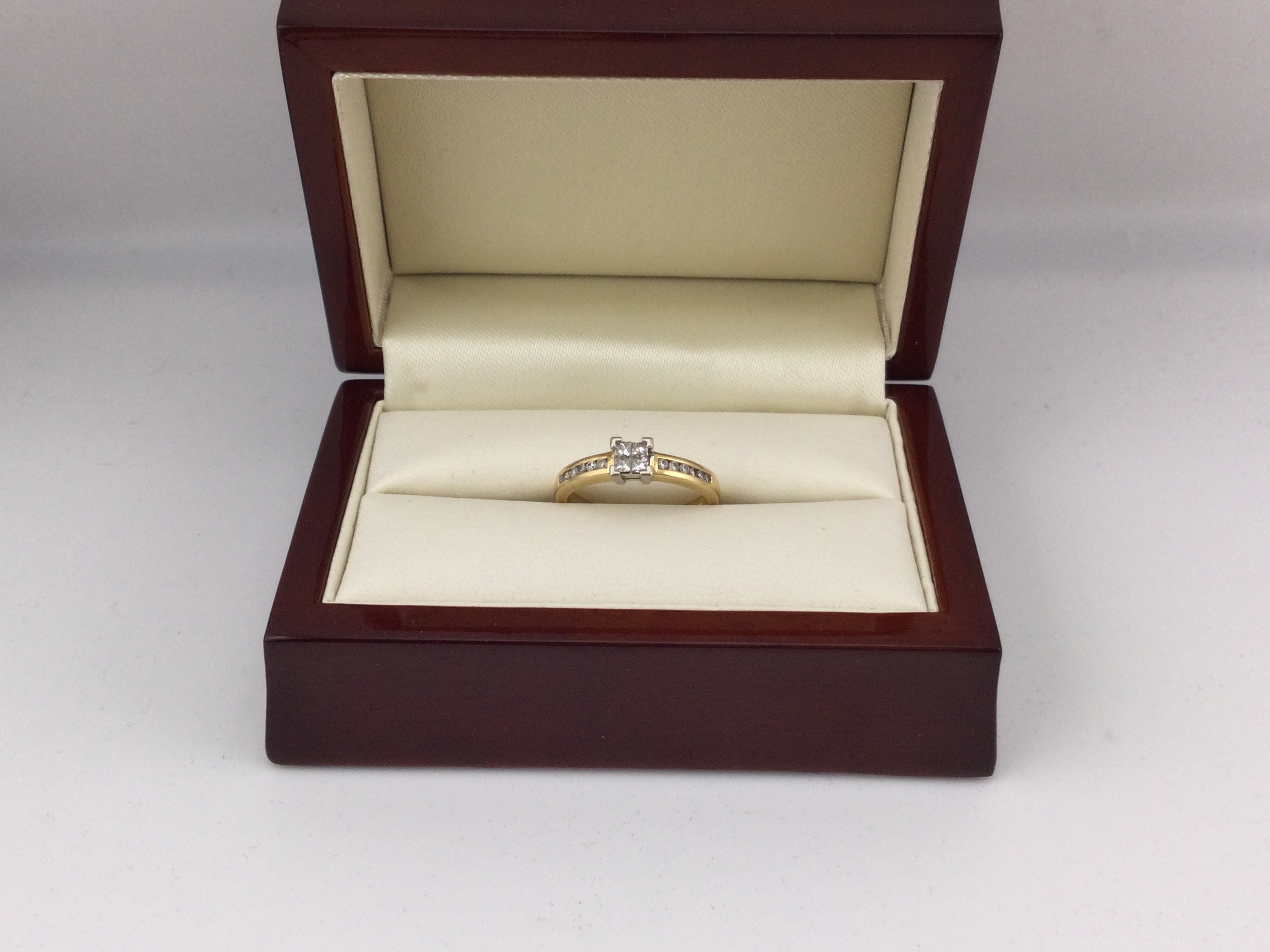 An 18ct gold diamond set ring with a central setting and diamonds set on both shoulder. Approx weight 3.73 grams, approx size O.