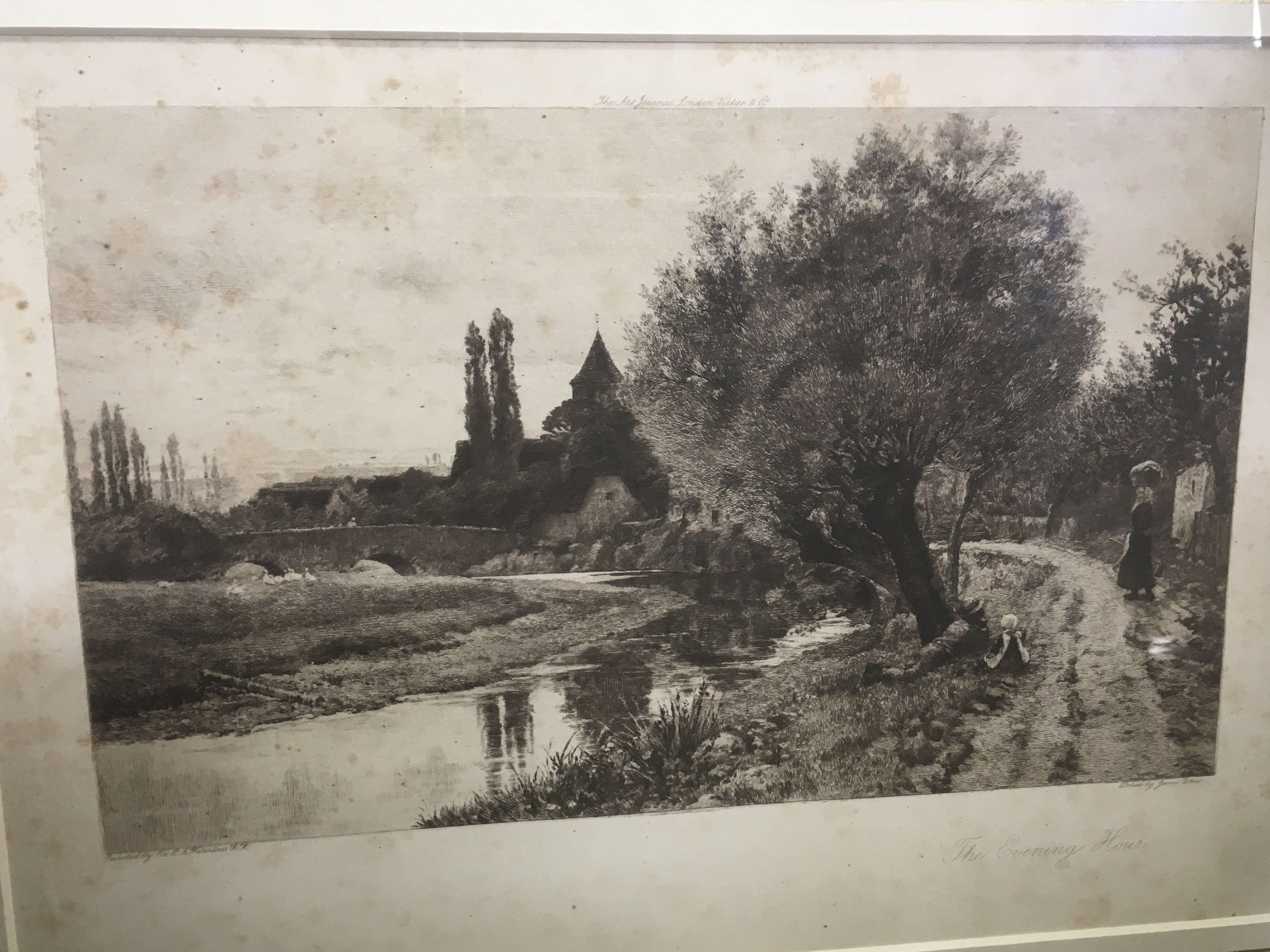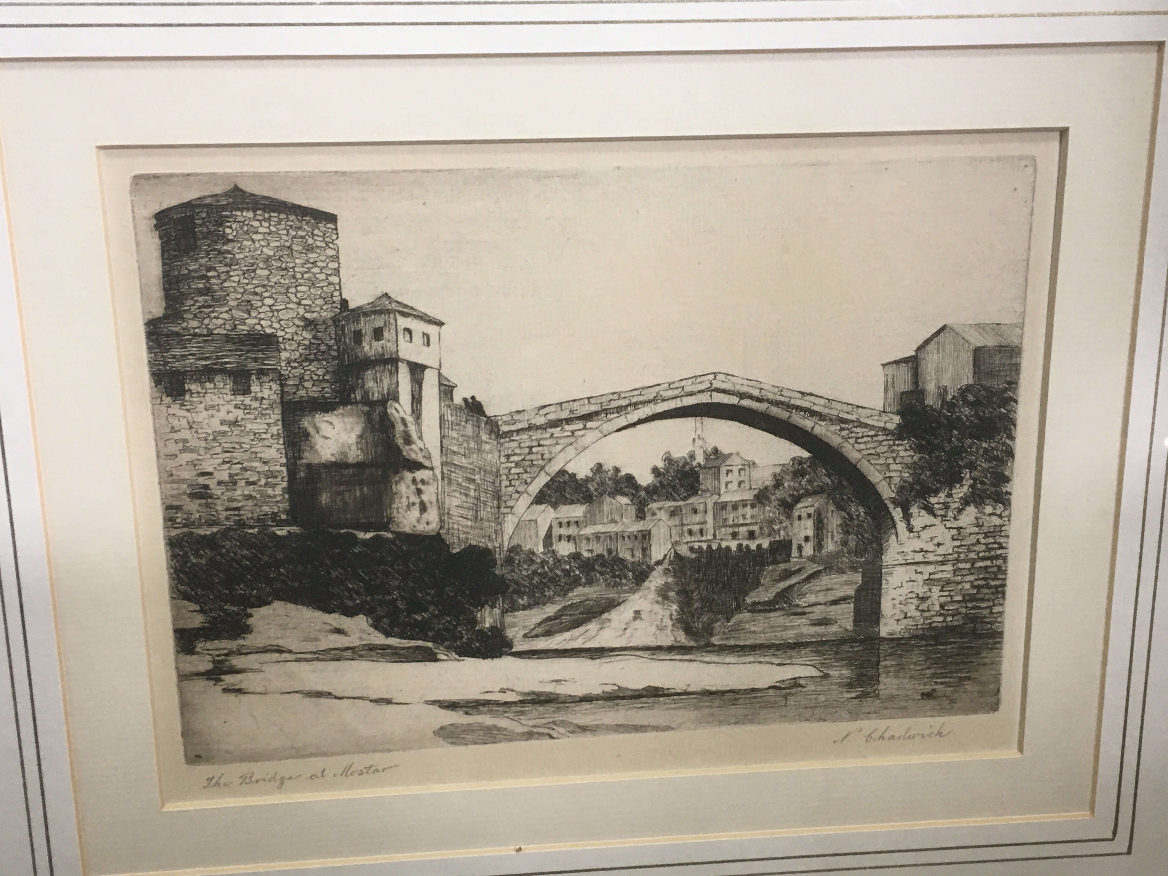 A collection of framed pictures including an etching by N. Chadwick titled The Bridge at Mostar, a printed etching by James Dobie titled the Evening man, a watercolour by C.H Bagnol of a nature view and other pictures. NO RESERVE