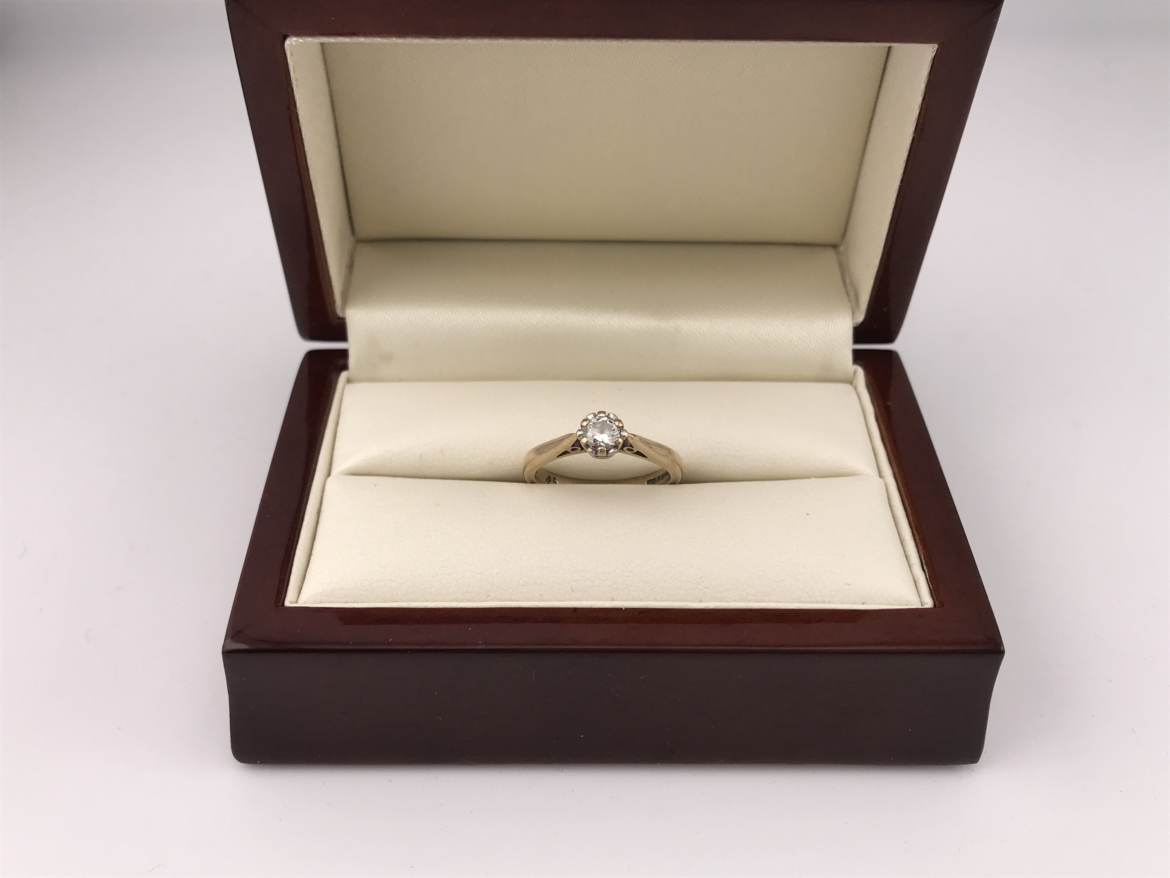 A 9ct go,d solitaire ring set with a 0.25ct diamond. Approx weight 2.4grams, approx size L.