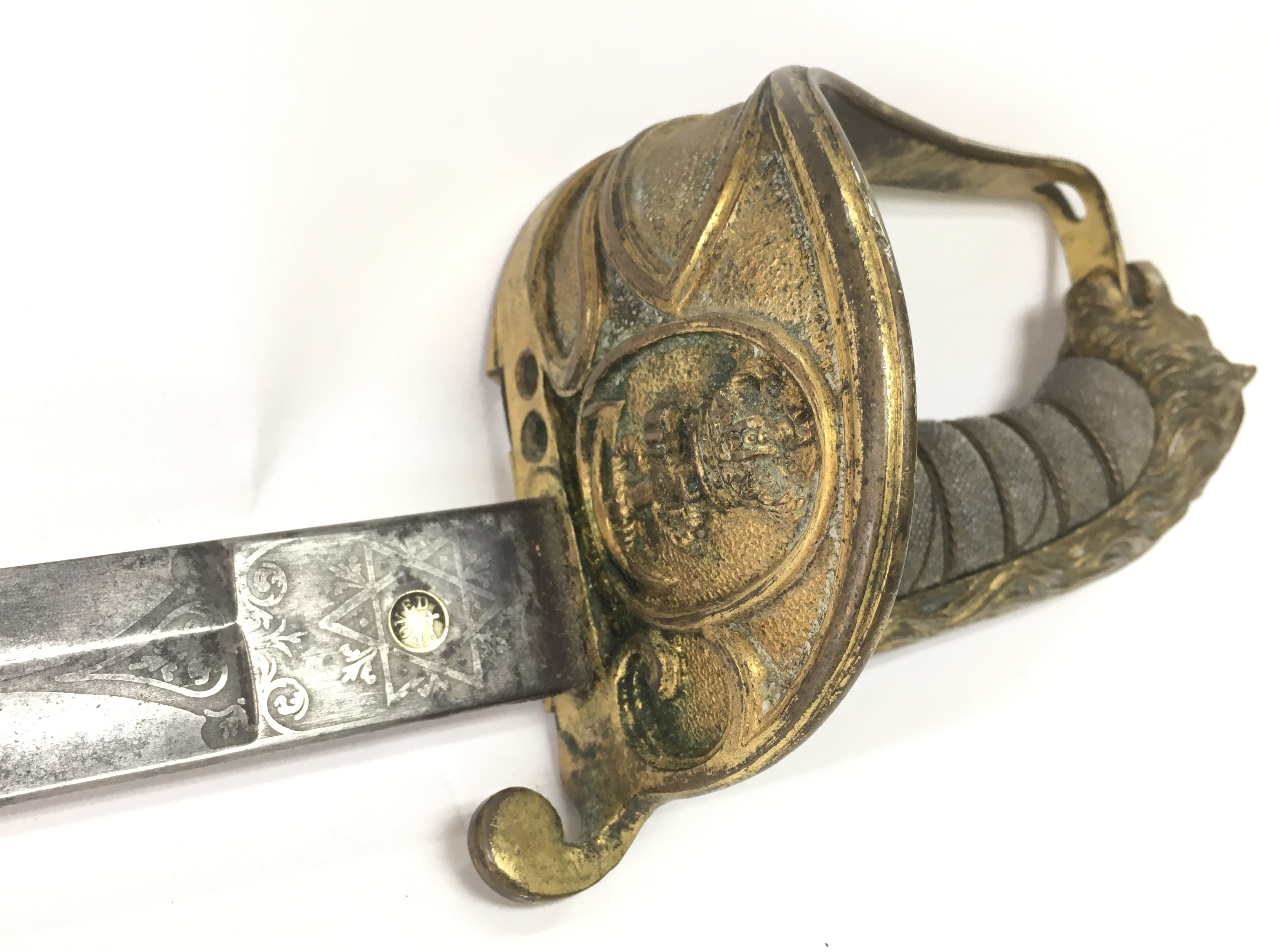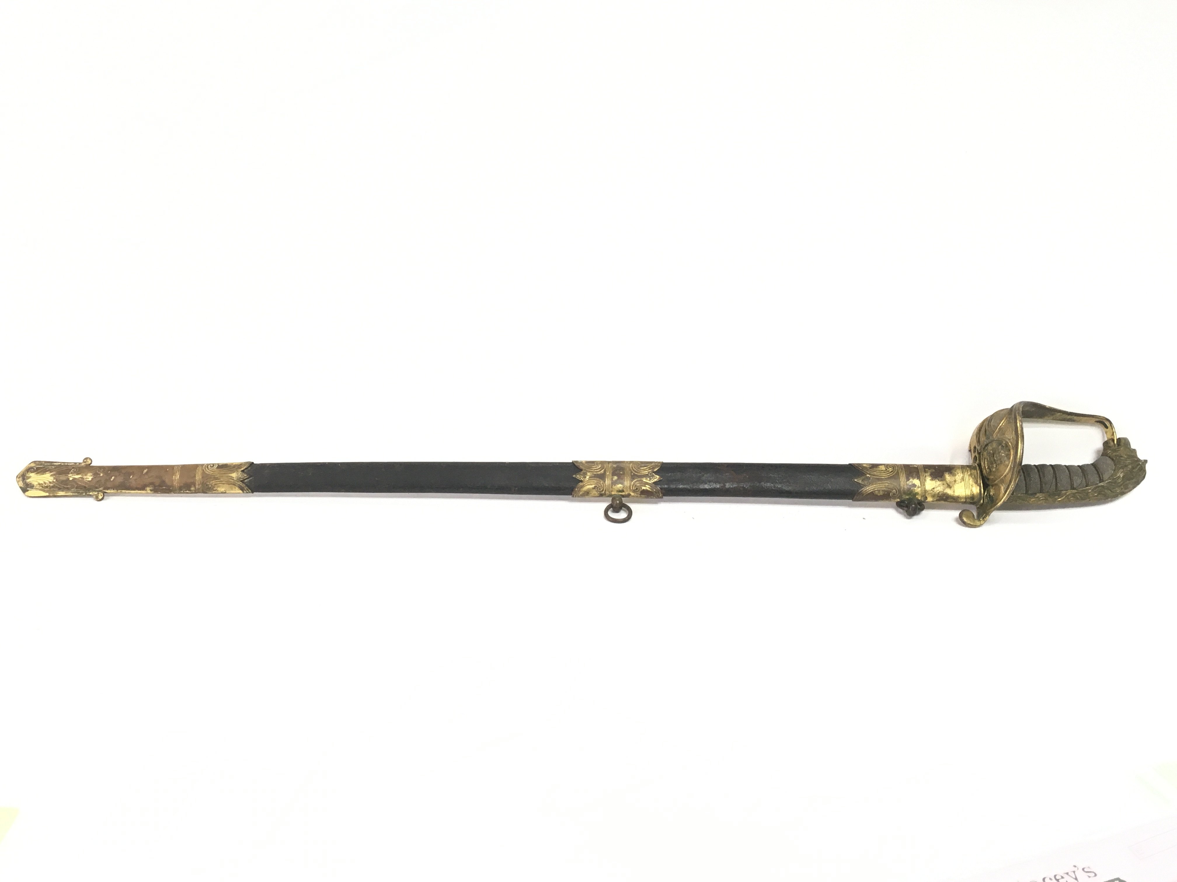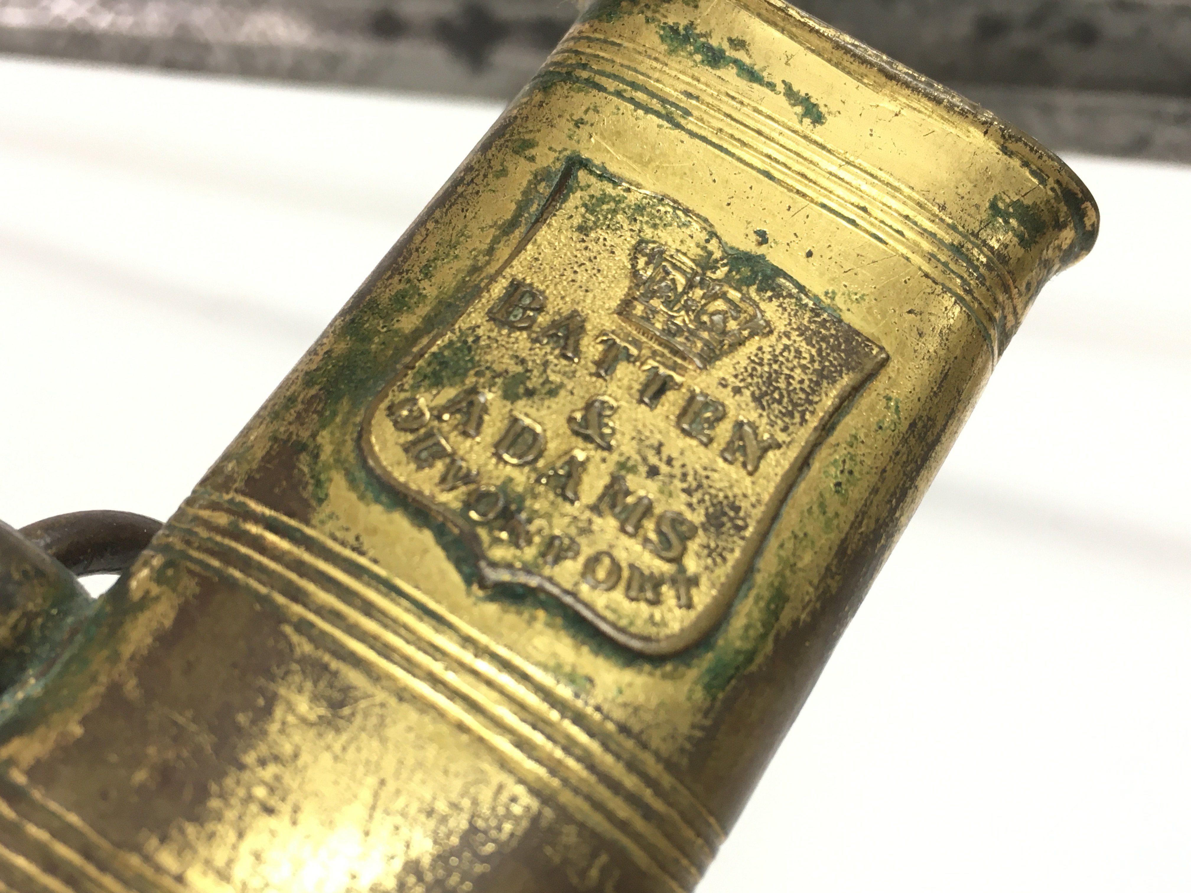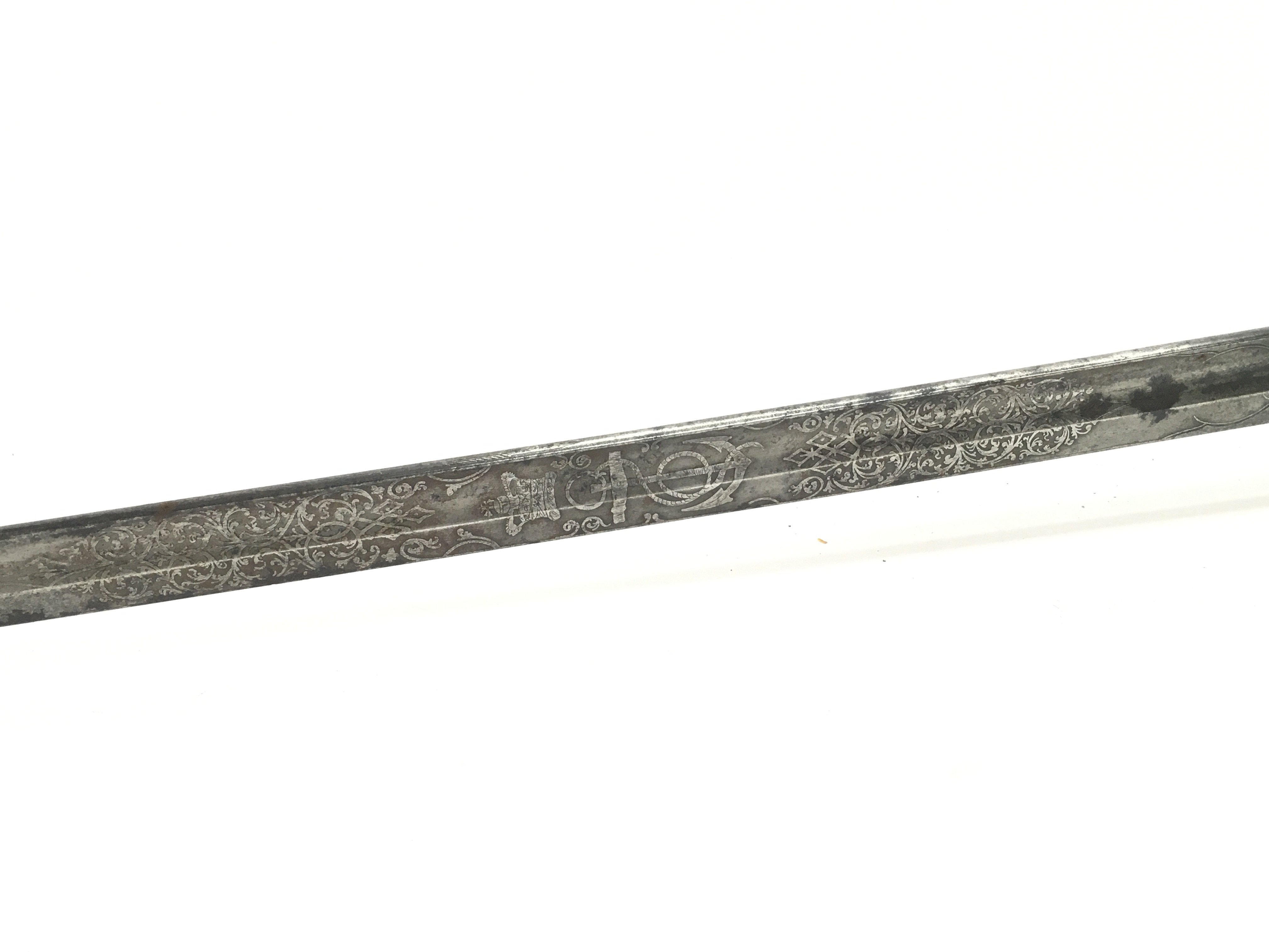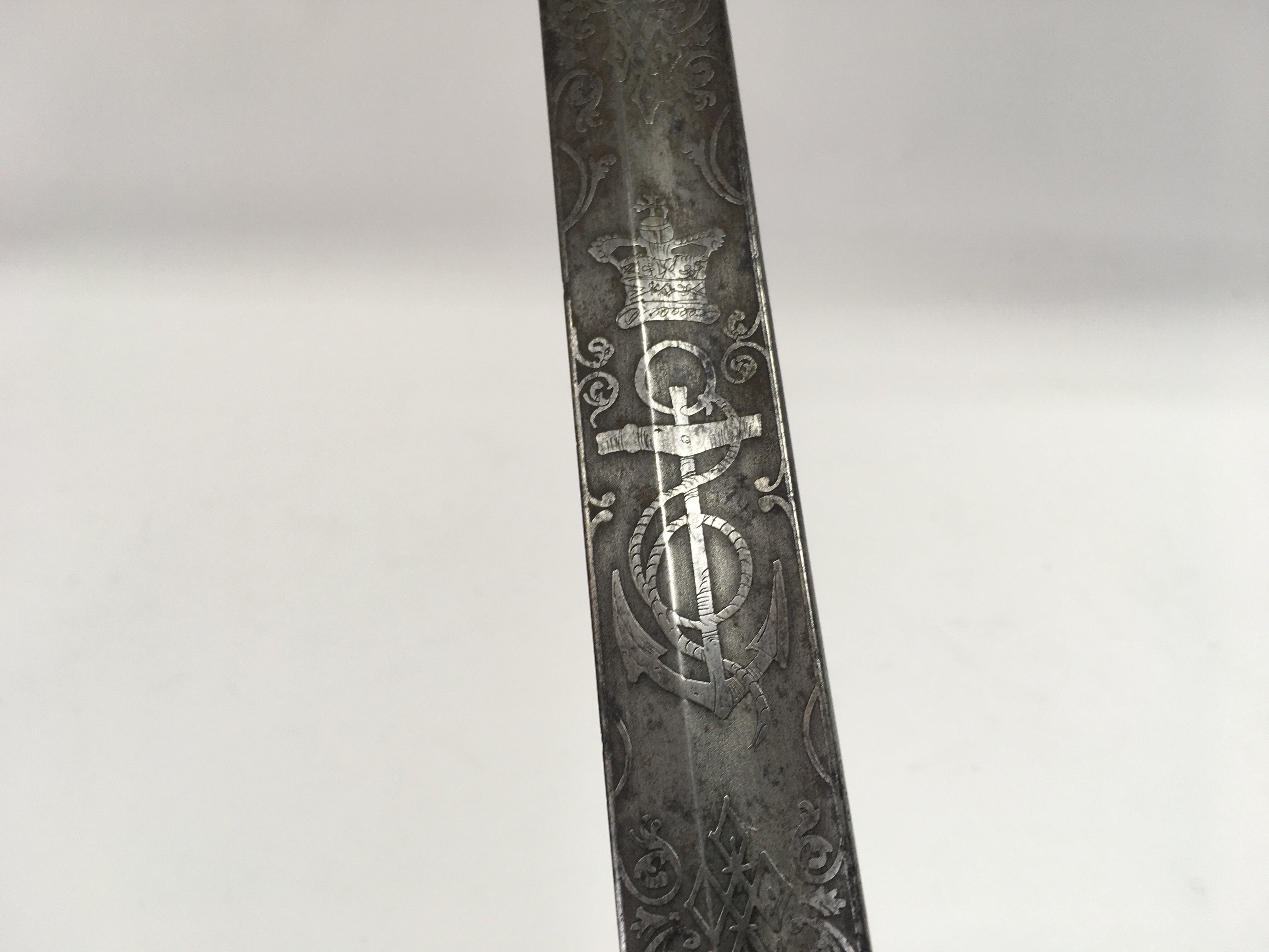 A mid 19th century naval officers sword Batten & Adams, Devonport. With scabbard. Blade 77cm long approximately. Total length 91cm. This lot cannot be posted