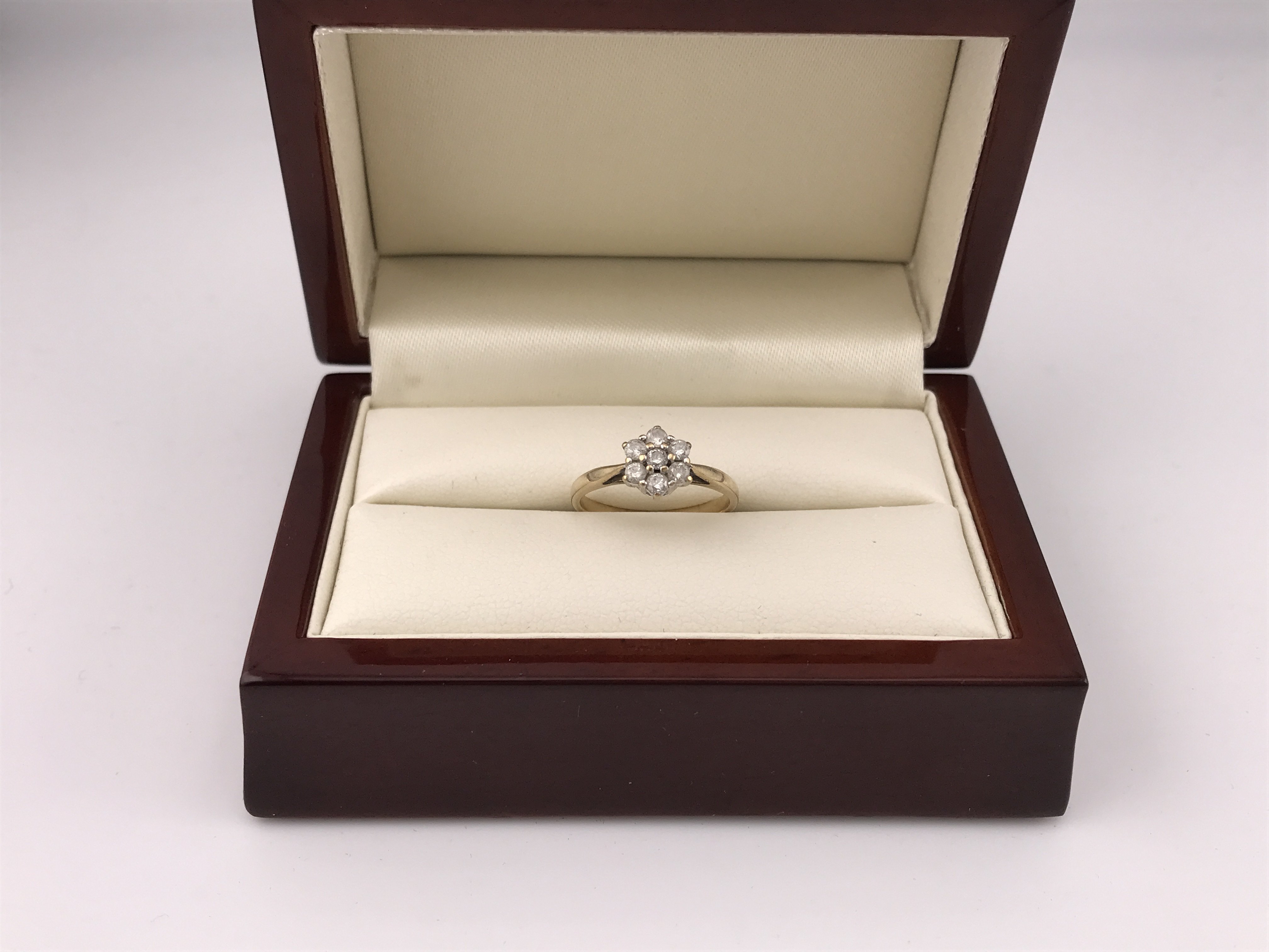A 9ct gold flower style diamond cluster ring. Approx weight 1.8grams, approx size K1/2.