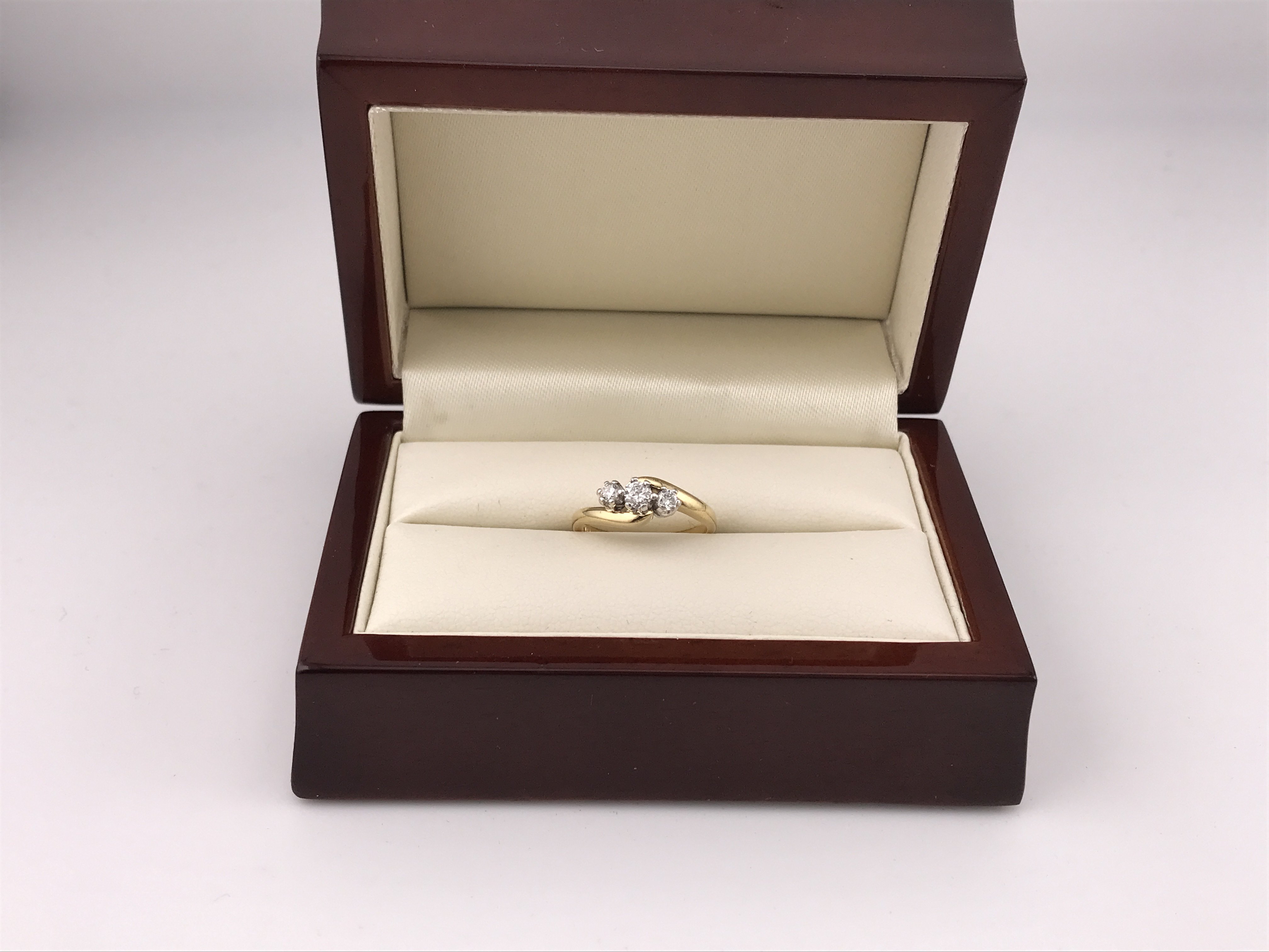 An 18ct three stone diamond ring. Approx weight 3.1 grams, approx size I 1/2.