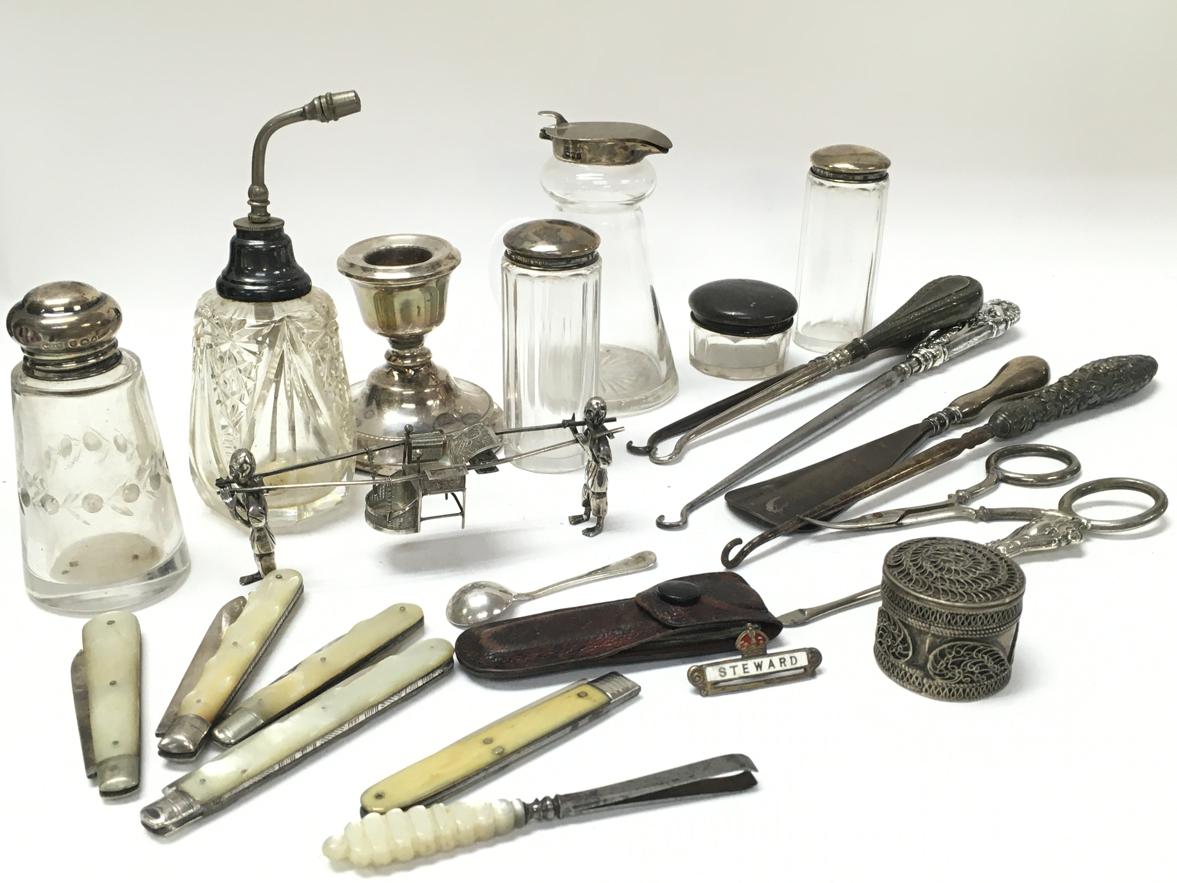 A Collection of silver items including fruit knives, candlesticks and silver top bottles