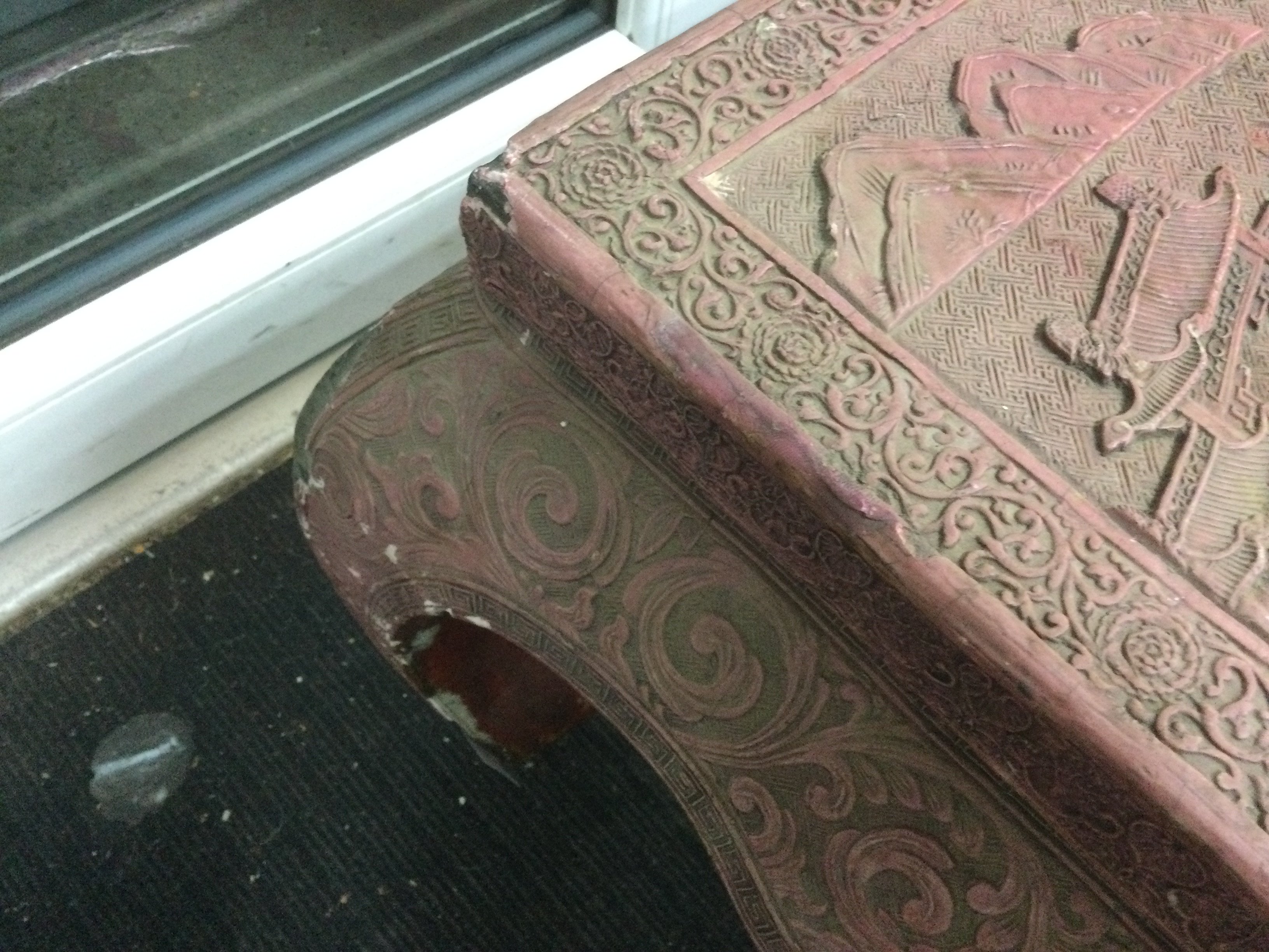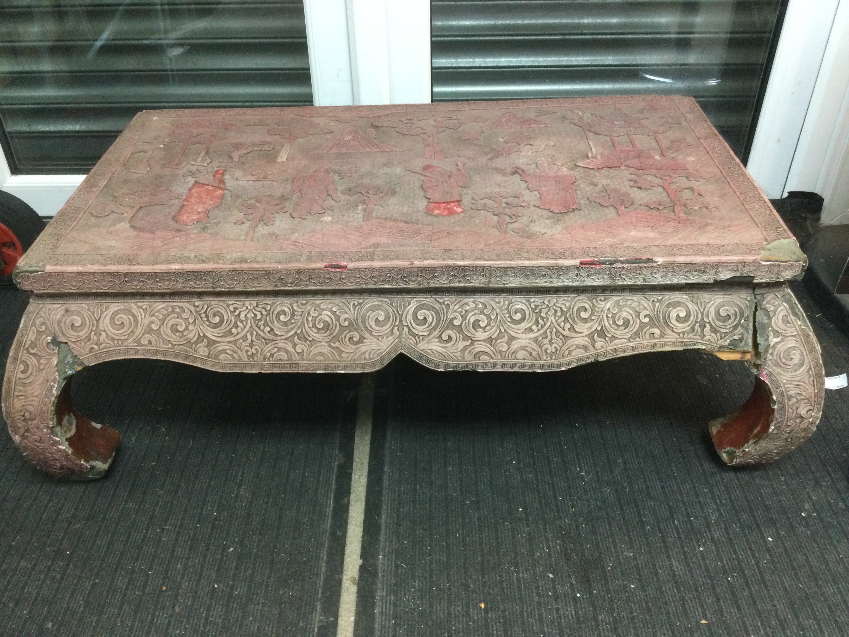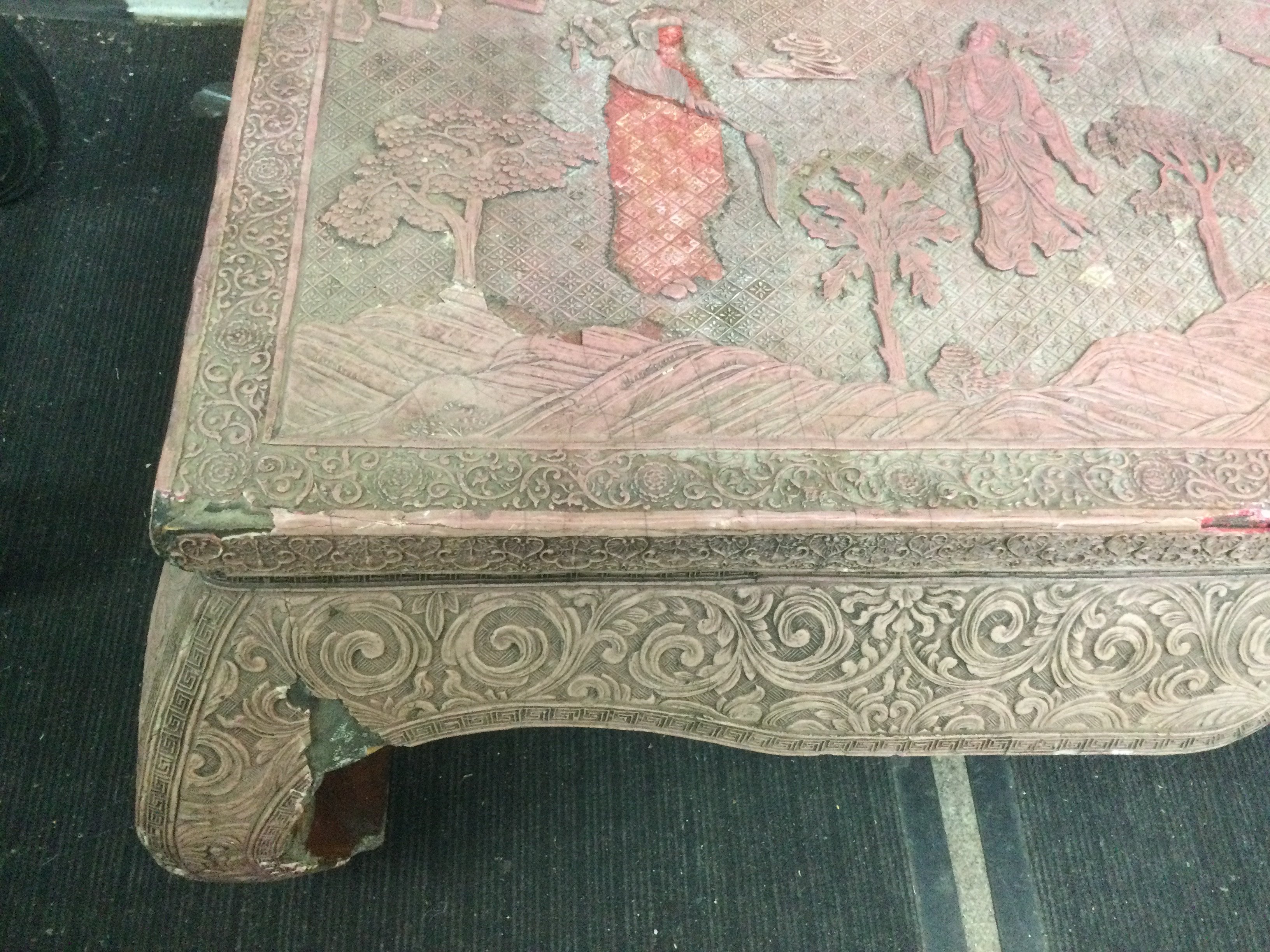 A highly decorative cinnabar low table, top diameter approx 90cm. Some damage. Shipping category D. NO RESERVE