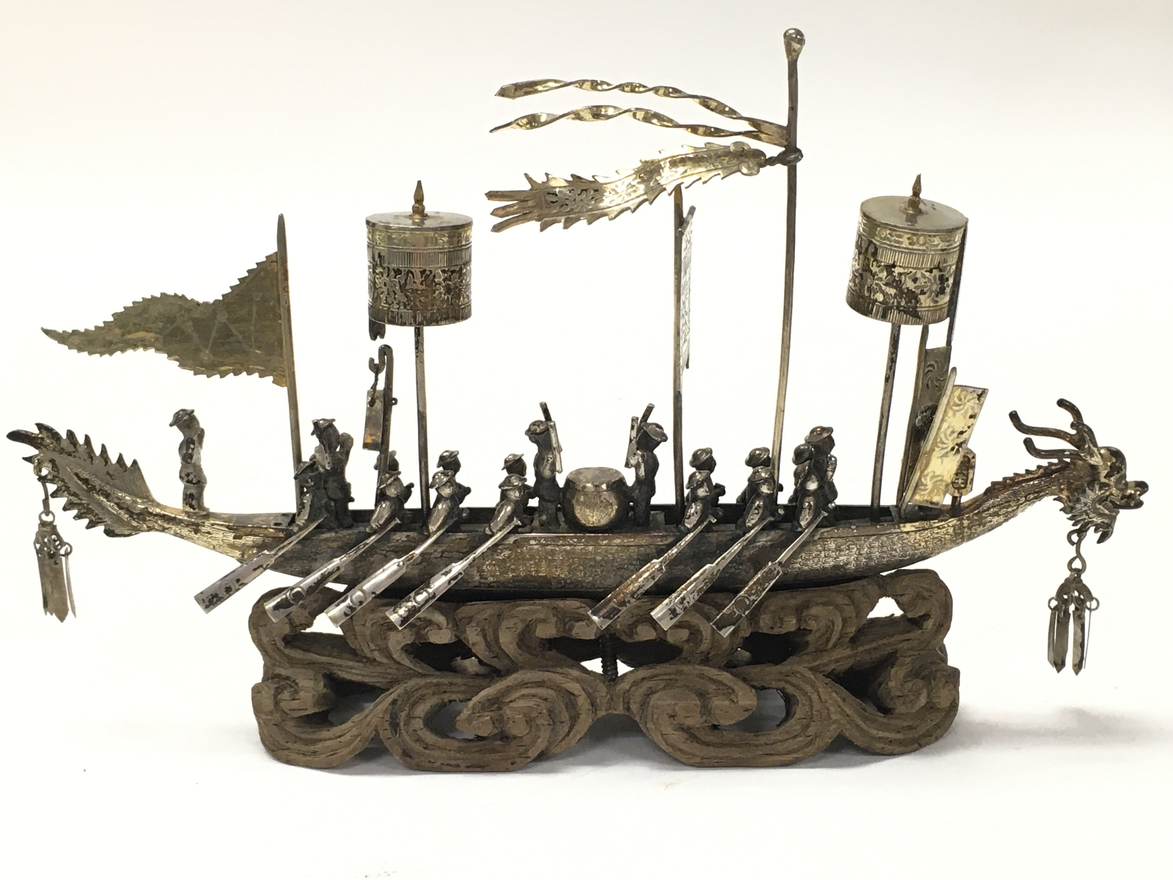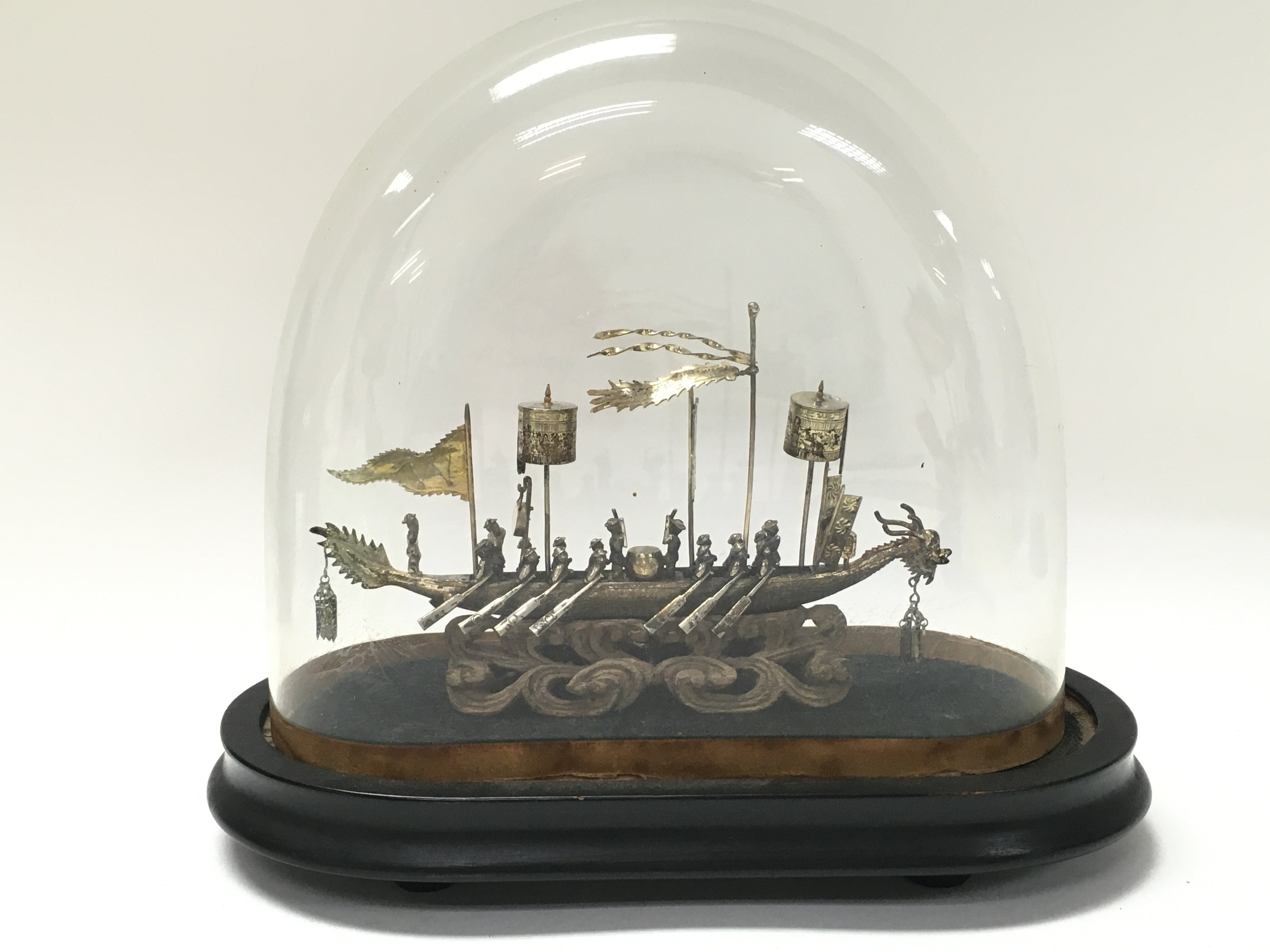 A Chinese silver boat under a glass dome. 9cm tall 15cm wide. Dome 17cm tall. This lot cannot be posted