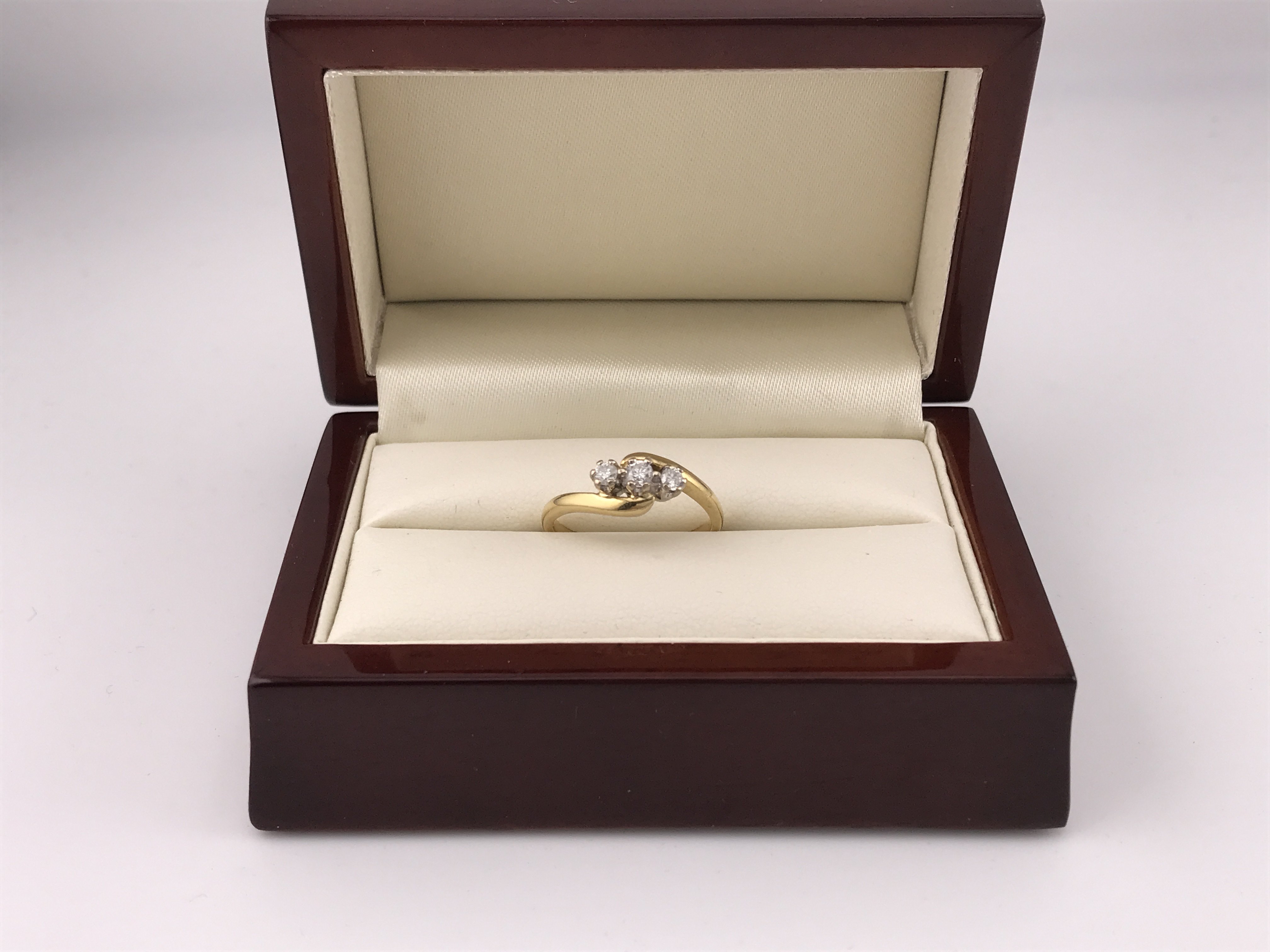 A three stone 18ct diamond ring, approx weight 3.7 grams. Approx ring size N 1/2.
