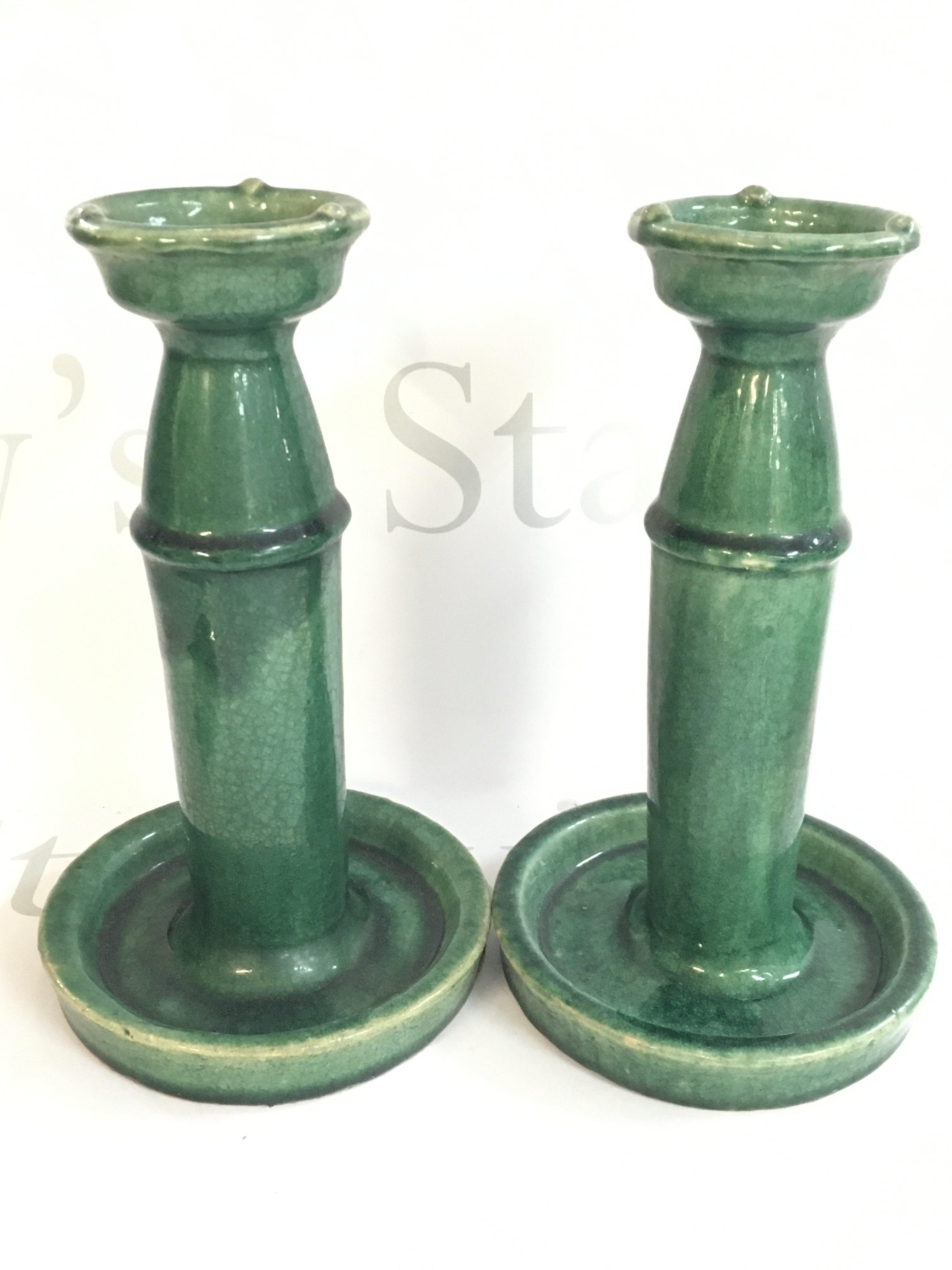 A pair of Chinese green glazed oil lamps, 24cm tall. This lot cannot be posted. NO RESERVE