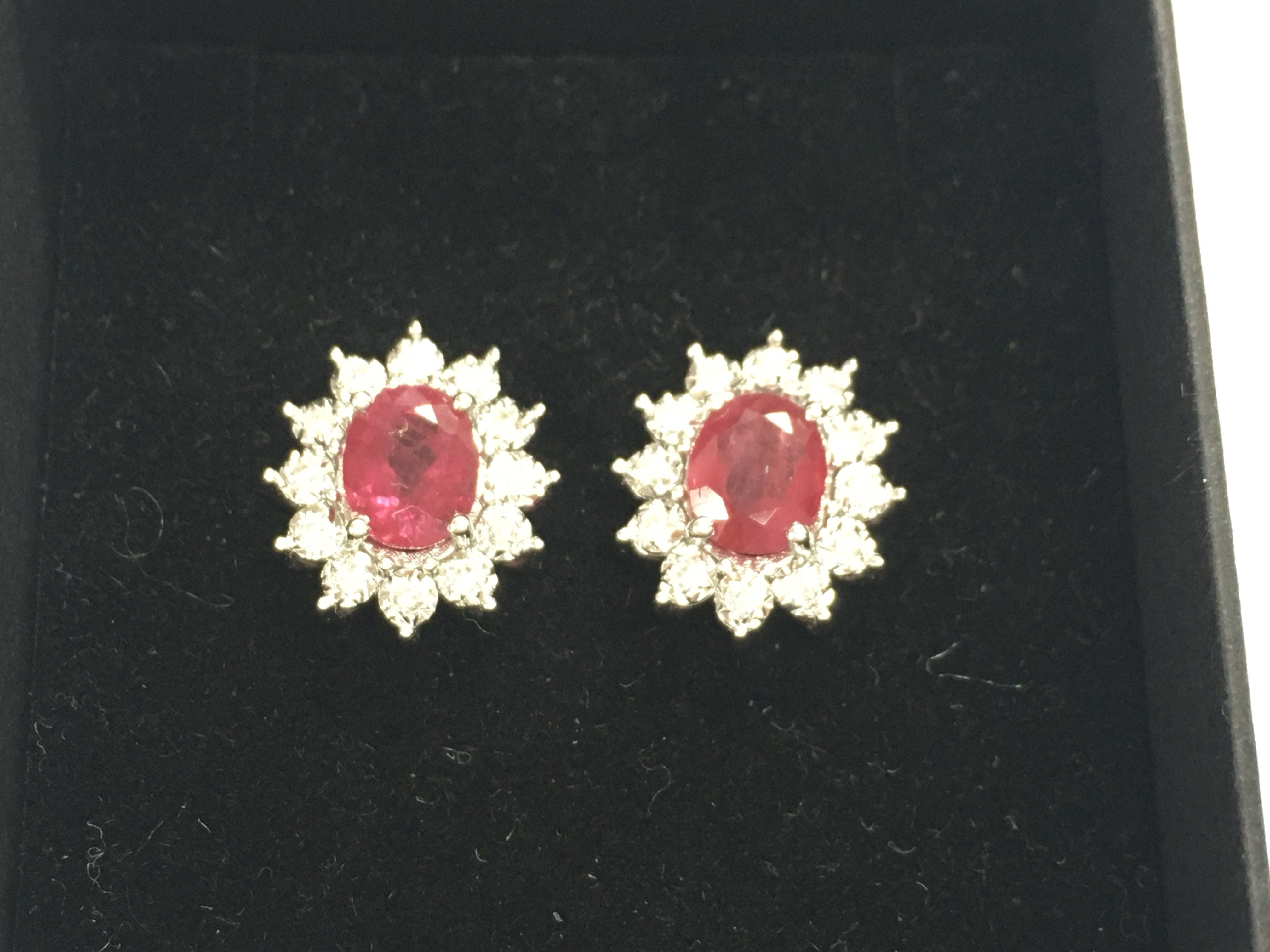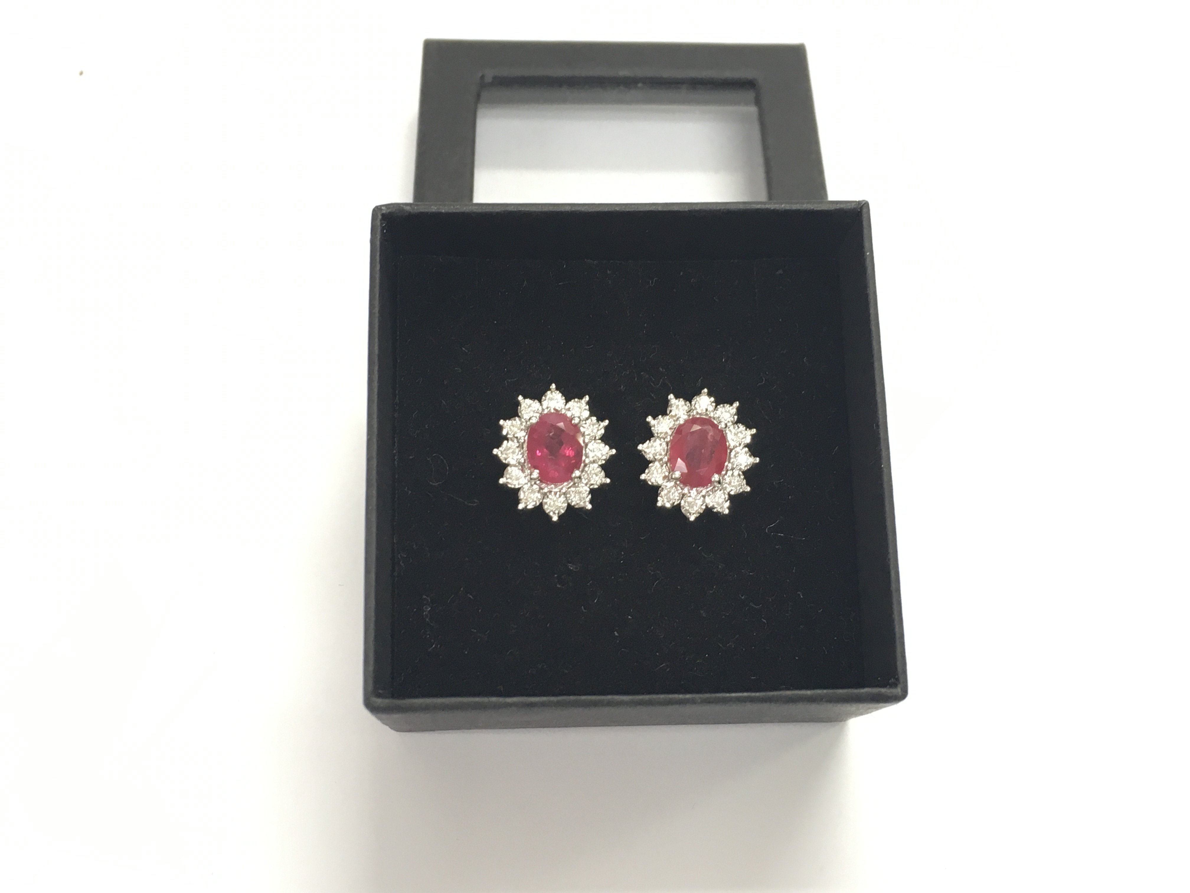Pair of 18ct white gold oval ruby and diamond studs. Approximately 2.27ct rubies and 0.21ct diamonds. Postage B