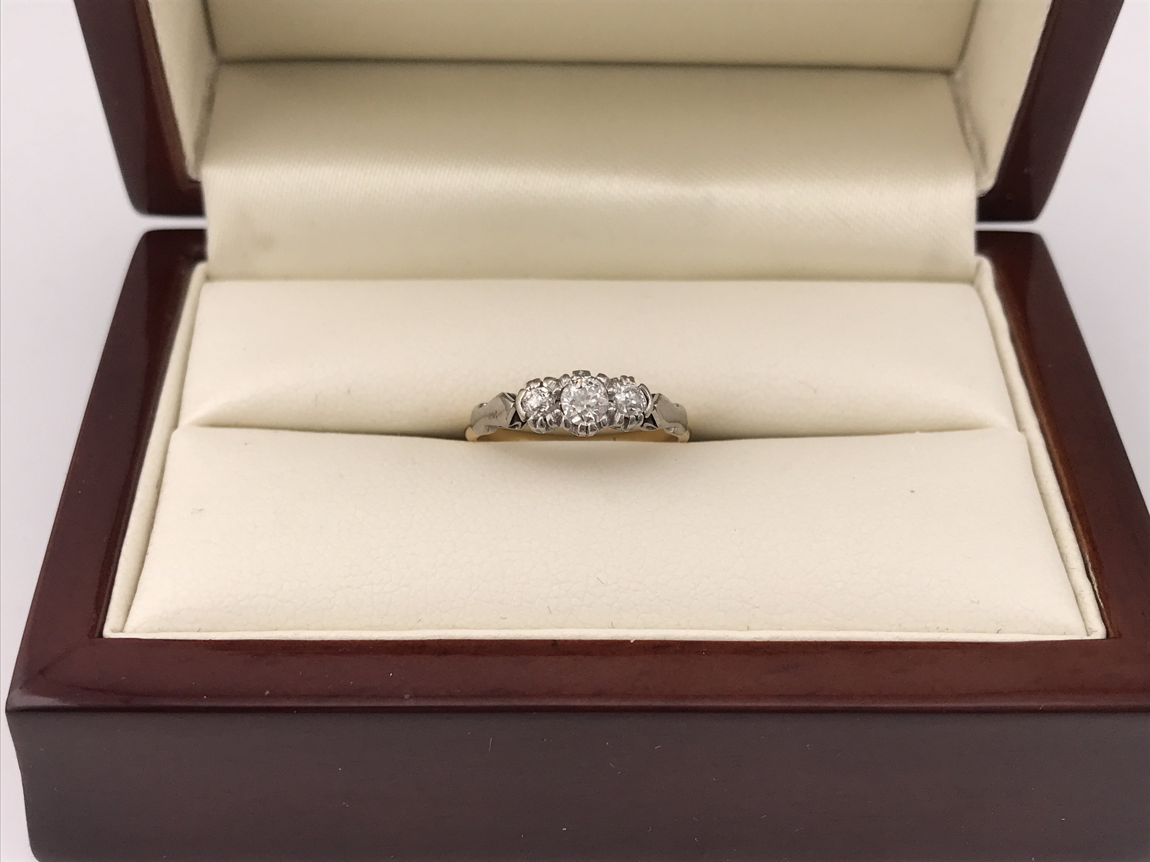 An 18ct three stone old cut diamond ring. Approx 2.2 grams. Size J.