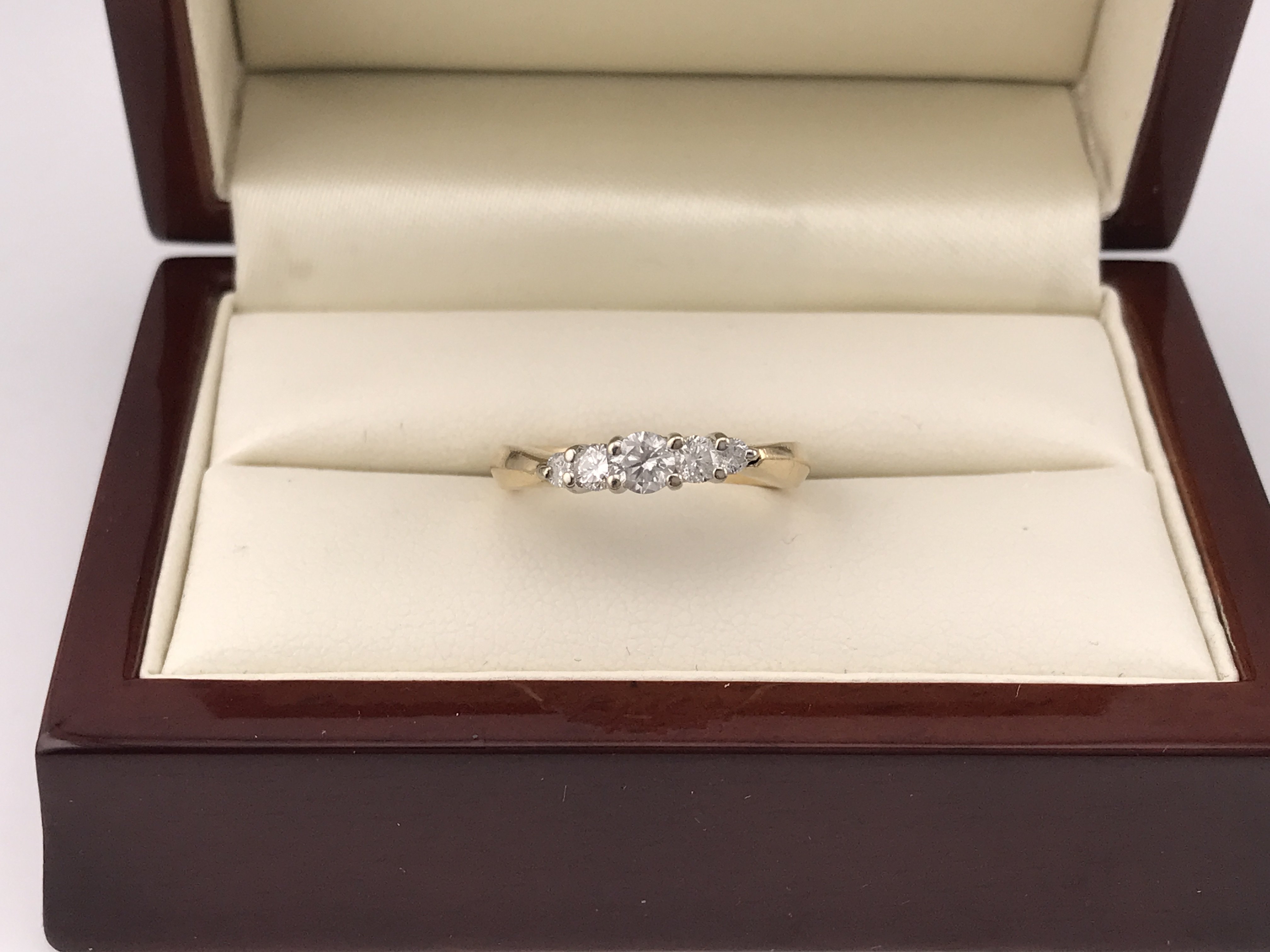 A 14ct gold five stone graduating diamond ring. Approx weight 4 grams, Approx size N.