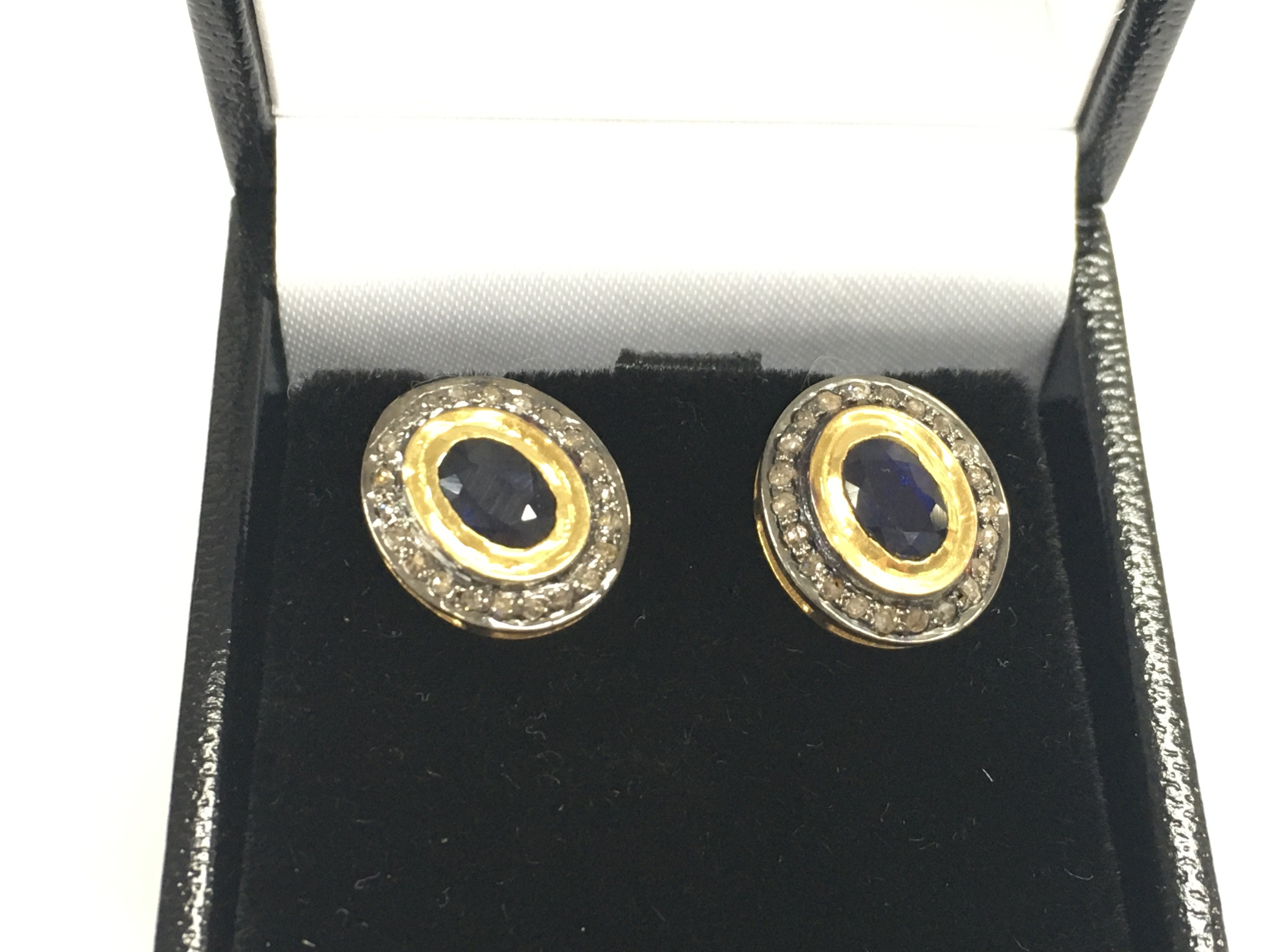 Pair of oval sapphire and diamond halo studs in gold plated silver. Sapphires 0.45ct and 0.25ct diamonds approximately. Postage A