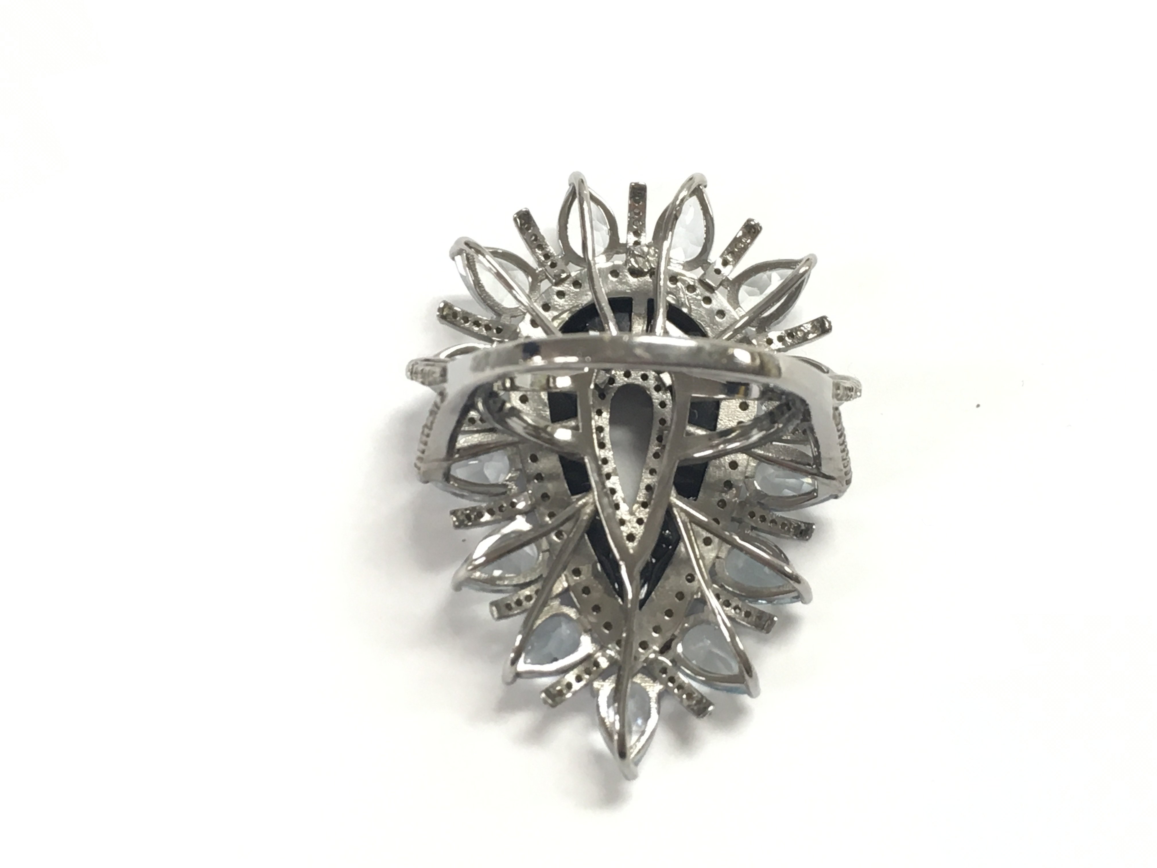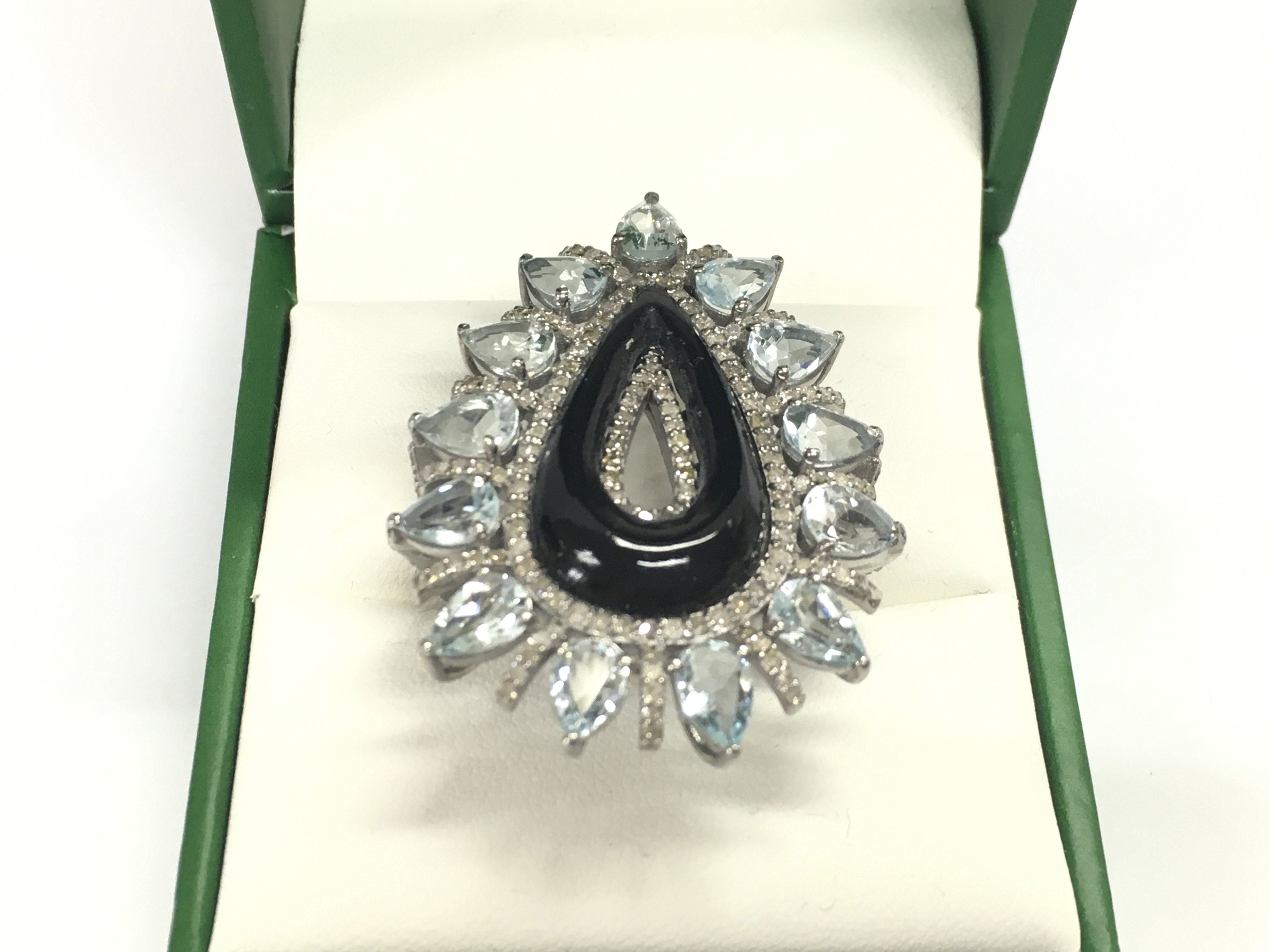 Large pear shaped silver dress ring set with pear shaped onyx pear shaped aquamarine and diamonds. Onyx 4ct aquamarine 4.93ct and diamonds 0.95ct approximately. Postage B