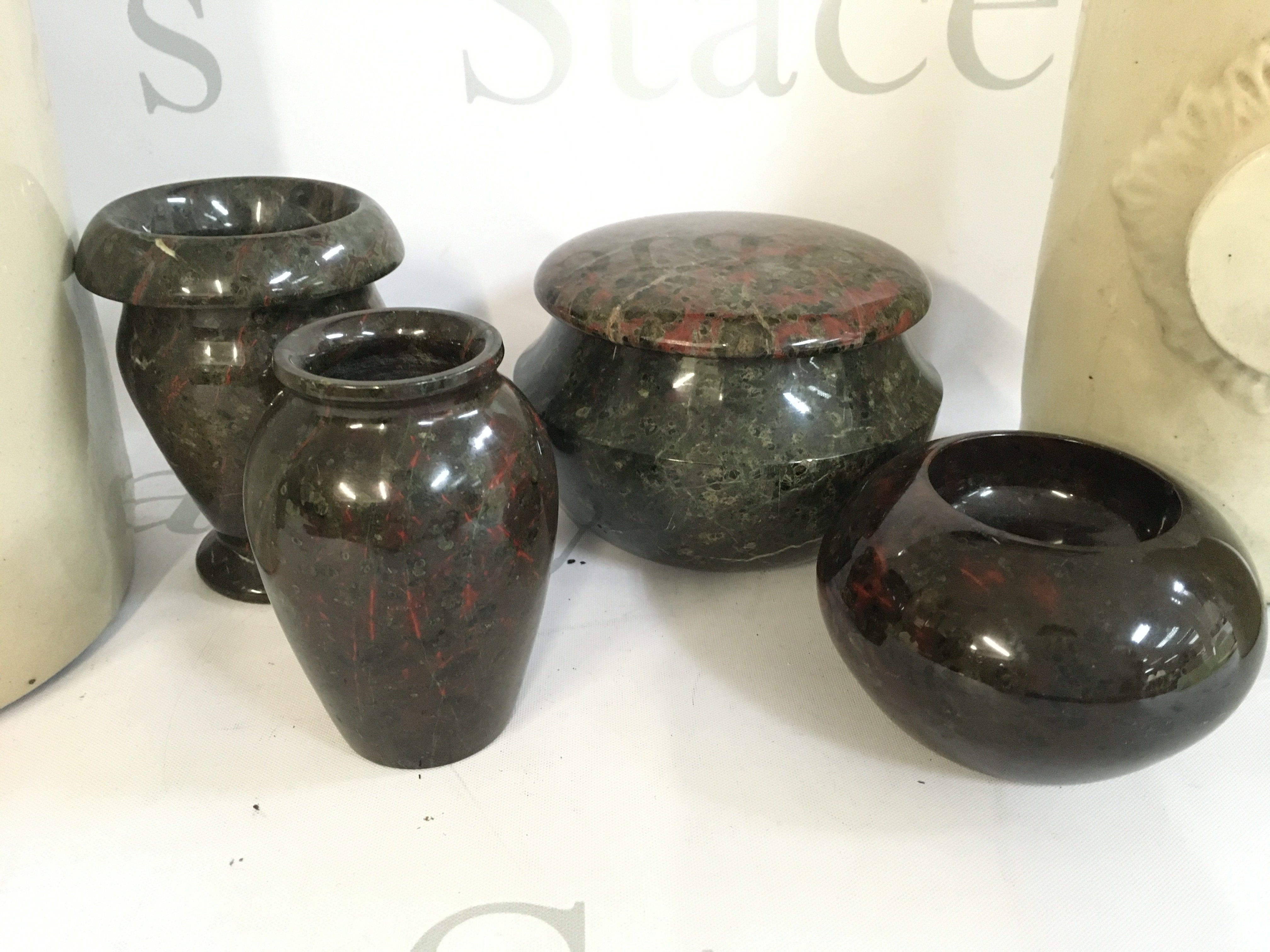 A Collection of Cornish art glass serpentine vases and stoneware bottles. This lot cannot be posted. NO RESERVE