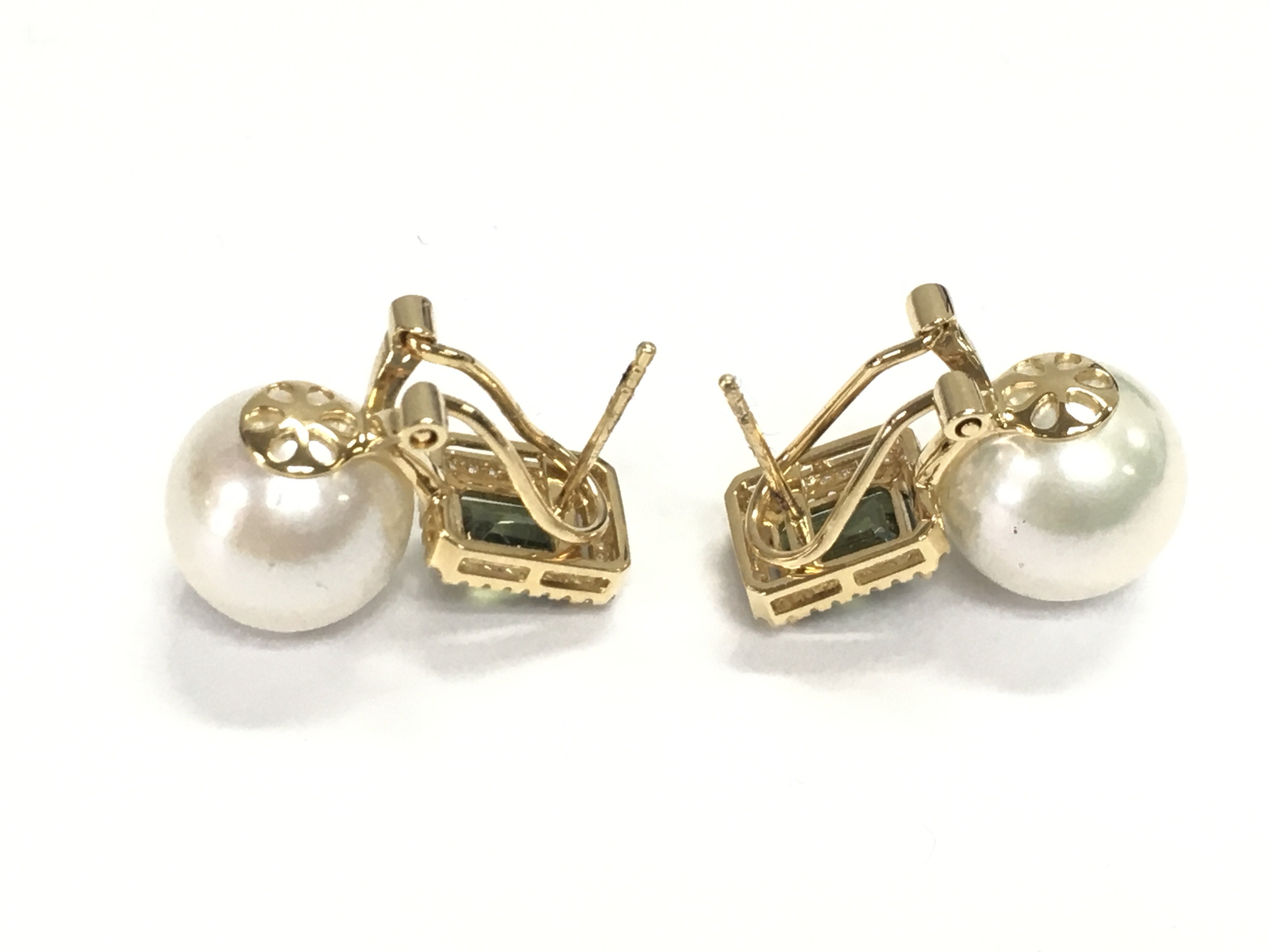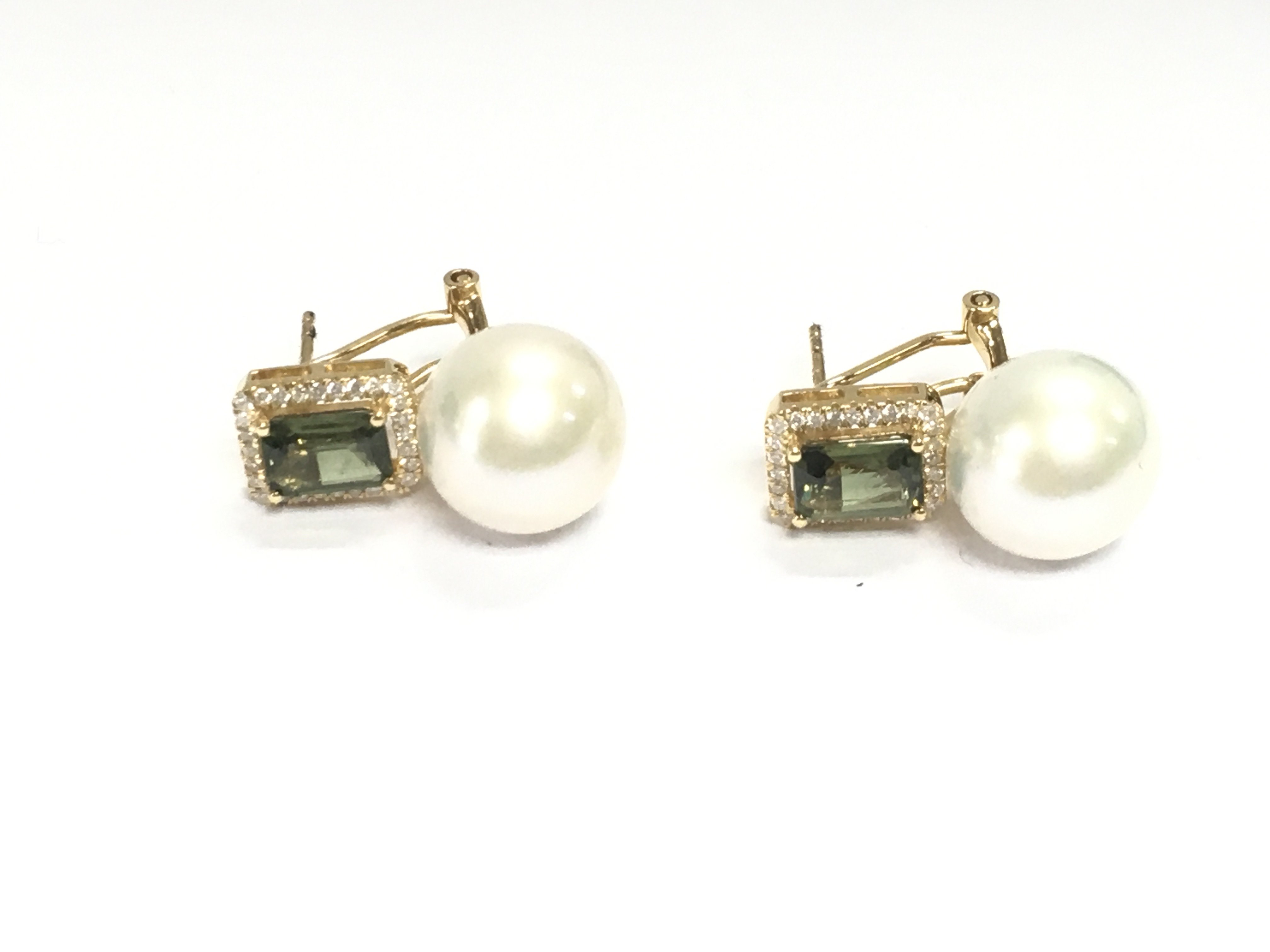 Pair of 18ct gold earnings set with tourmaline's diamonds and large pearls. Postage A