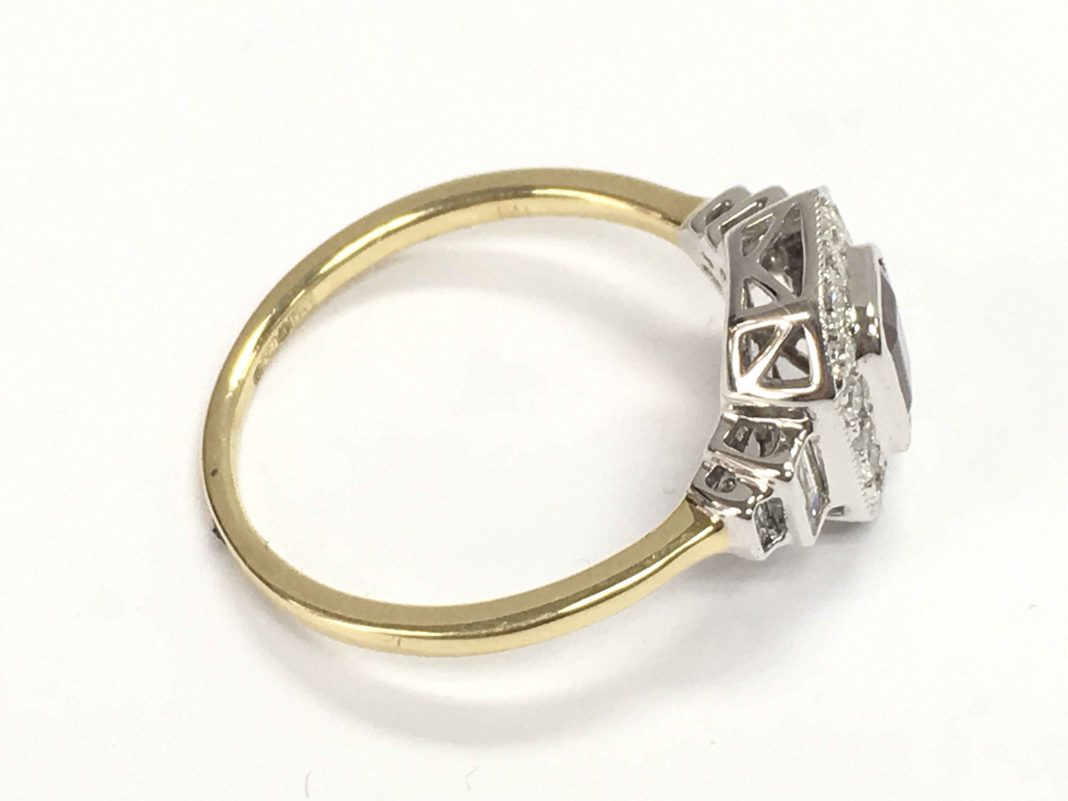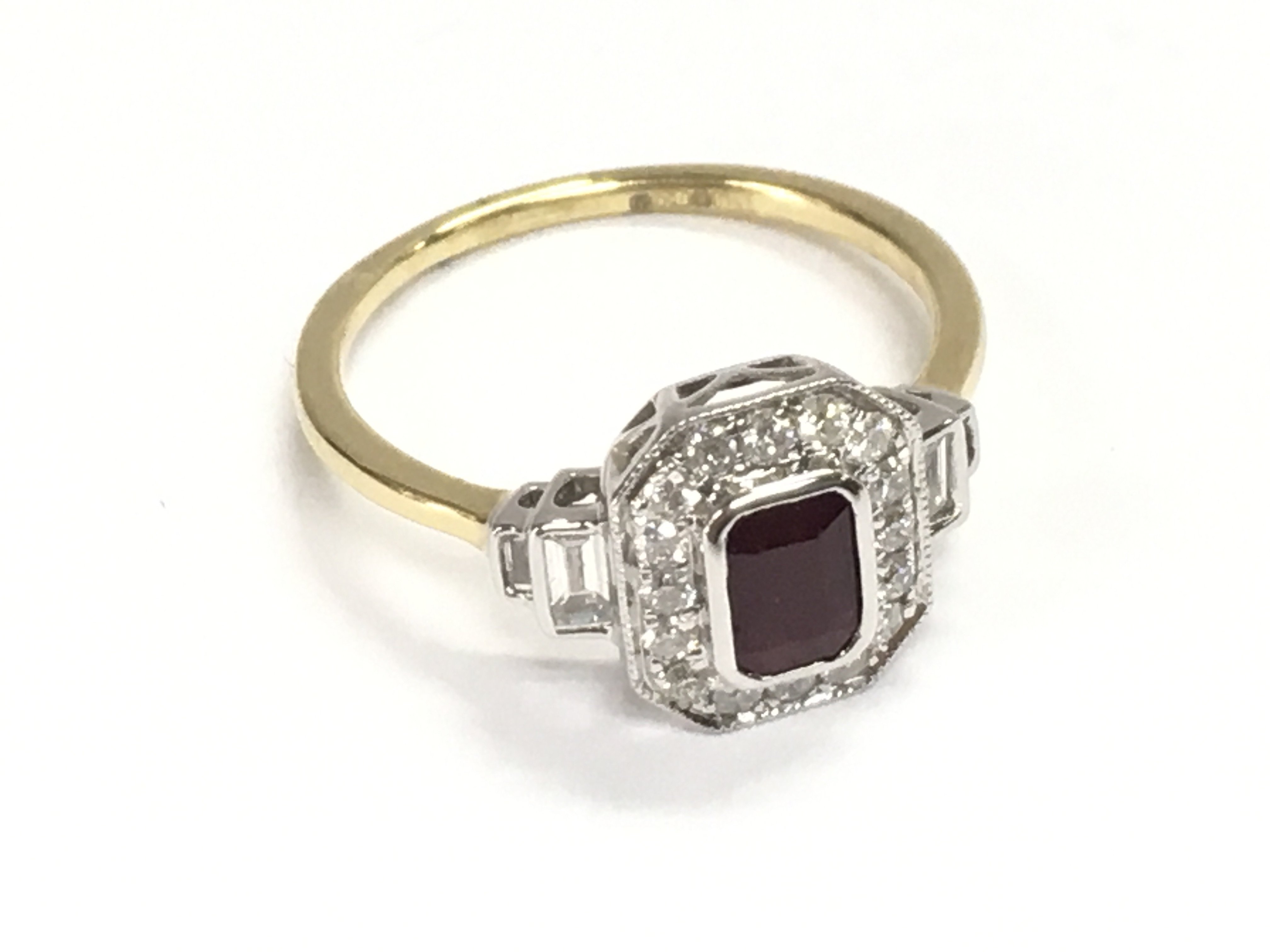 18ct white and yellow gold art deco style ring set with step cut ruby surrounded by diamonds. Ruby 0.60ct diamonds 0.41ct. Size O Postage A