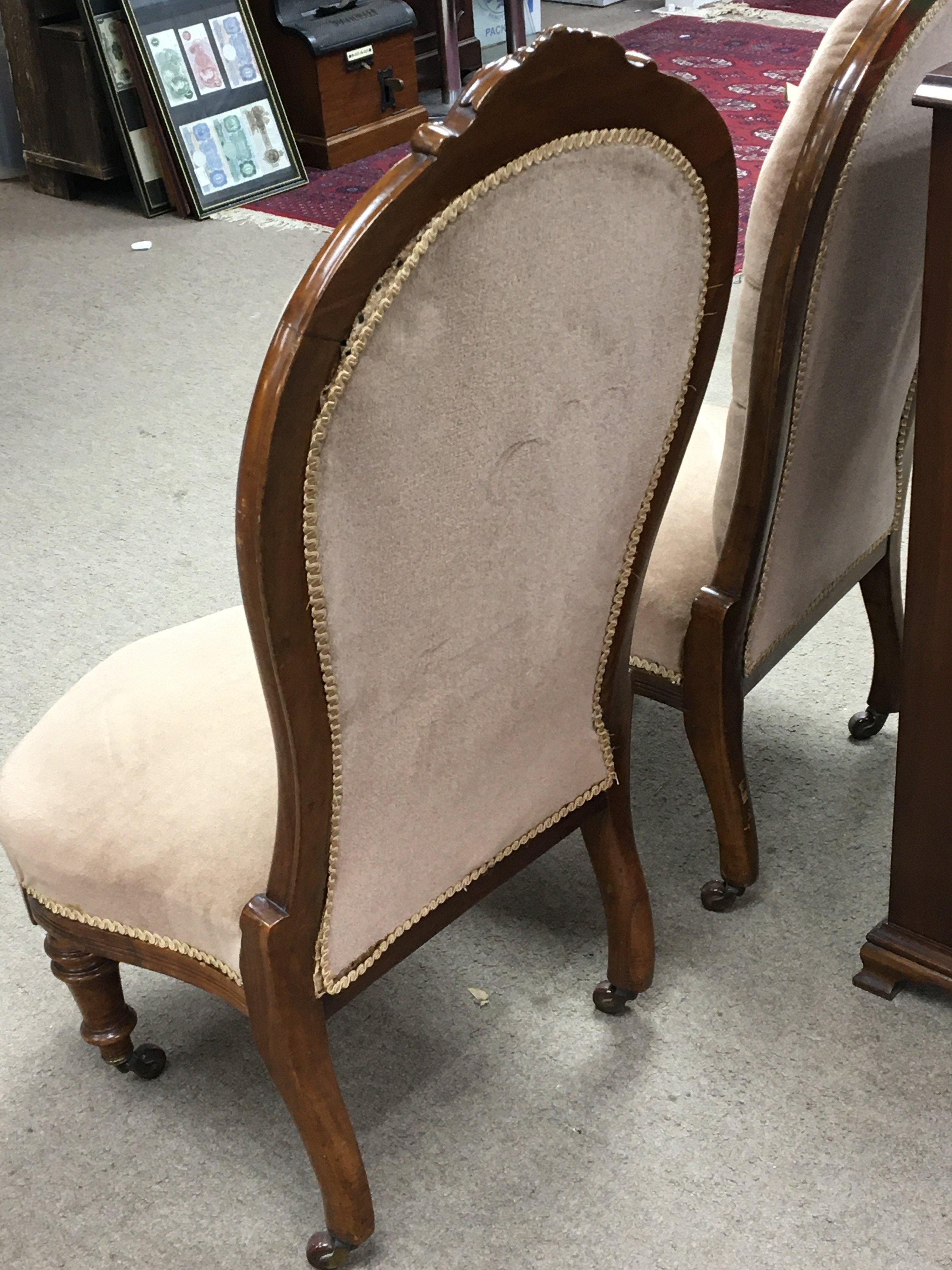 A pair of Victorian walnut occasional chairs with carved top rails and button down upholstery. Good condition. (2) NO RESERVE
