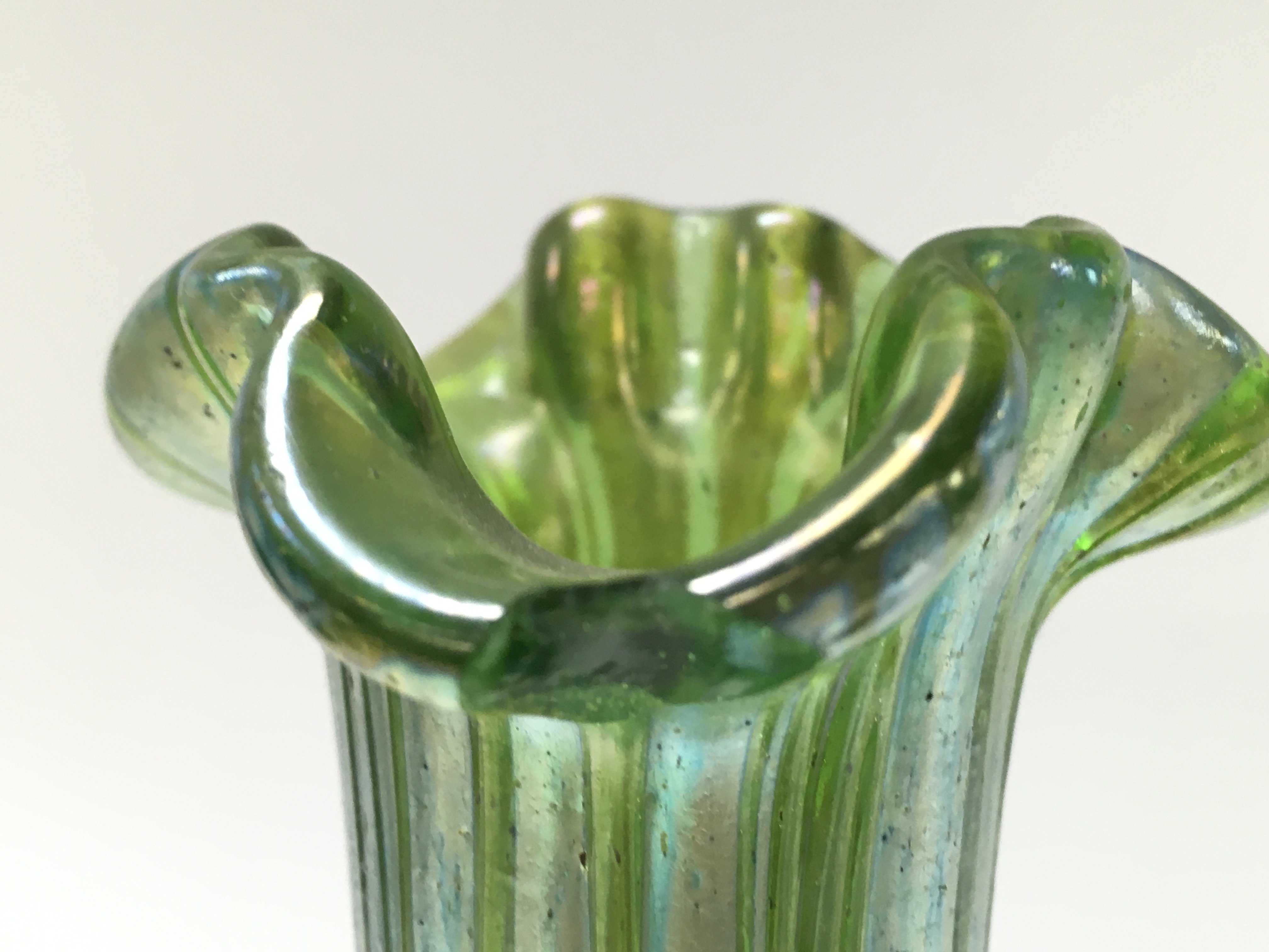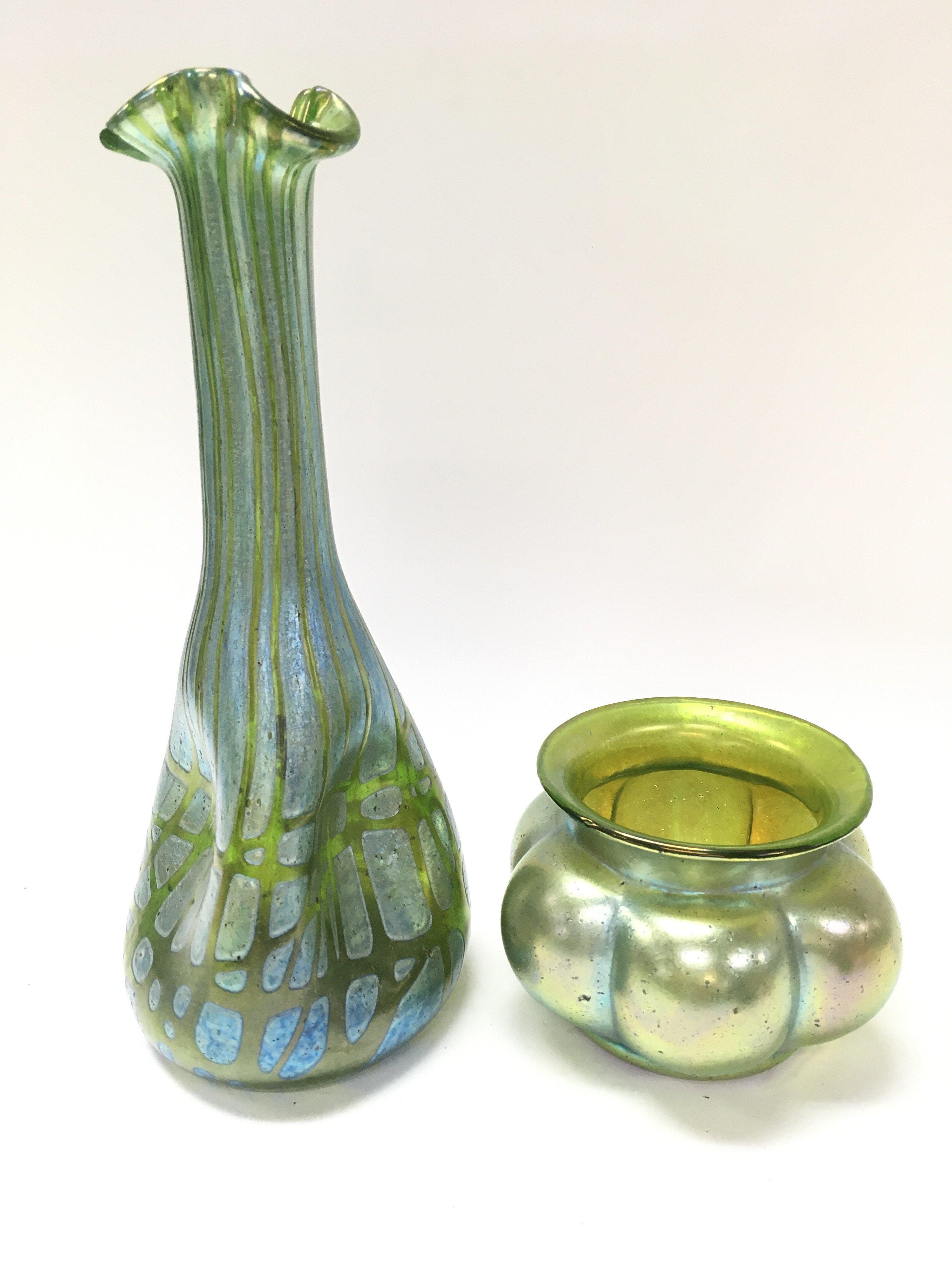 Two Art Nouveau style green and blue coloured glass vases 8 and 25cm tall. Taller glass chipped. This lot cannot be posted