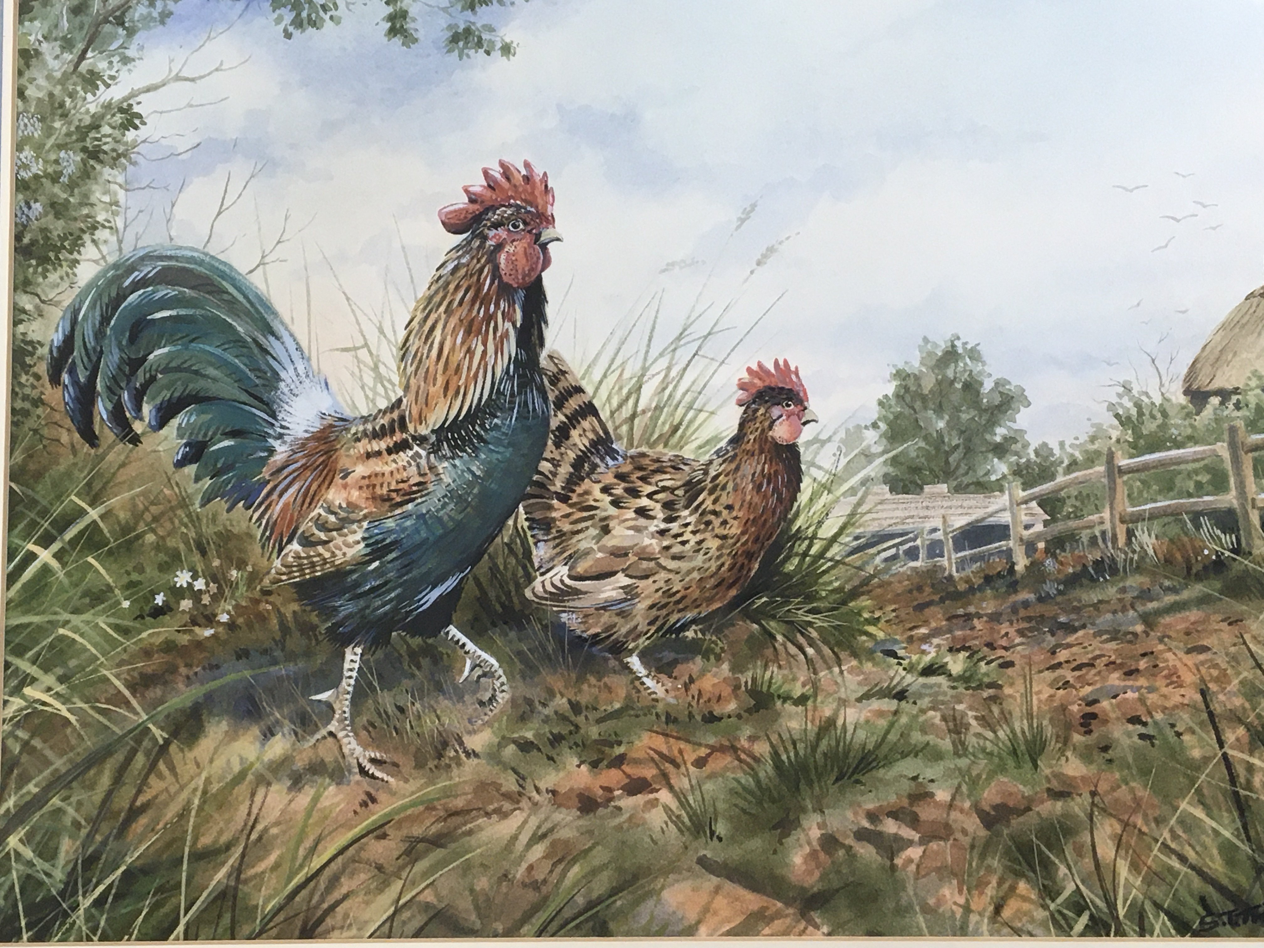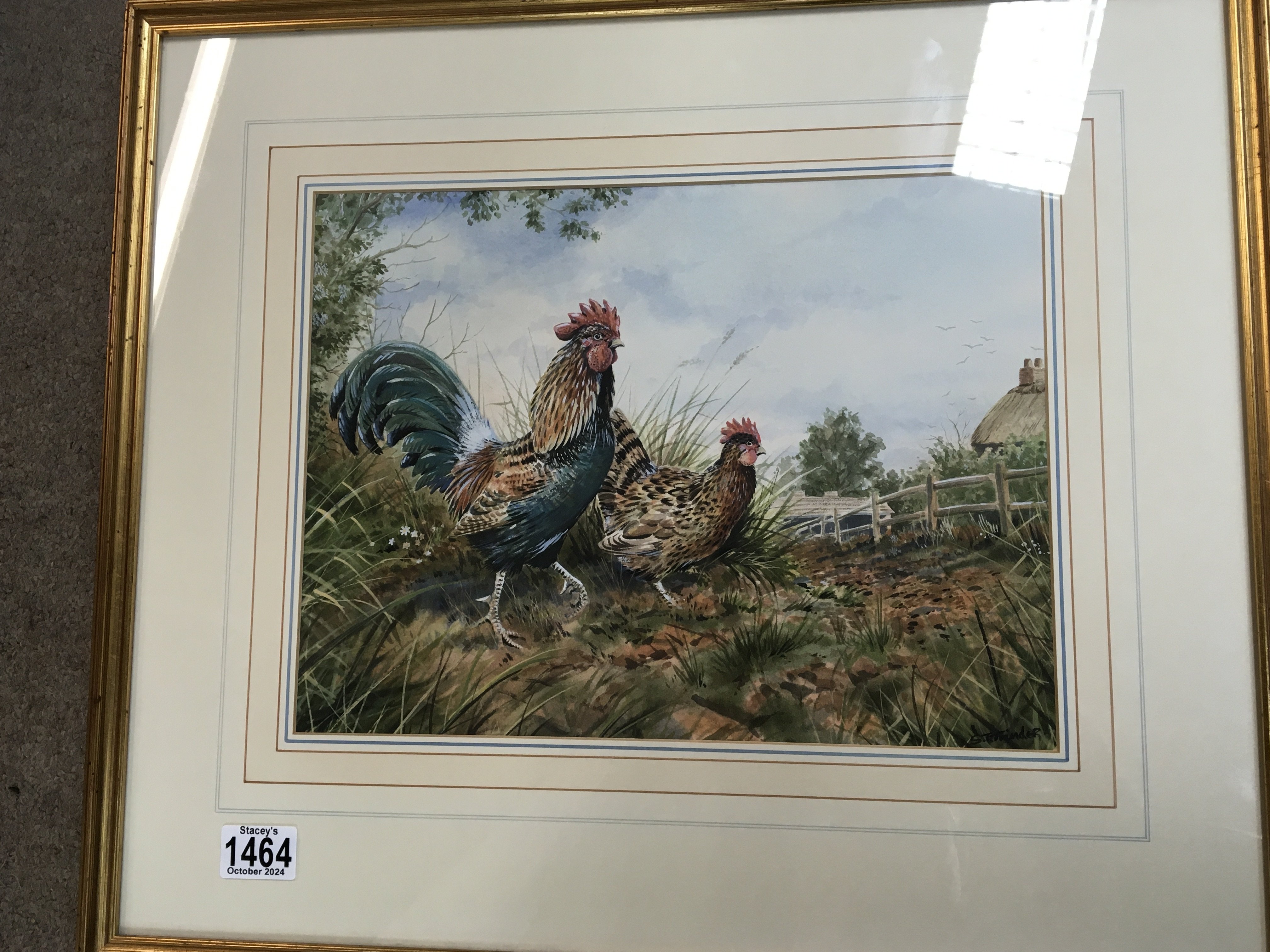 A framed watercolour study of a cockerel and hen signed by S Tinder. 57x49cm NO RESERVE