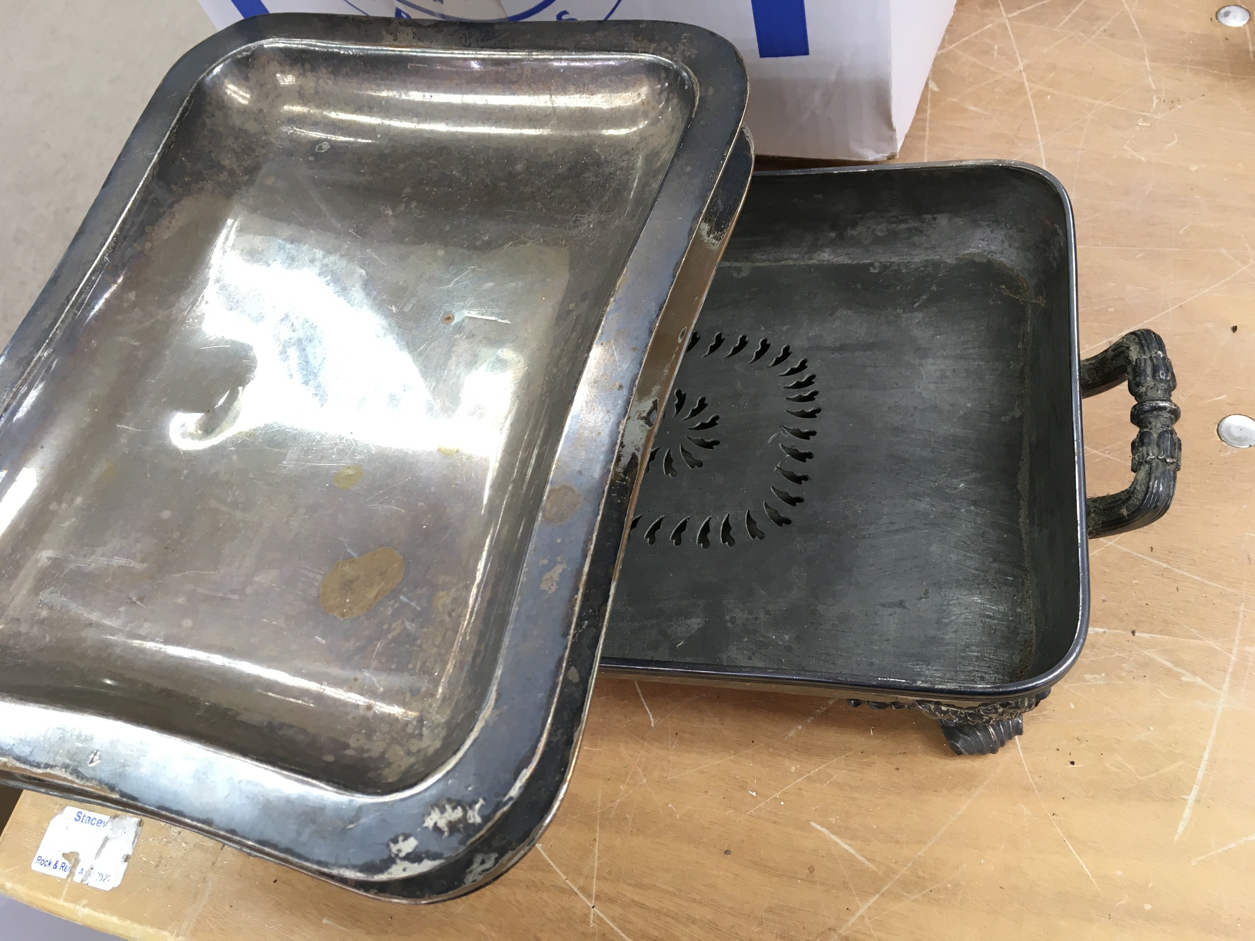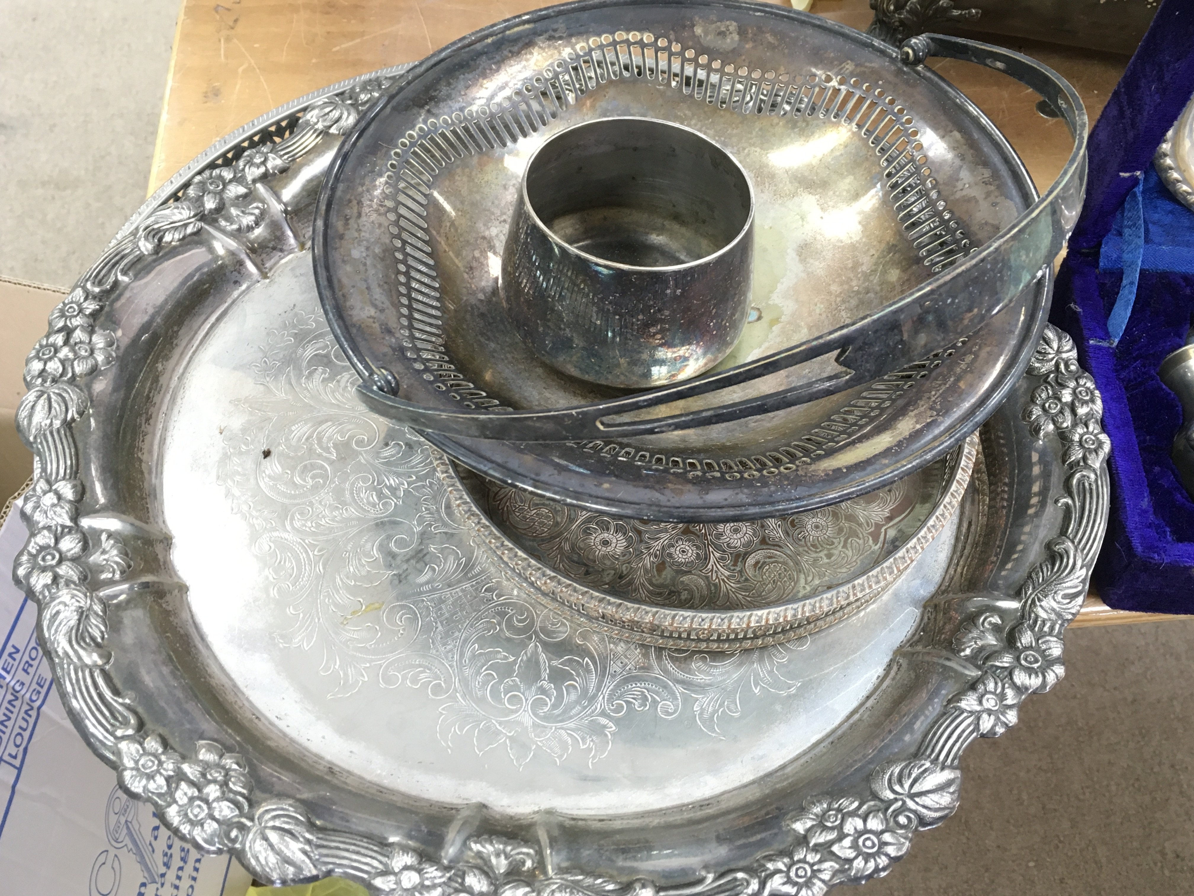 A large box of assorted silver plate and other metal items. NO RESERVE