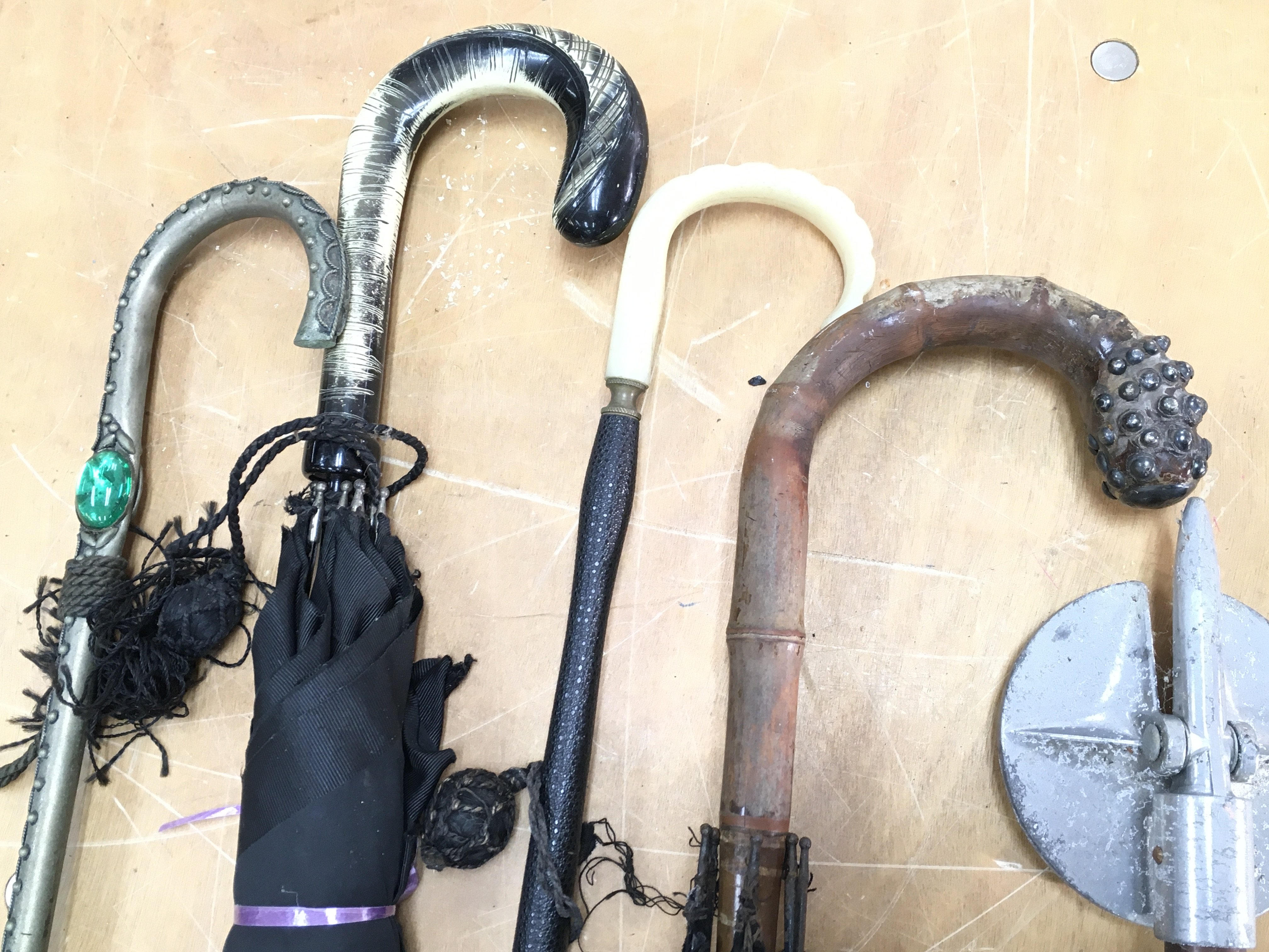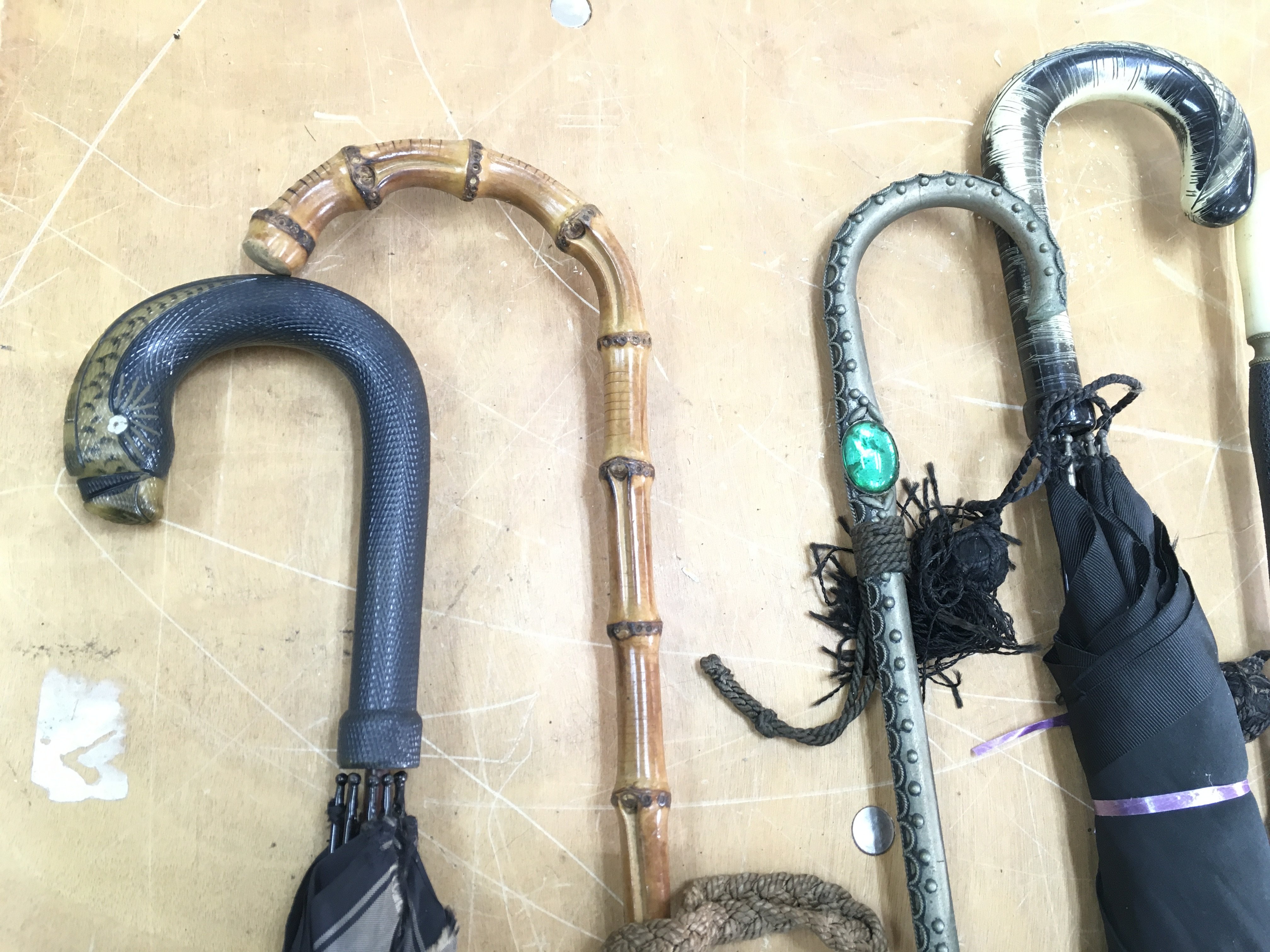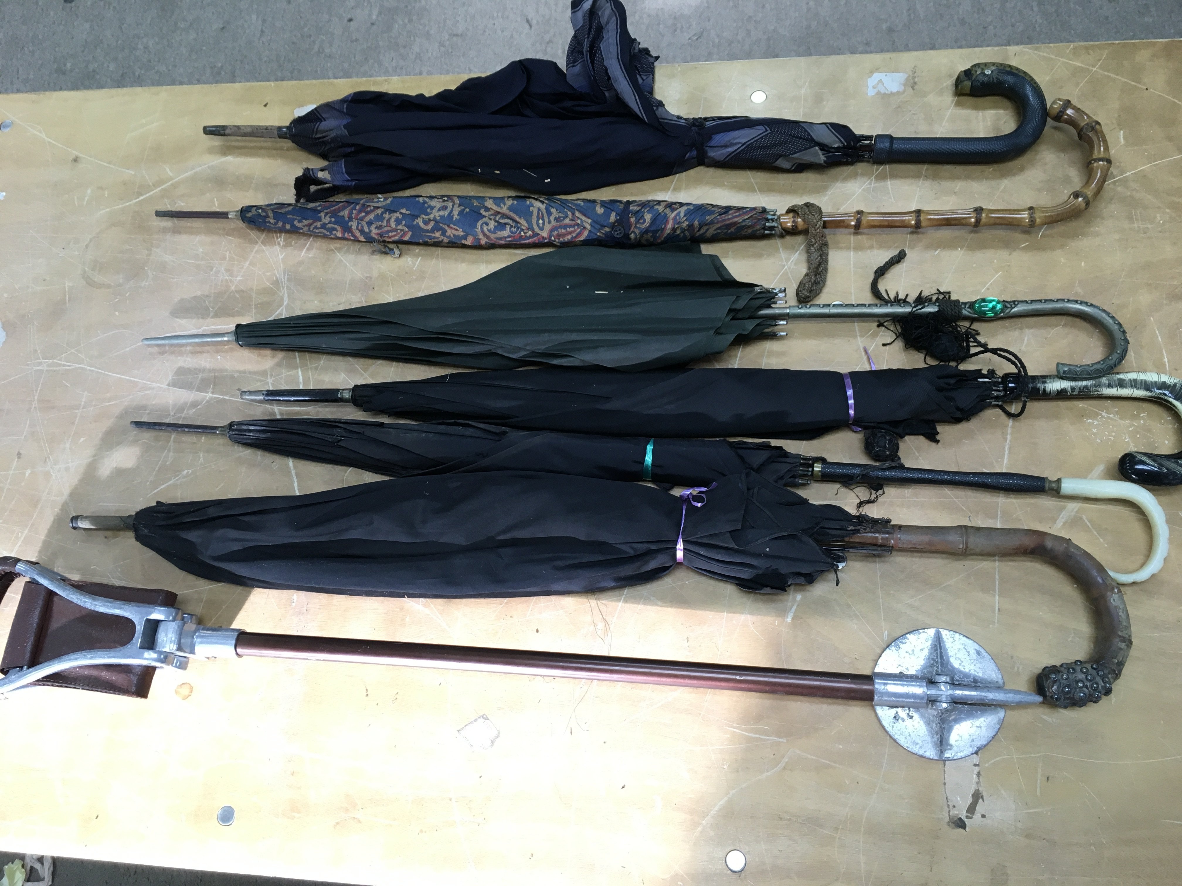 A collection of vintage umbrellas and a seat stick. Postage D. NO RESERVE