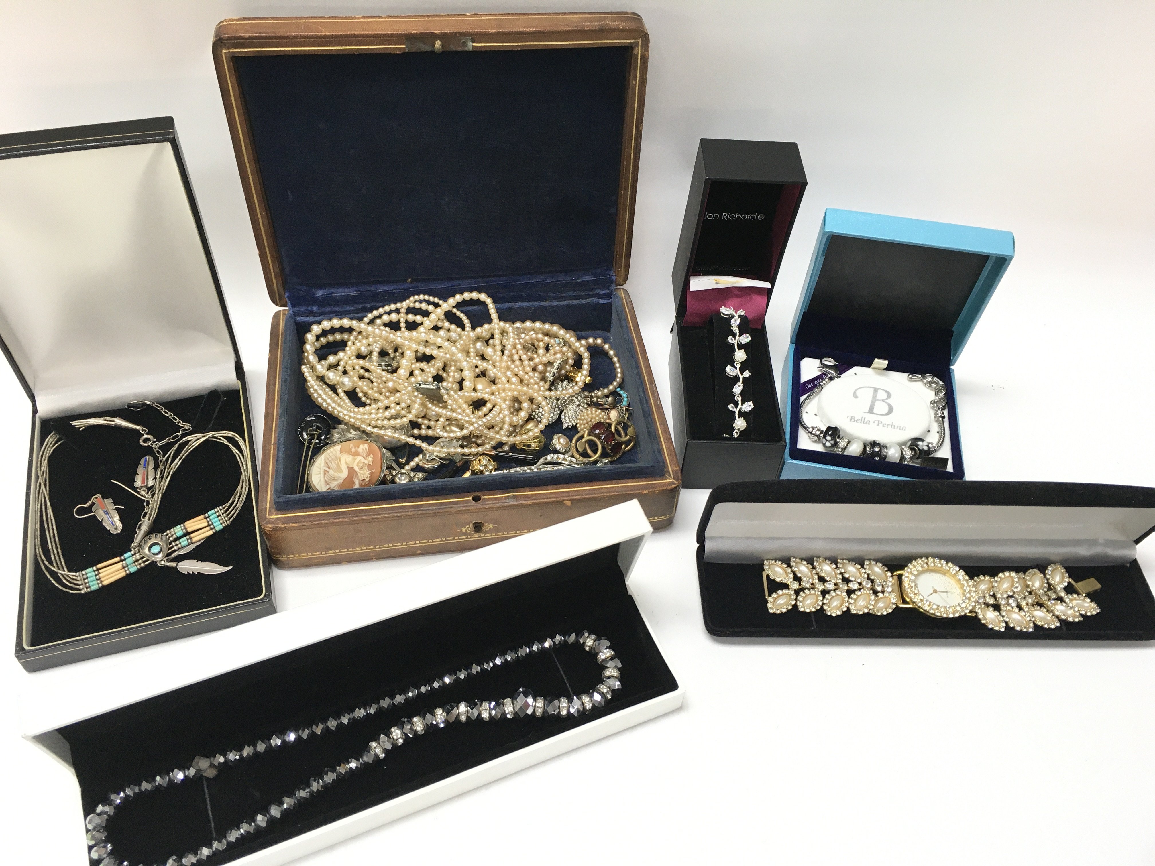 A Collection of costume jewellery including necklaces, brooches, bracelets. Postage category B