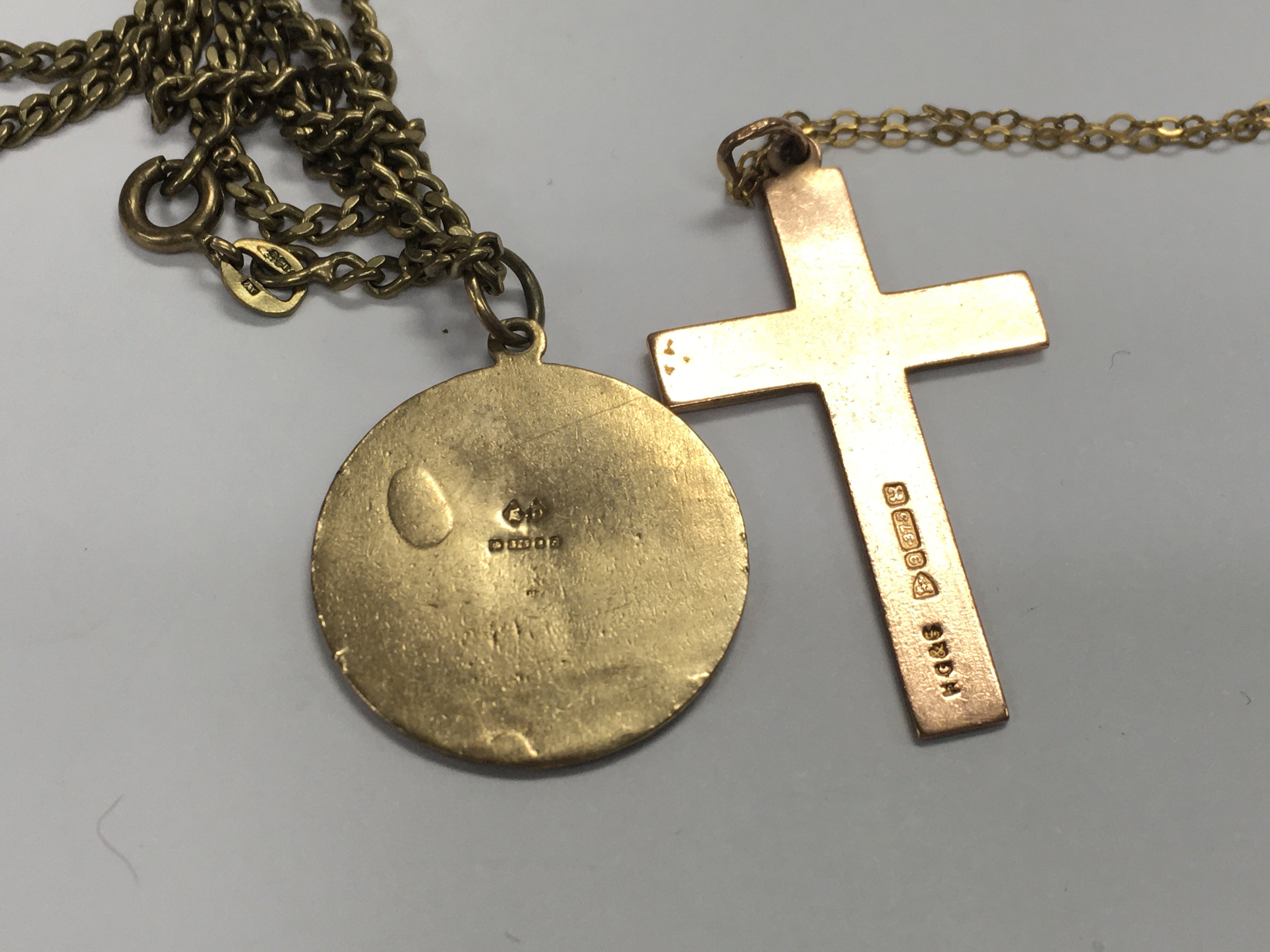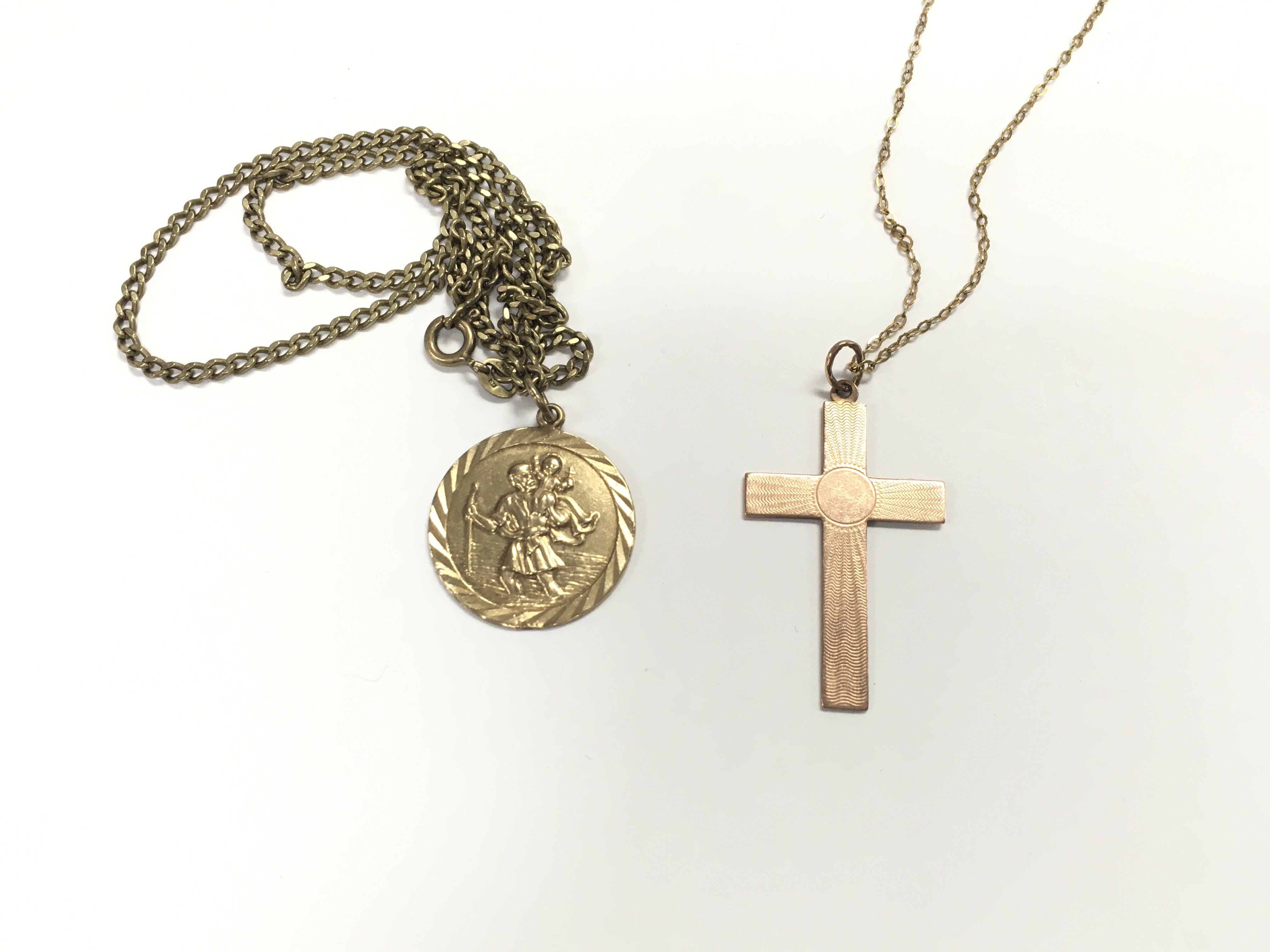 A 9ct gold cross on 9ct chain and a 9ct gold st Christopher with gold chain. 15.37g total. Postage B