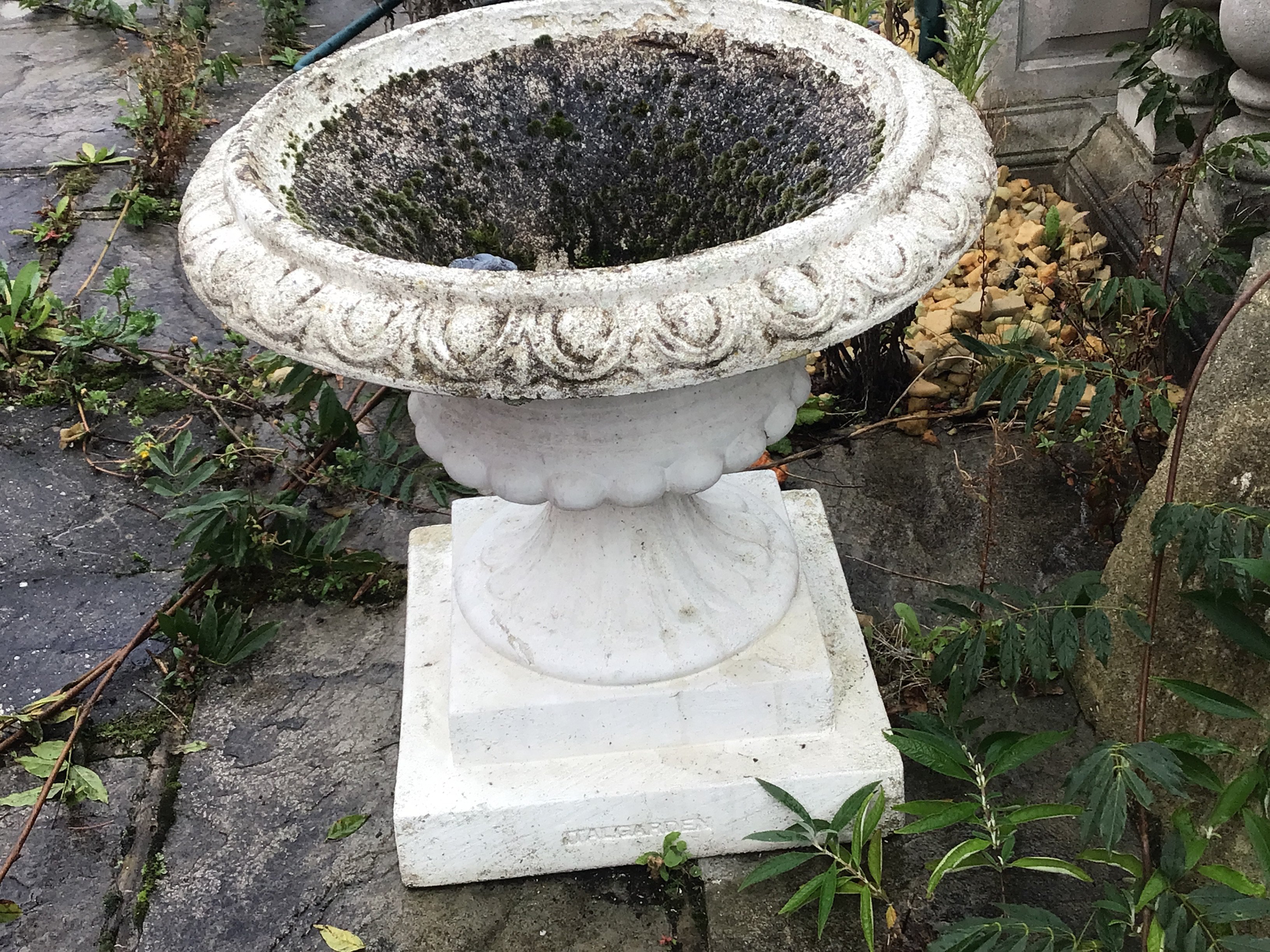 a set of four composition, concrete, neoclassical garden, earns in good condition freestanding. Height 60cm sold in situ buyer to collect.