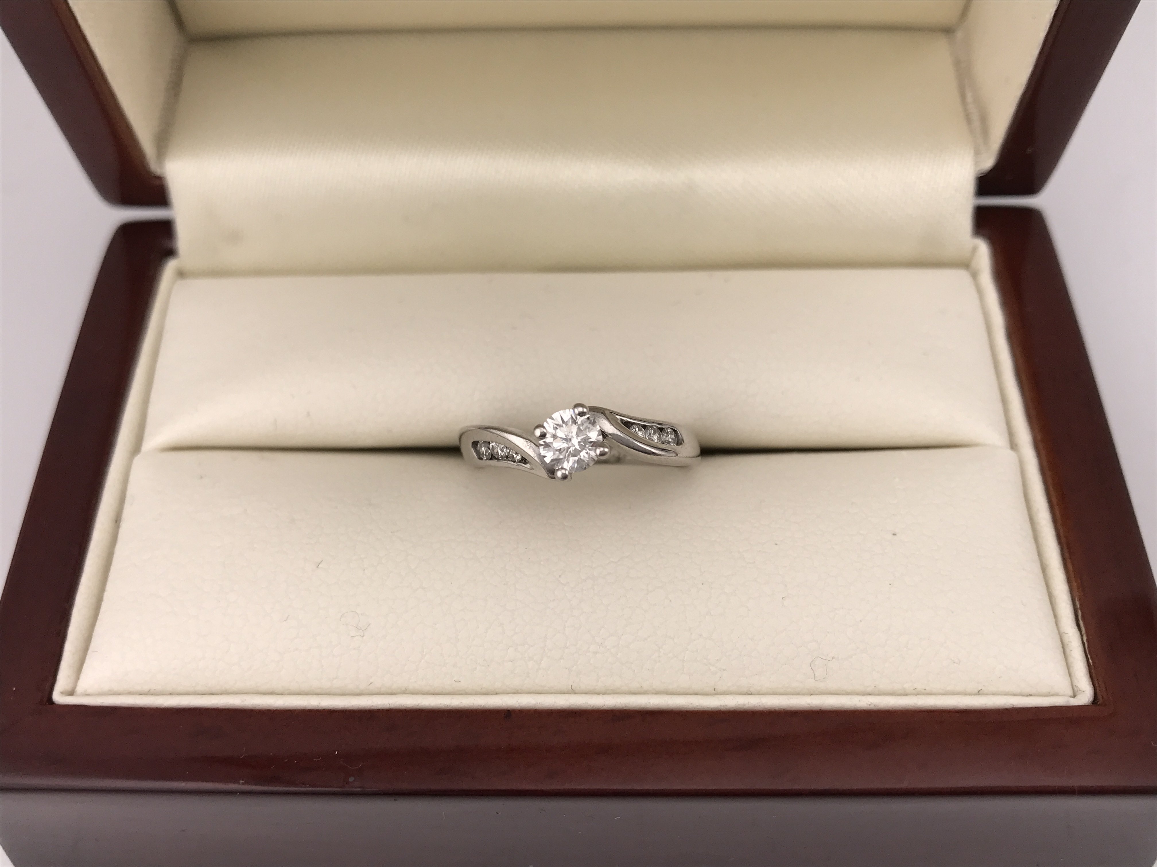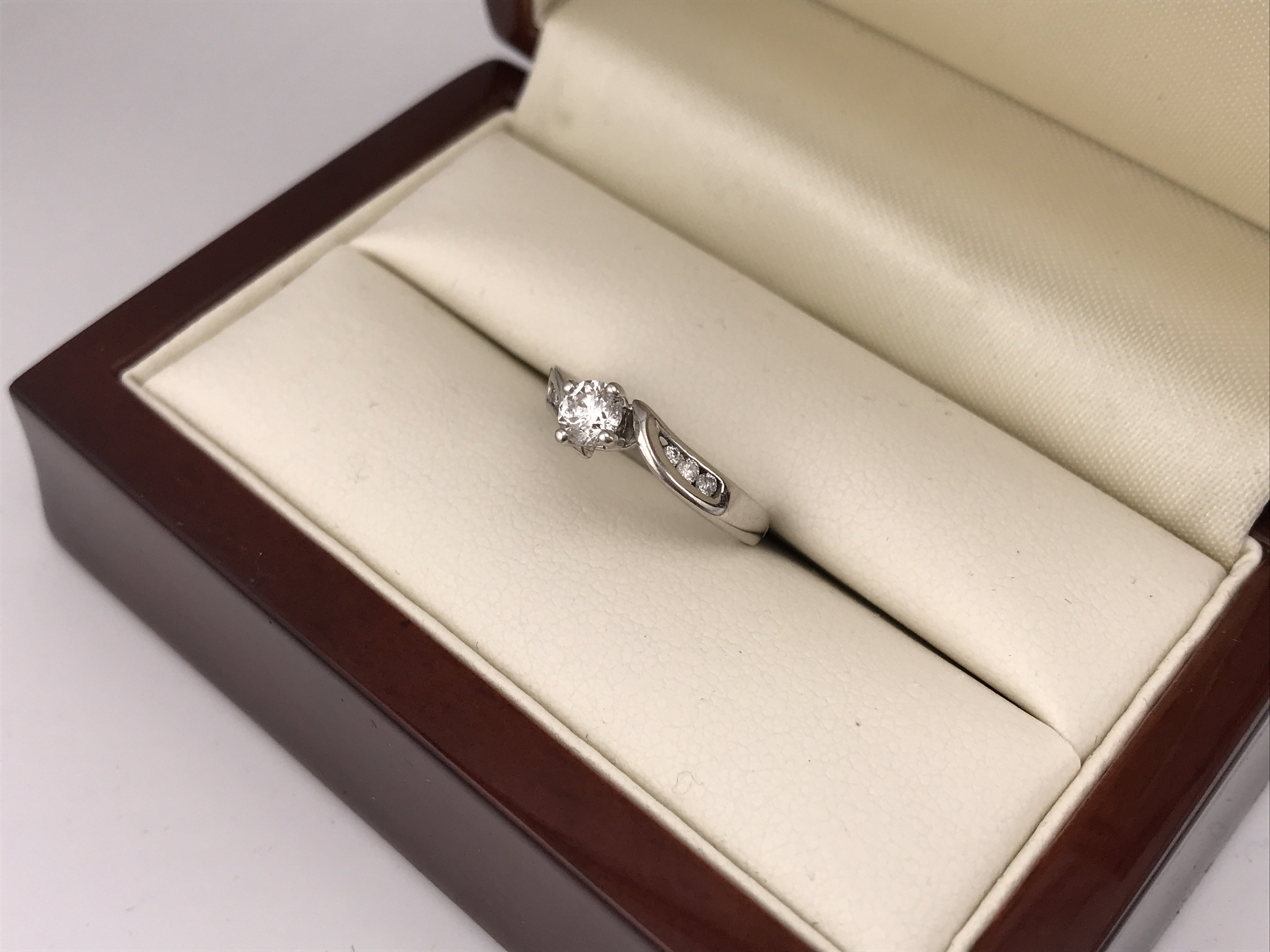An 18ct white gold diamond set solitaire ring with diamonds set in the shoulders.