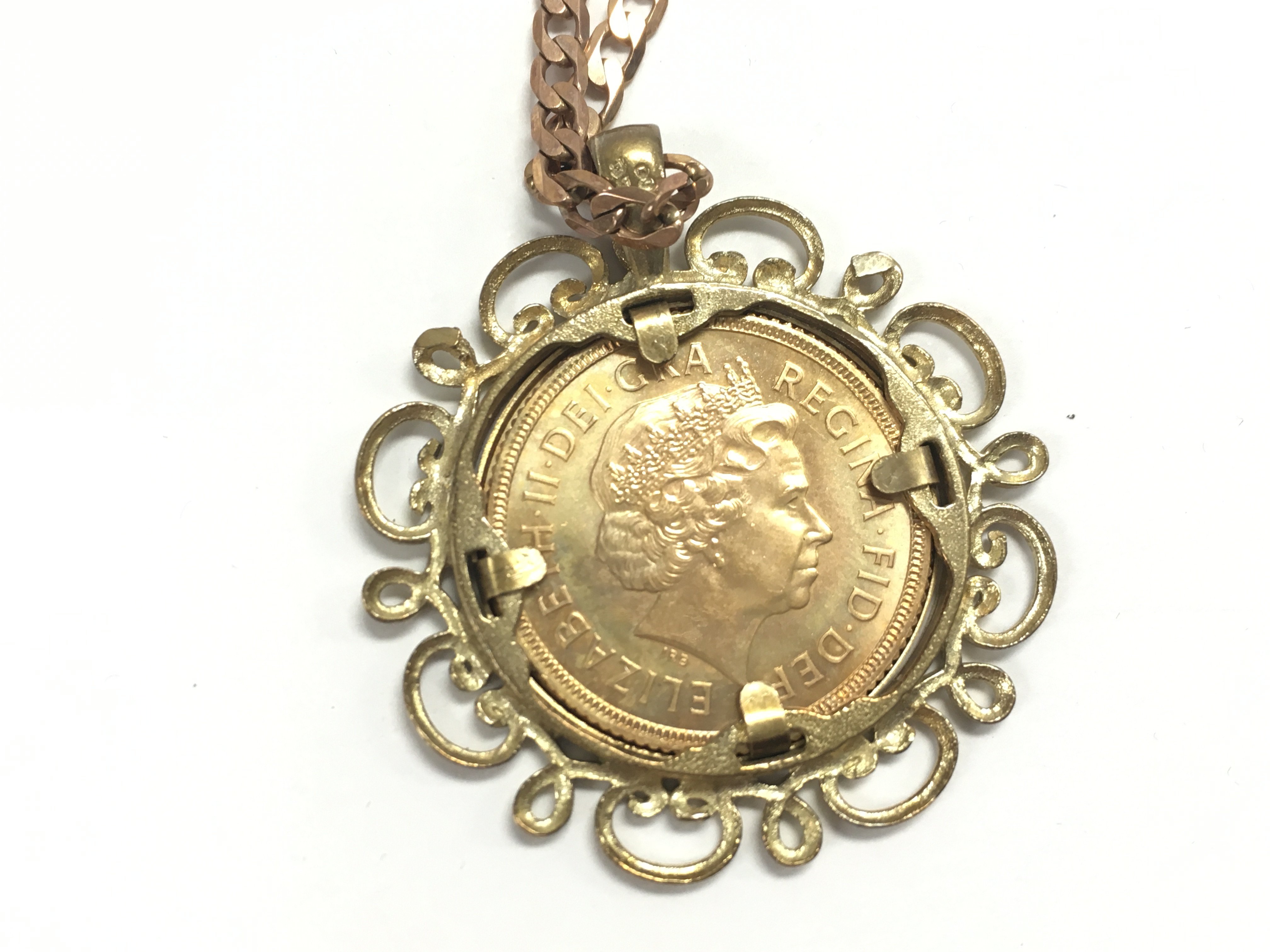 A 2002 full sovereign in mount with a 9ct rose gold chain. 18.64g Postage B